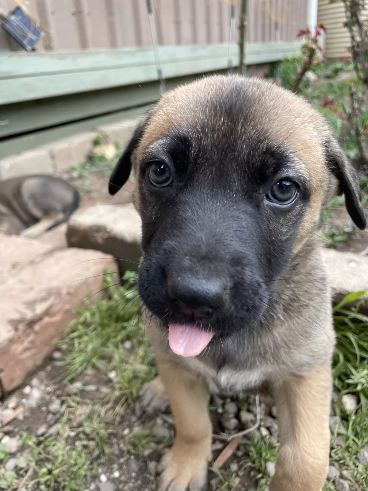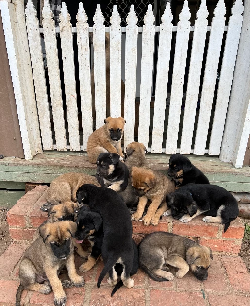The father is a purebred German Shepherd, while the mother is a cross between Staffy, Mastiff, and Ridgeback — both parents have calm, gentle temperaments and are wonderful family dogs.