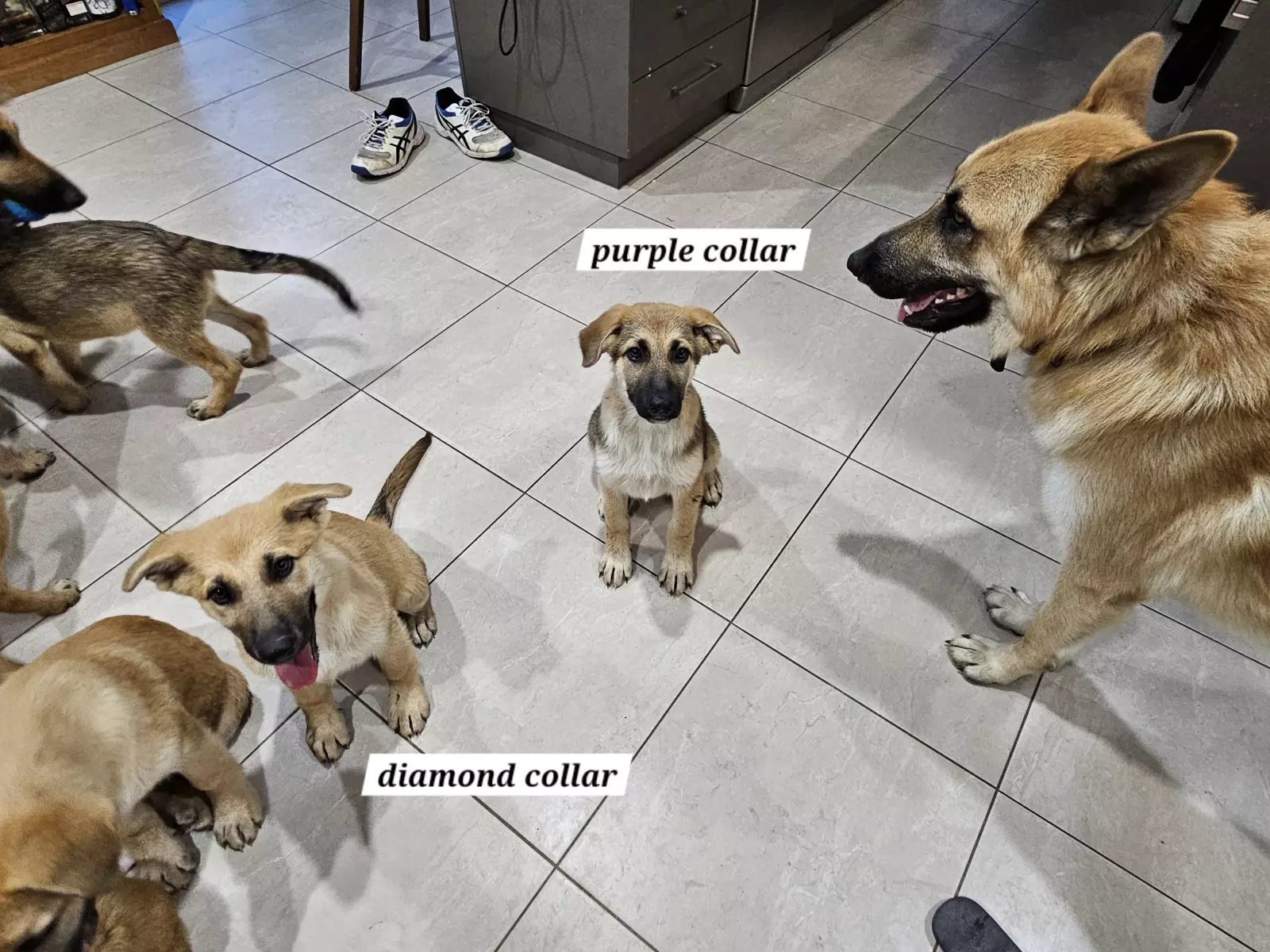 We currently have 4 girls and 1 boy available: Green Collar Girl, Diamond Collar Girl, Pink Collar Girl, Purple Collar Girl, and Camo Collar Boy.