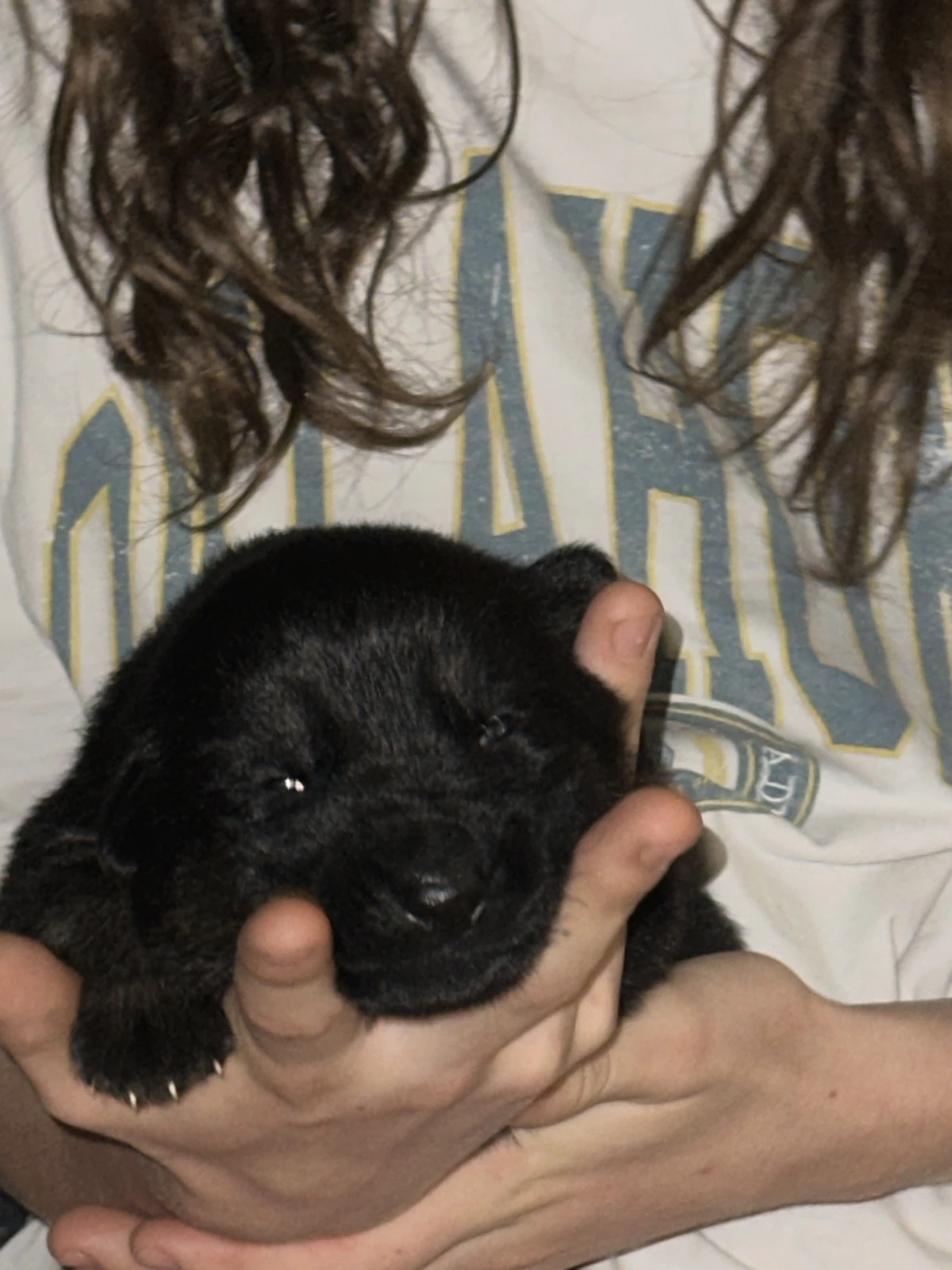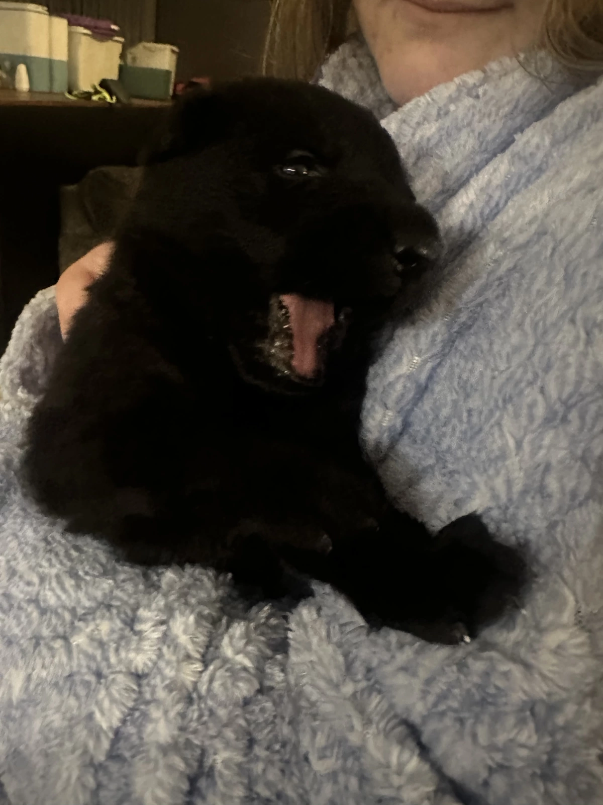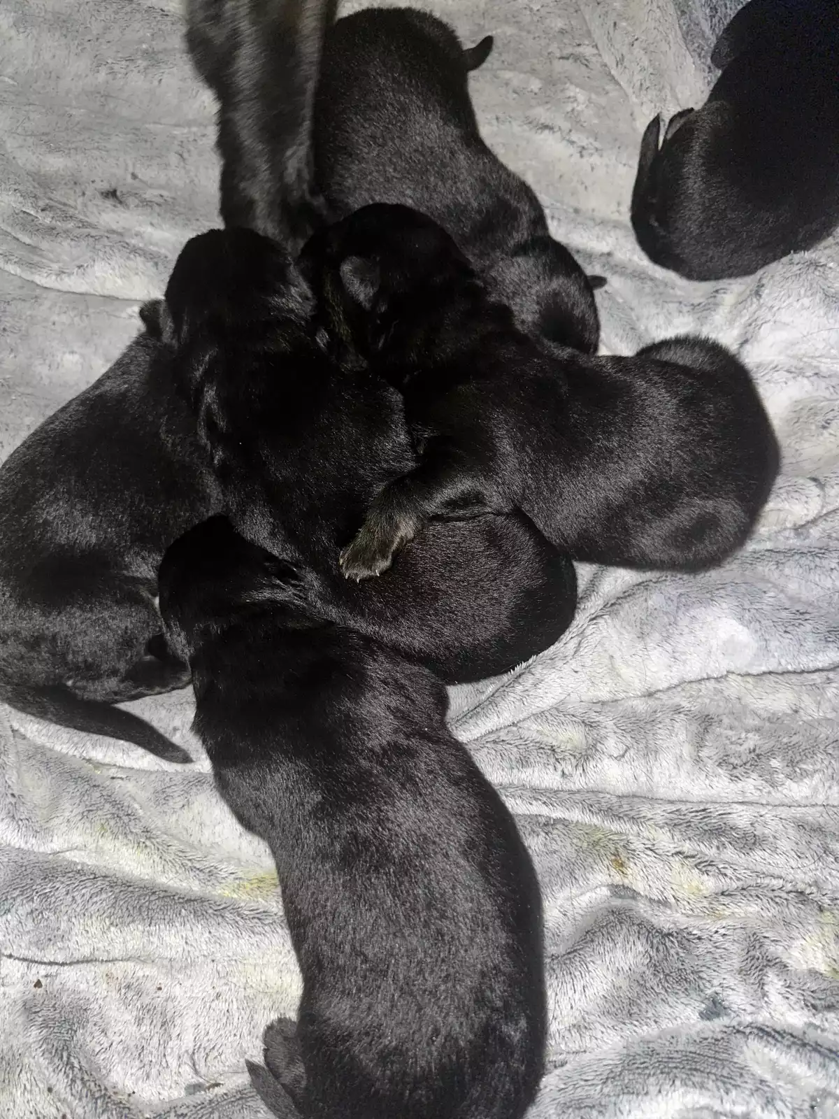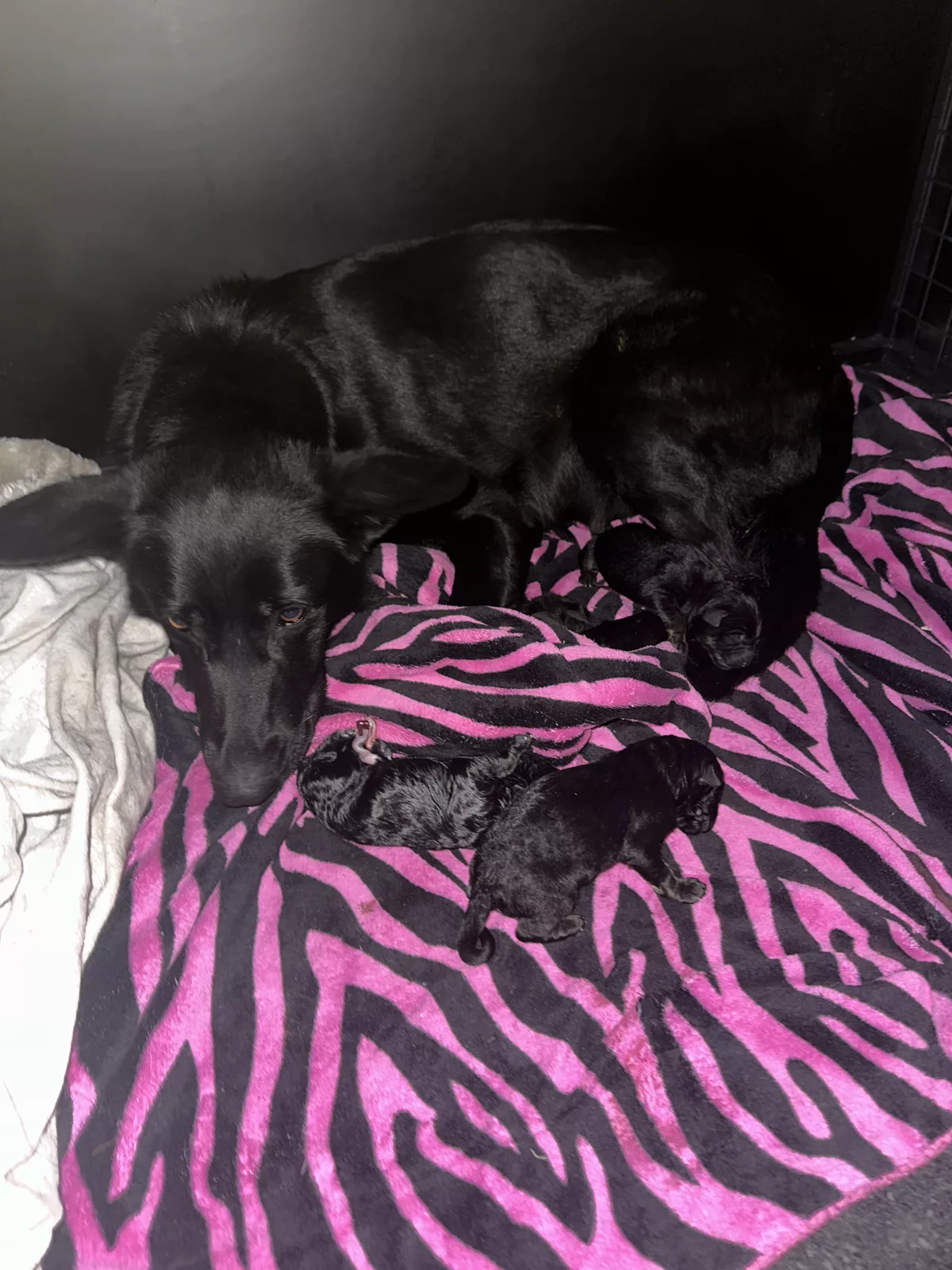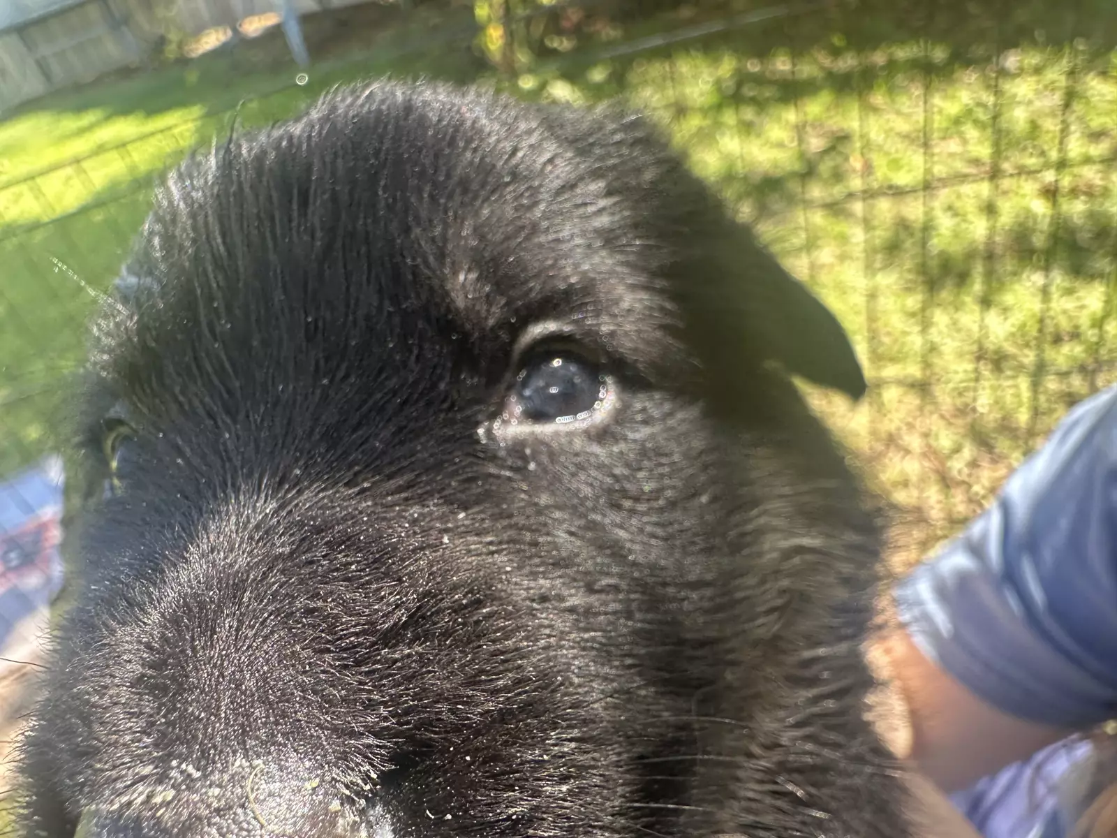 Dad is a pedigree black German Shepherd trained in protection. He is fit and healthy and has no skin or joint issues- available to view (pictured black adult short coat)