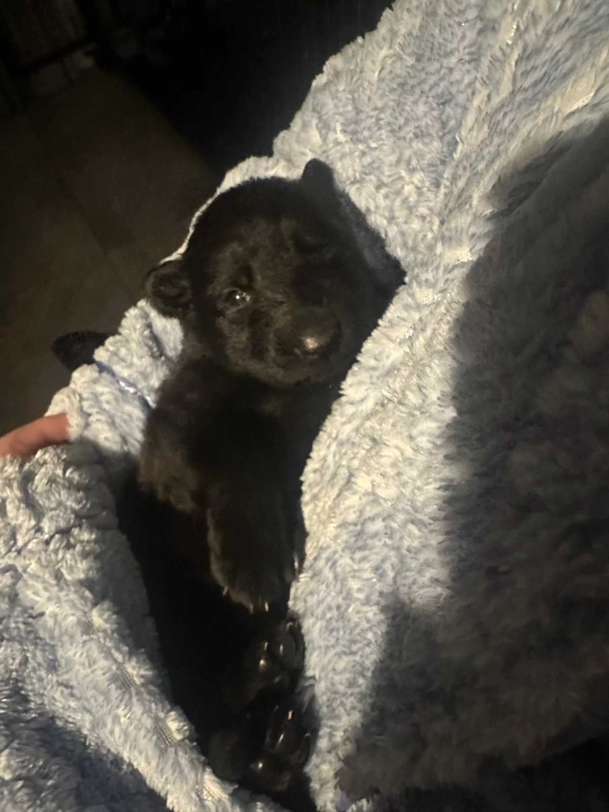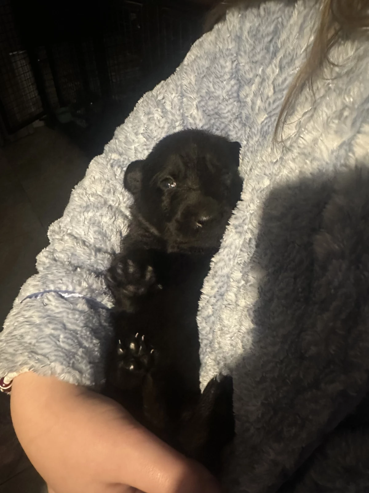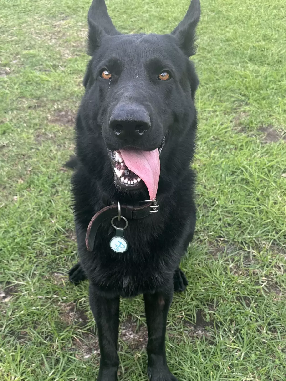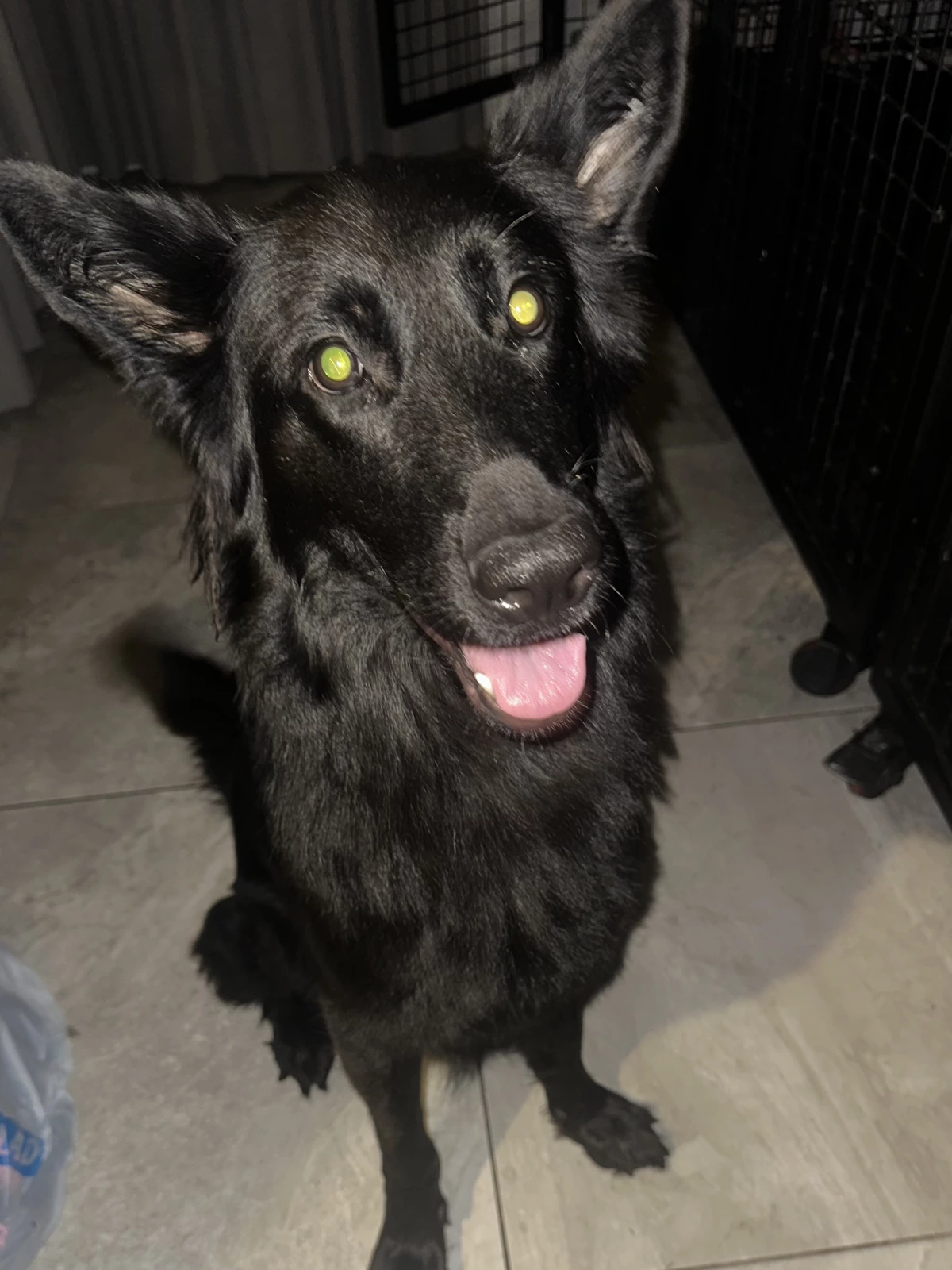 Dad is a pedigree black German Shepherd trained in protection. He is fit and healthy and has no skin or joint issues- available to view (pictured black adult short coat)