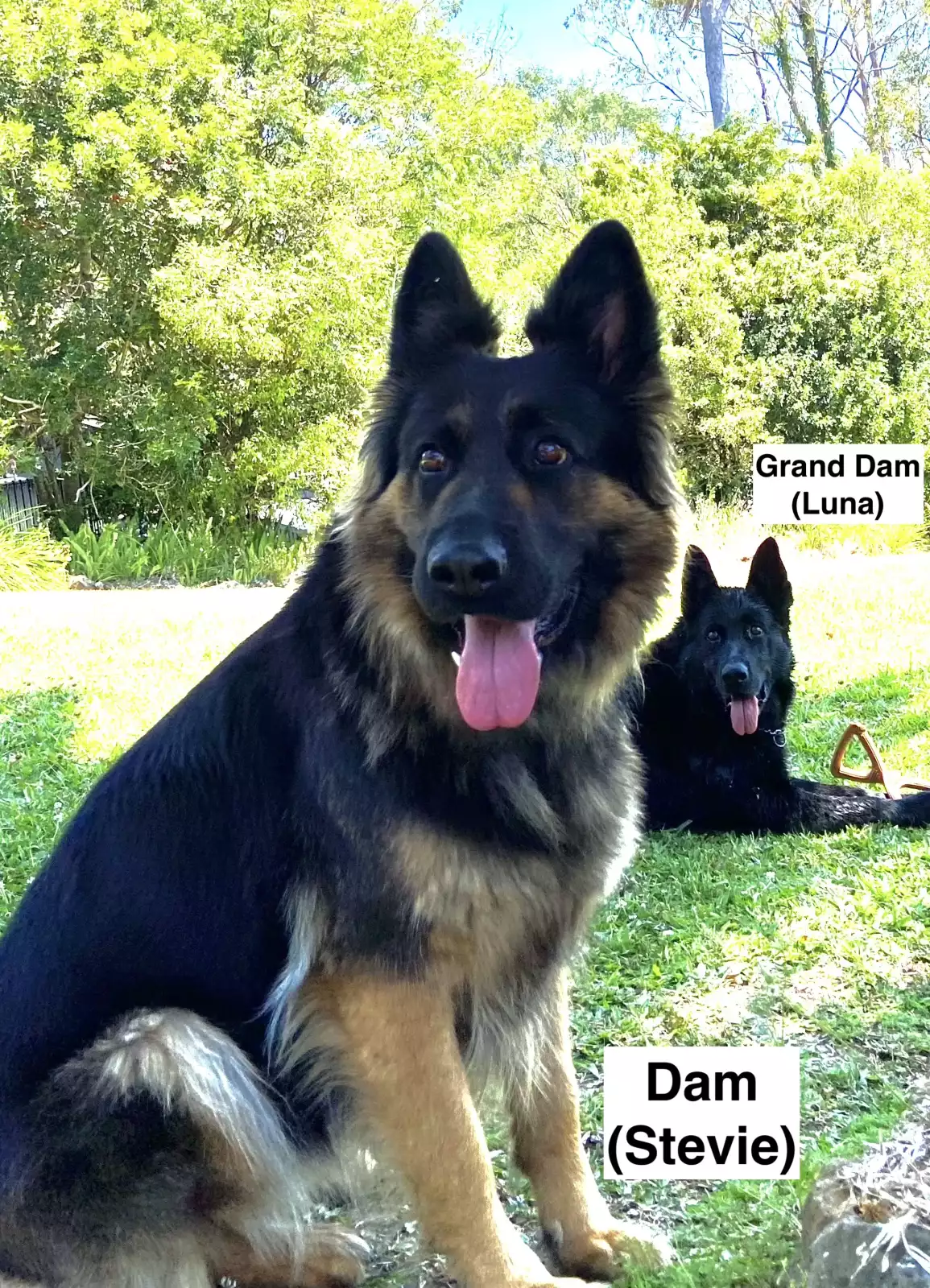 • Dam “Stevie”: large-boned black & gold, straight back, long coat, soft family temperament;