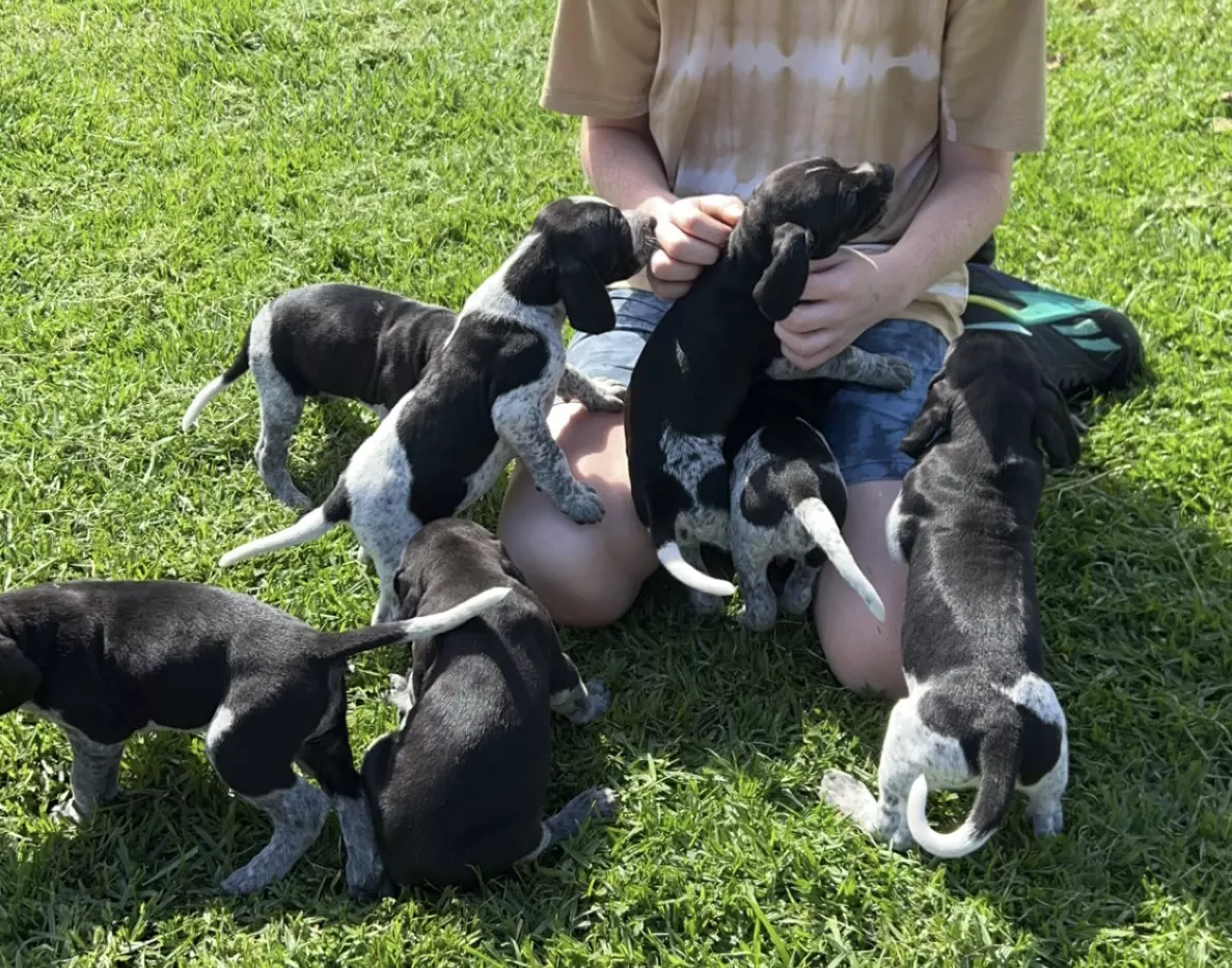 7 beautiful German Shorthaired Pointer puppies looking for their new fur-ever homes from 8/11/23.