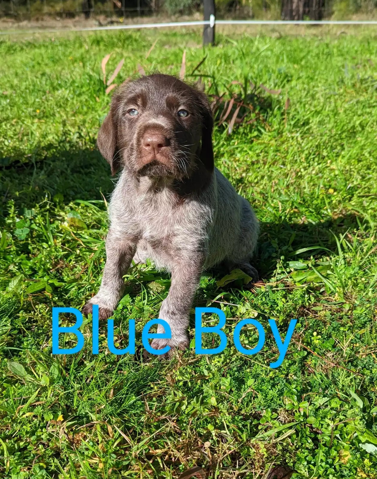 The mum is a black and white German Wirehaired Pointer with 1/4 Wolfhound, and the dad is a pure German Wirehaired Pointer.