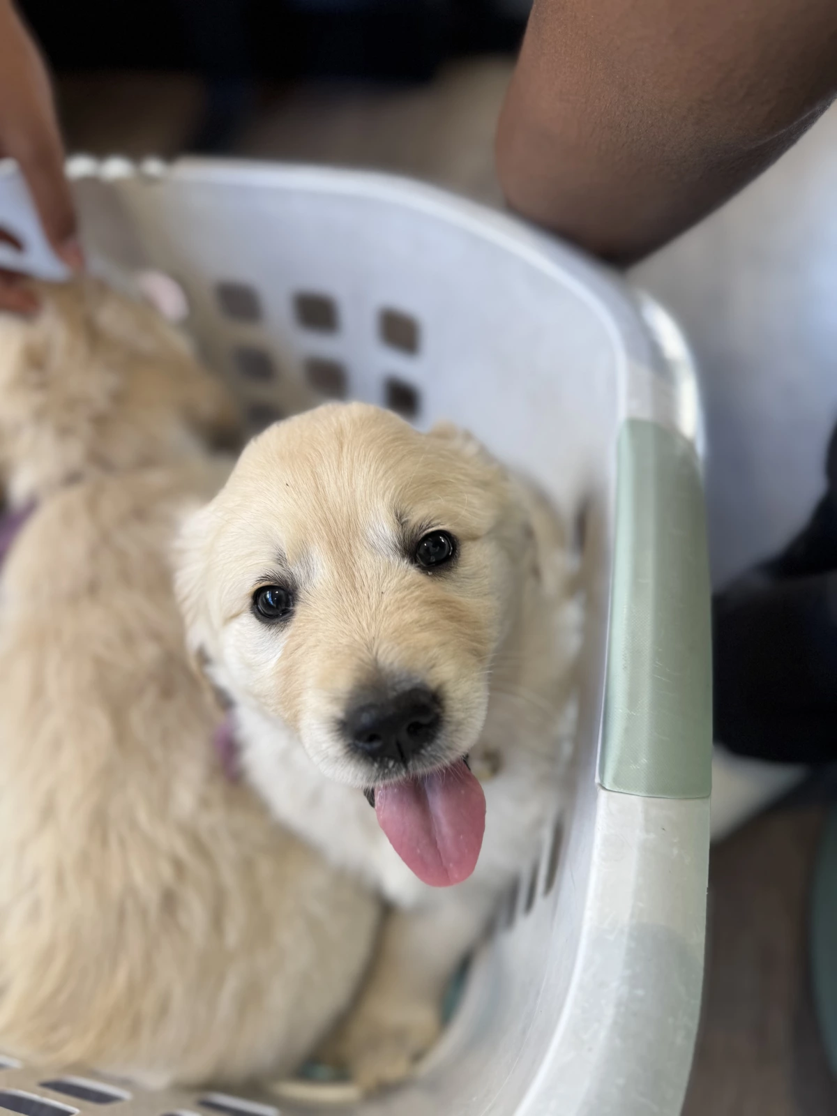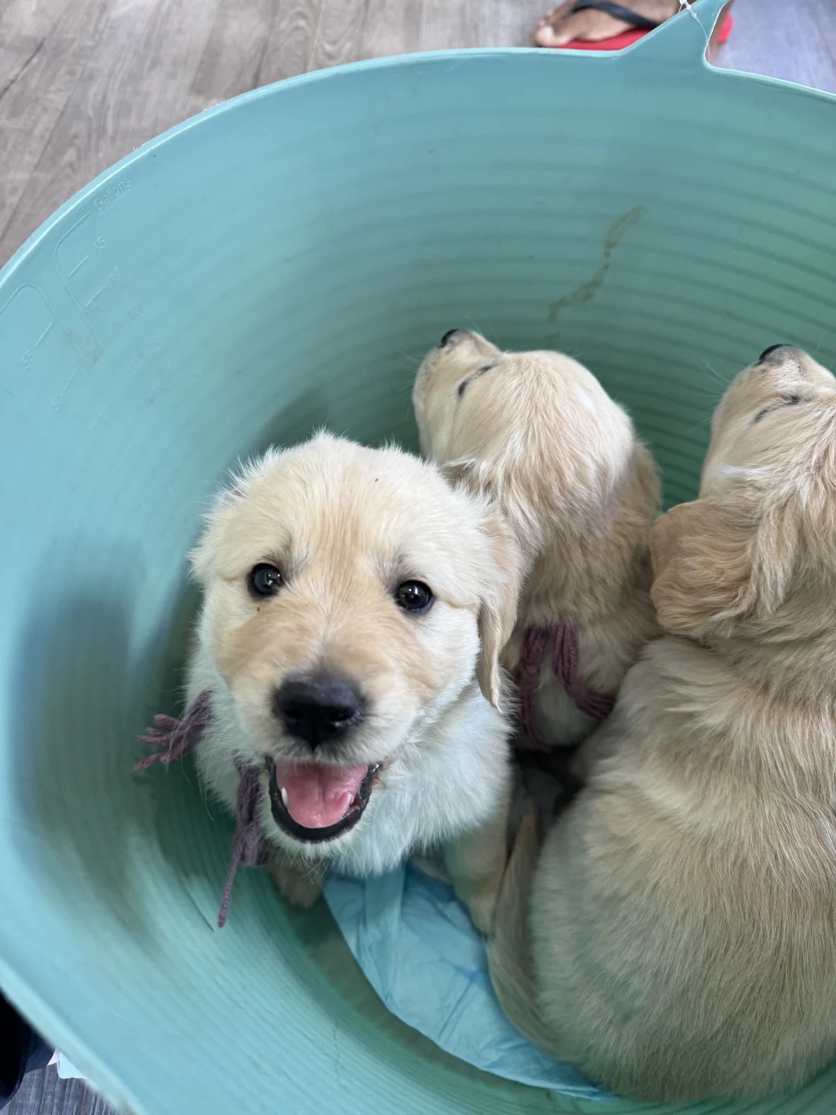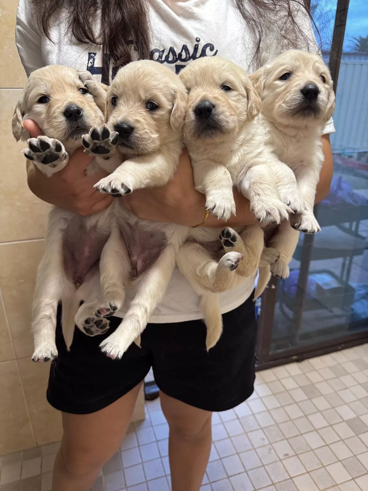 Purebred Golden Retriever puppies, now 5 weeks old, are healthy, strong, and stunning in appearance. They are beginning to show their gentle nature and curious personalities as they grow and interact with people each day.