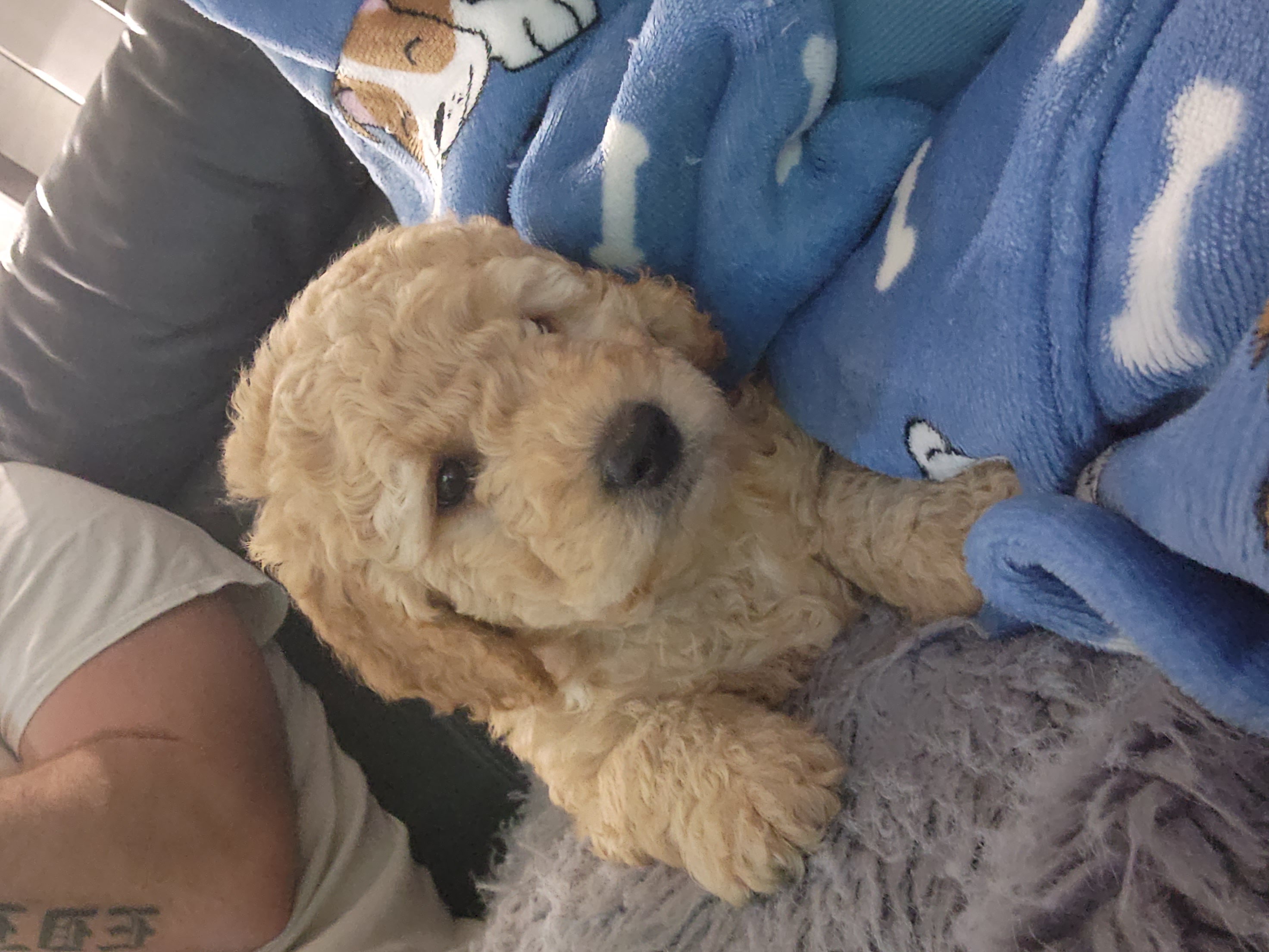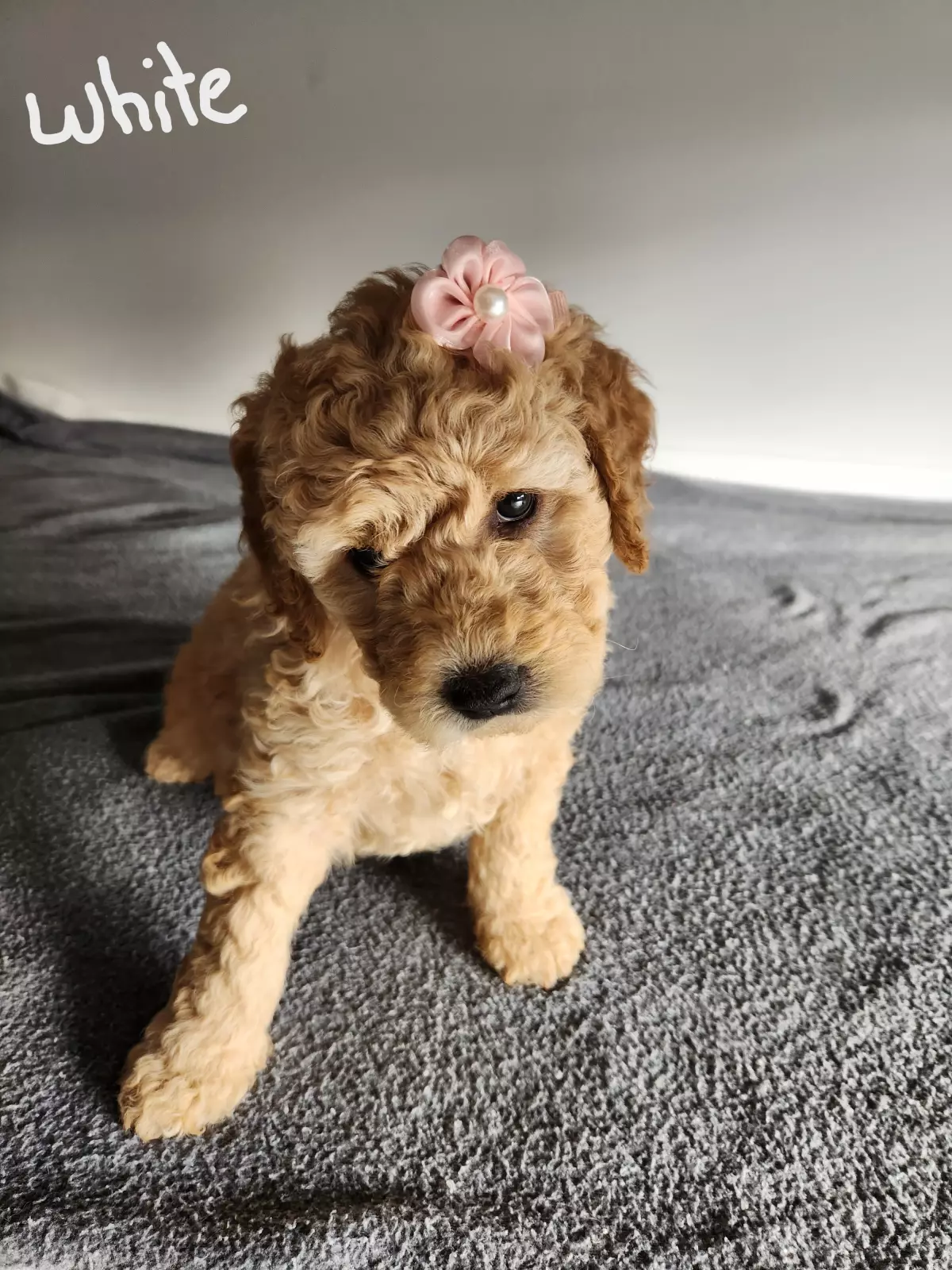 Mum – Kira: A stunning white Groodle with a sweet, gentle nature. She’s incredibly affectionate and a wonderful mum.