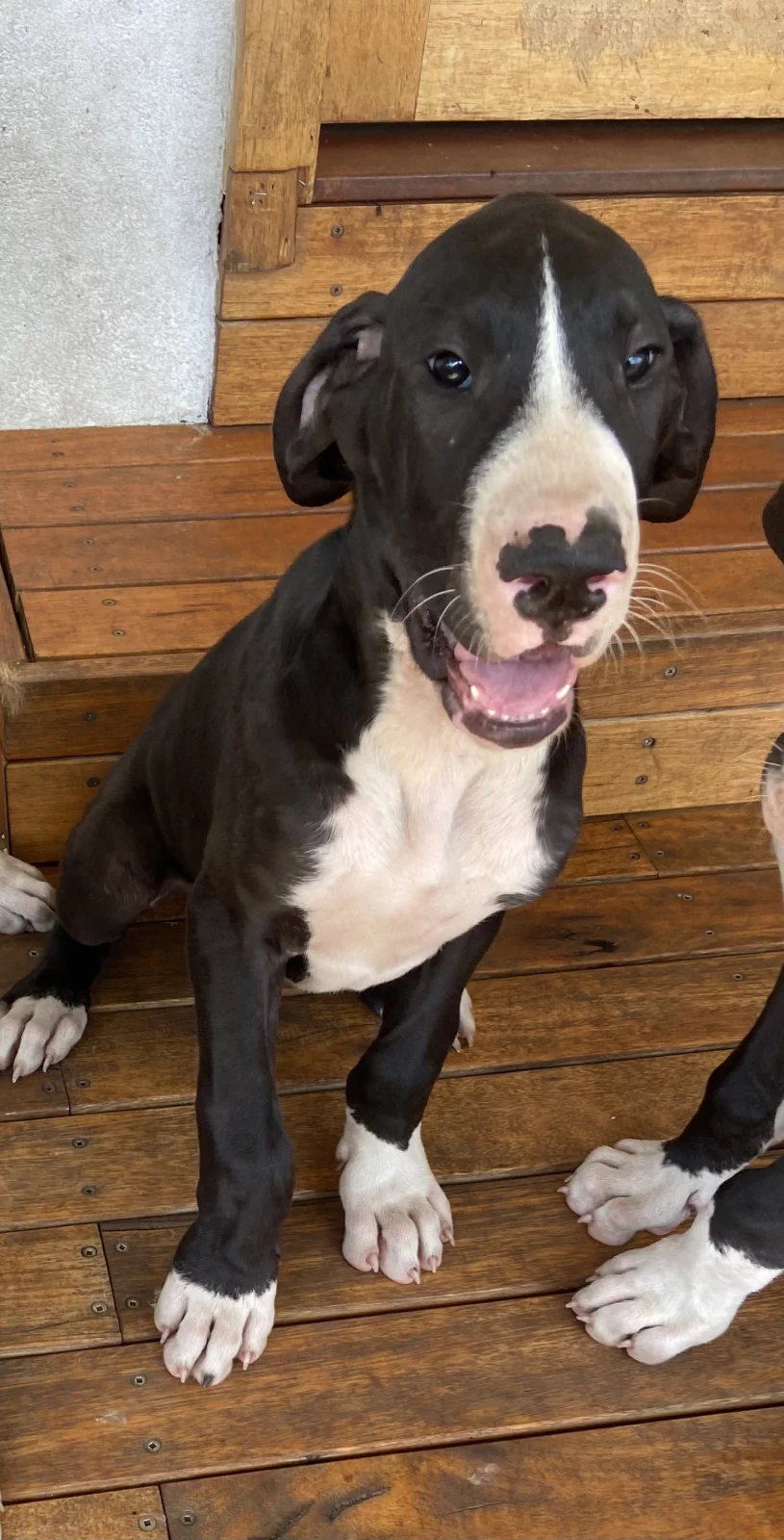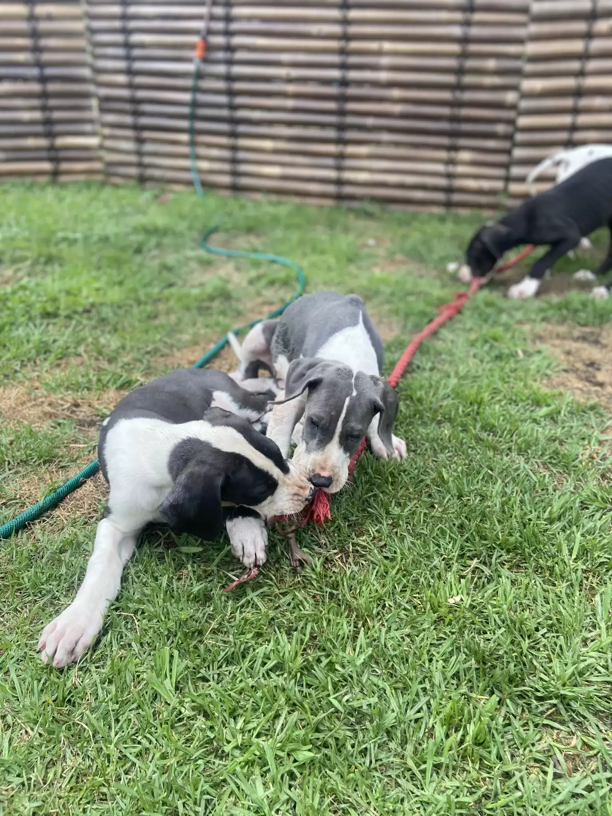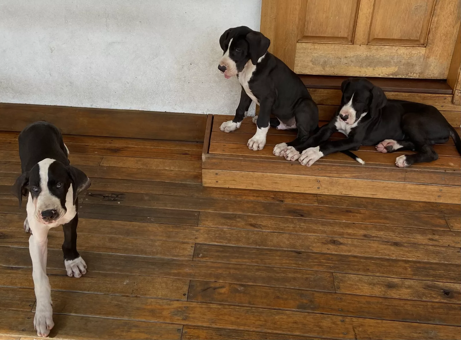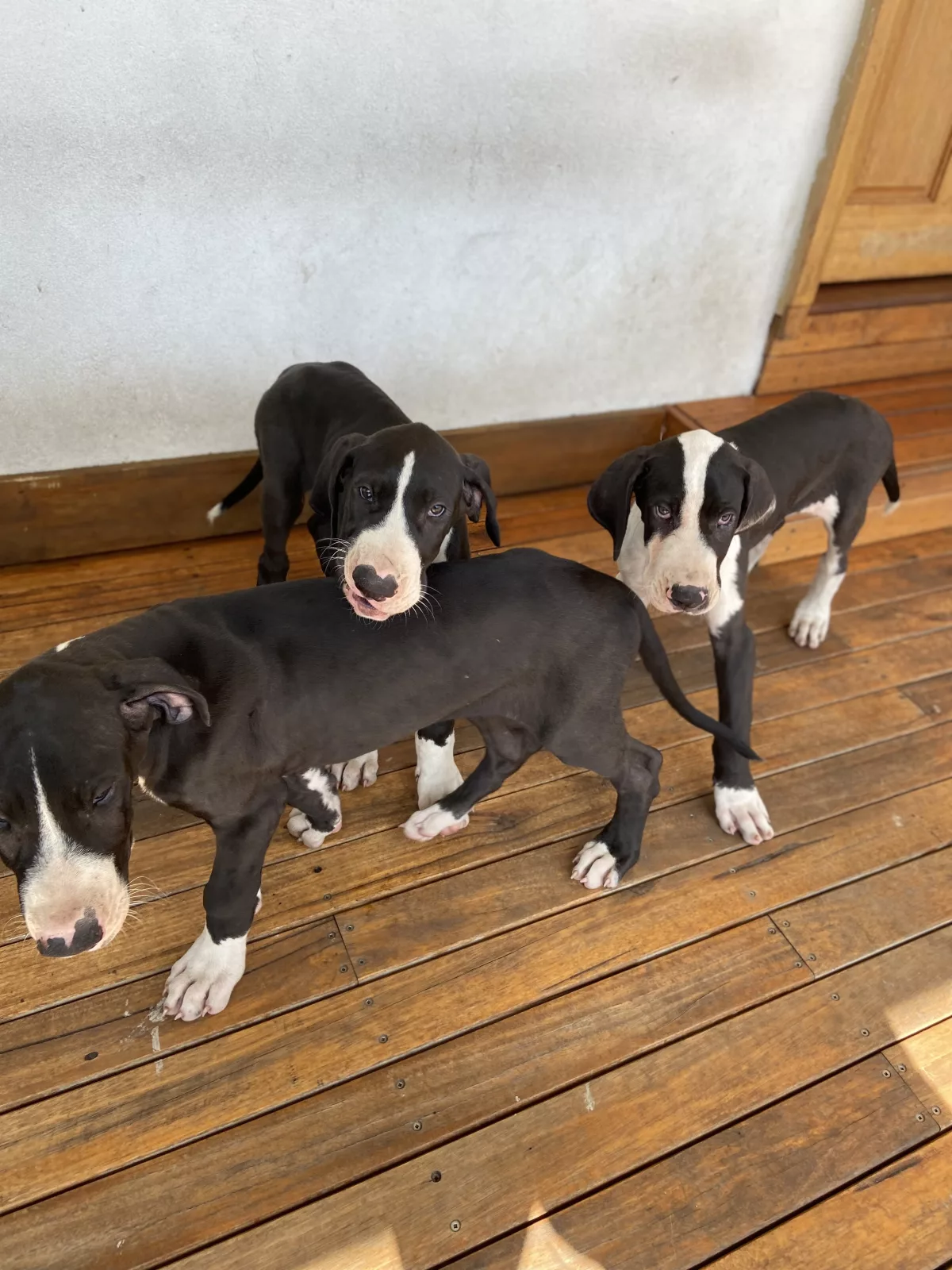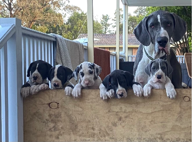 4 purebred Great Dane puppies are now available to the right homes. Mum is a registered Great Dane and Dad is also purebred, both with wonderful temperaments and strong, healthy lines. The litter was born on the 24th of September and has been raised with plenty of care and attention. Puppies have been microchipped, wormed, and vaccinated, so they are ready to transition smoothly into their new families. Available are 3 striking black and white males and 1 beautiful blue female. Please note, the Harlequin pup shown in some photos is not for sale. More pictures and details can be provided upon request. These pups will grow into large, loyal, and affectionate companions. Serious enquiries only.