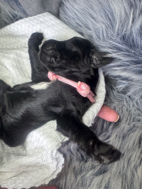 This beautiful multi-generational Mini Groodle is a black female with a white chest, expected to weigh between 10 to 15kg when fully grown. Her mum is a Groodle weighing 20kg, and her dad is a Mini Poodle weighing 5.5kg. Both parents have been DNA cleared of any hereditary diseases and have undergone hip and elbow scoring, ensuring this little pup has the best health foundation.