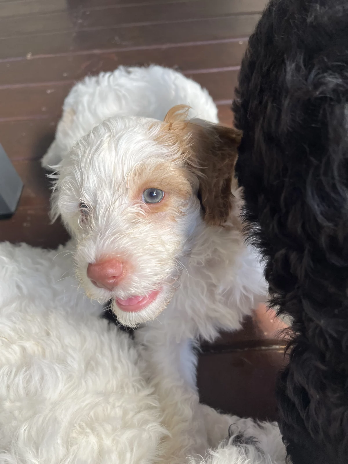 White with Chocolate Patches Boy: This unique pup has beautiful white fur with adorable chocolate patches, making him stand out with his gentle temperament.