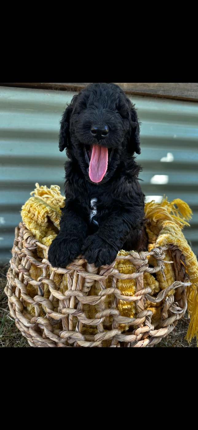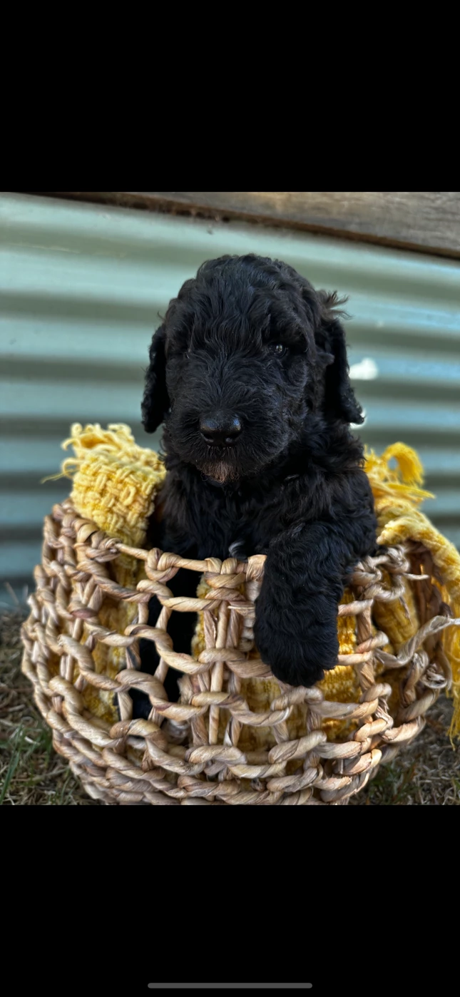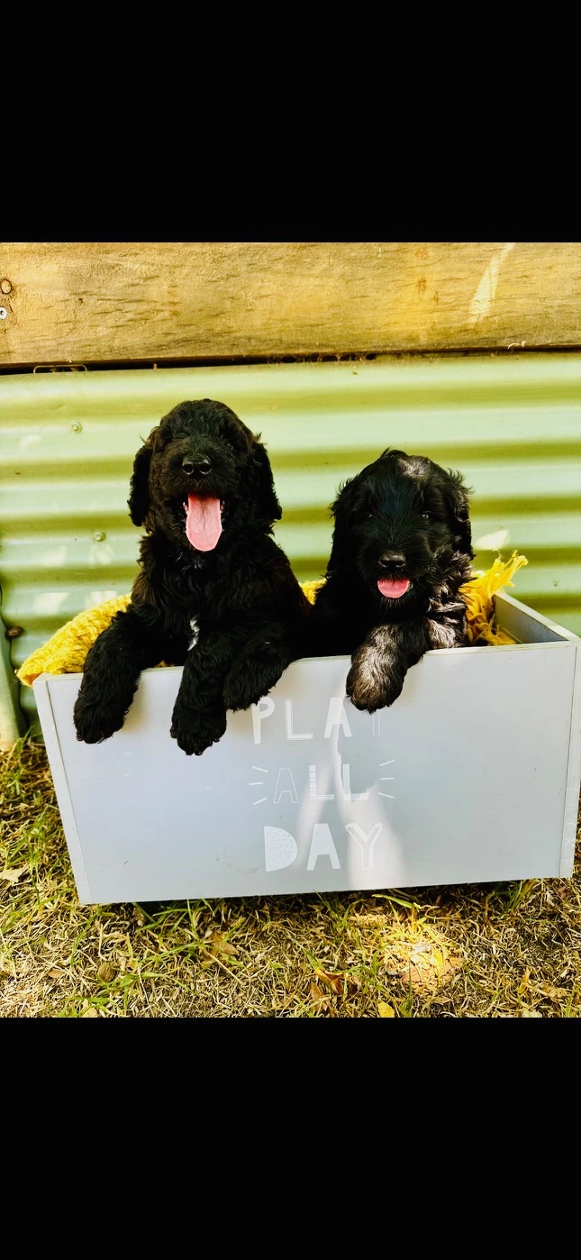 I have two beautiful Ultimate Groodles available for their new homes! Both mum, Bingo, and dad, Kevin, weigh around 36 kg. One boy is black with a fleece coat. He is a very gentle and quiet pup. The other boy is a stunning seal color, brown (chocolate) with black legs. Born on 02/01/2024, they are nearly 5 weeks old and currently weigh 5 kg. They are expected to grow over 30 kg once fully mature. These pups will be ready to go to their forever homes at the beginning of March 2024. They will have had their first vaccination and will come with a puppy pack.
