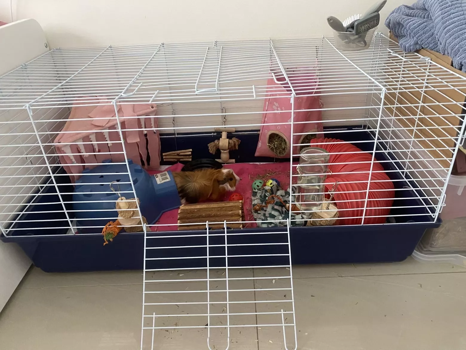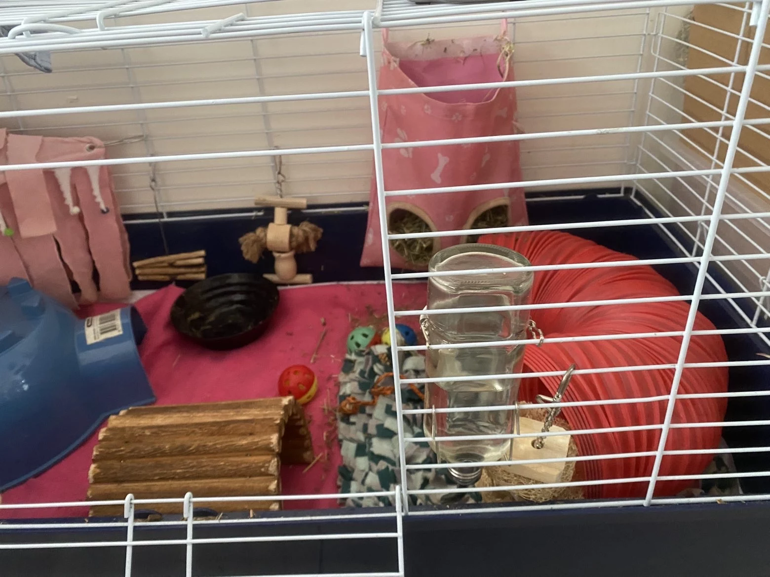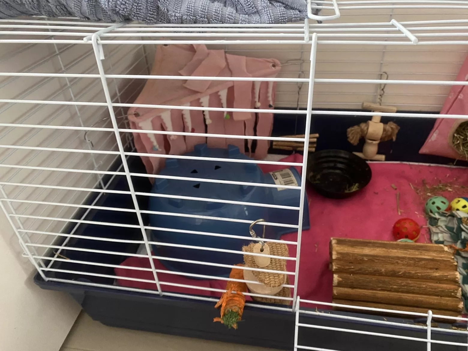 We are selling them with the cage, bottle, chew toys, hides, plastic house, blankets, towels, rugs (to replace the hay they lay on), nail clippers, tunnel and brushes.