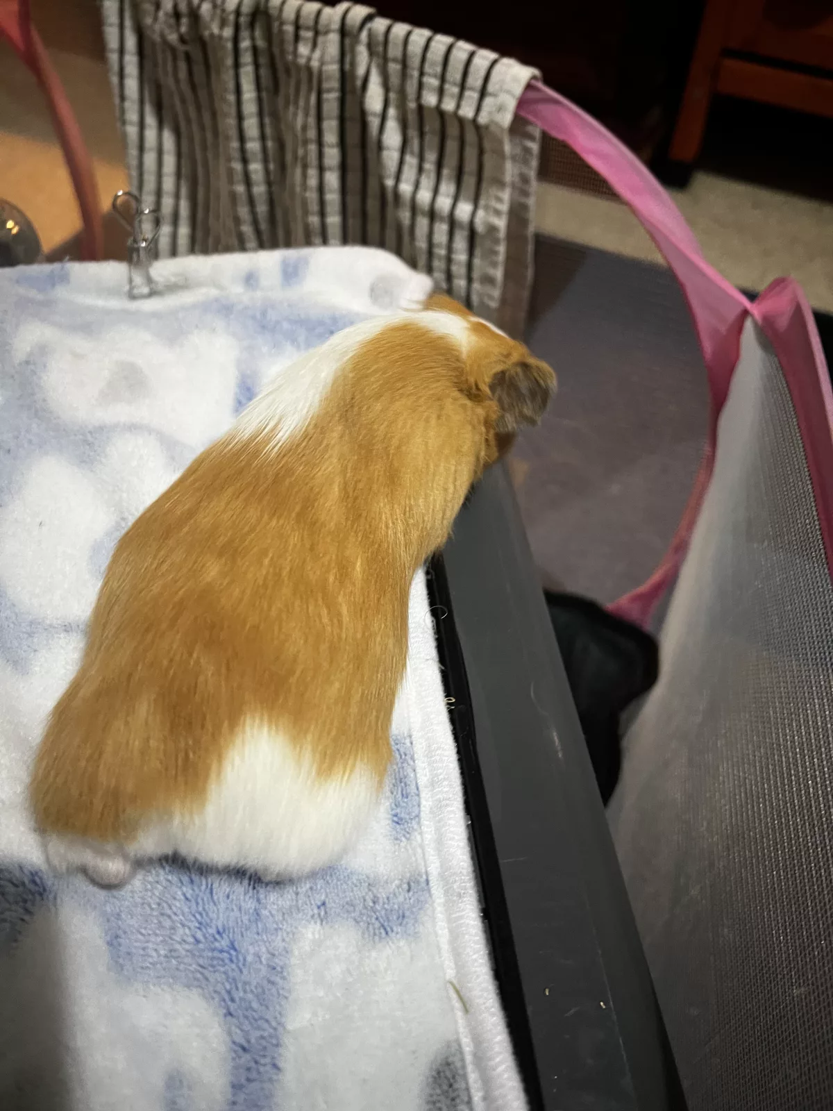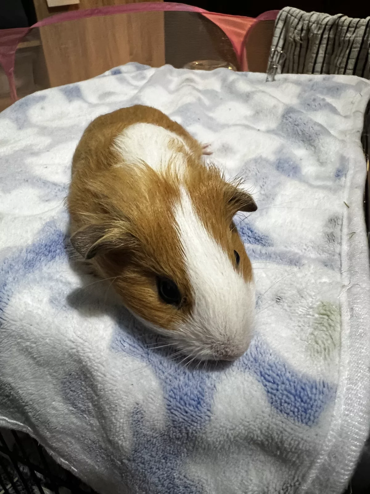 Pups are all eating rhodes hay, pellets (mixture of oxbow for young pigs & pellets from stockfeeds) and a variety of fresh vegies / grass daily. They are drinking from a water bottle. Housed inside in our loungeroom overnight and outside on a semi-enclosed patio weather permitting. All our guinea pigs are handled daily and have their nails clipped regularly. Our babies are very social and live in the same area as 6 adults across different cages. The 2 male pups are currently living with an adult boar, the 2 female pups are living together close by 3 adult sows.