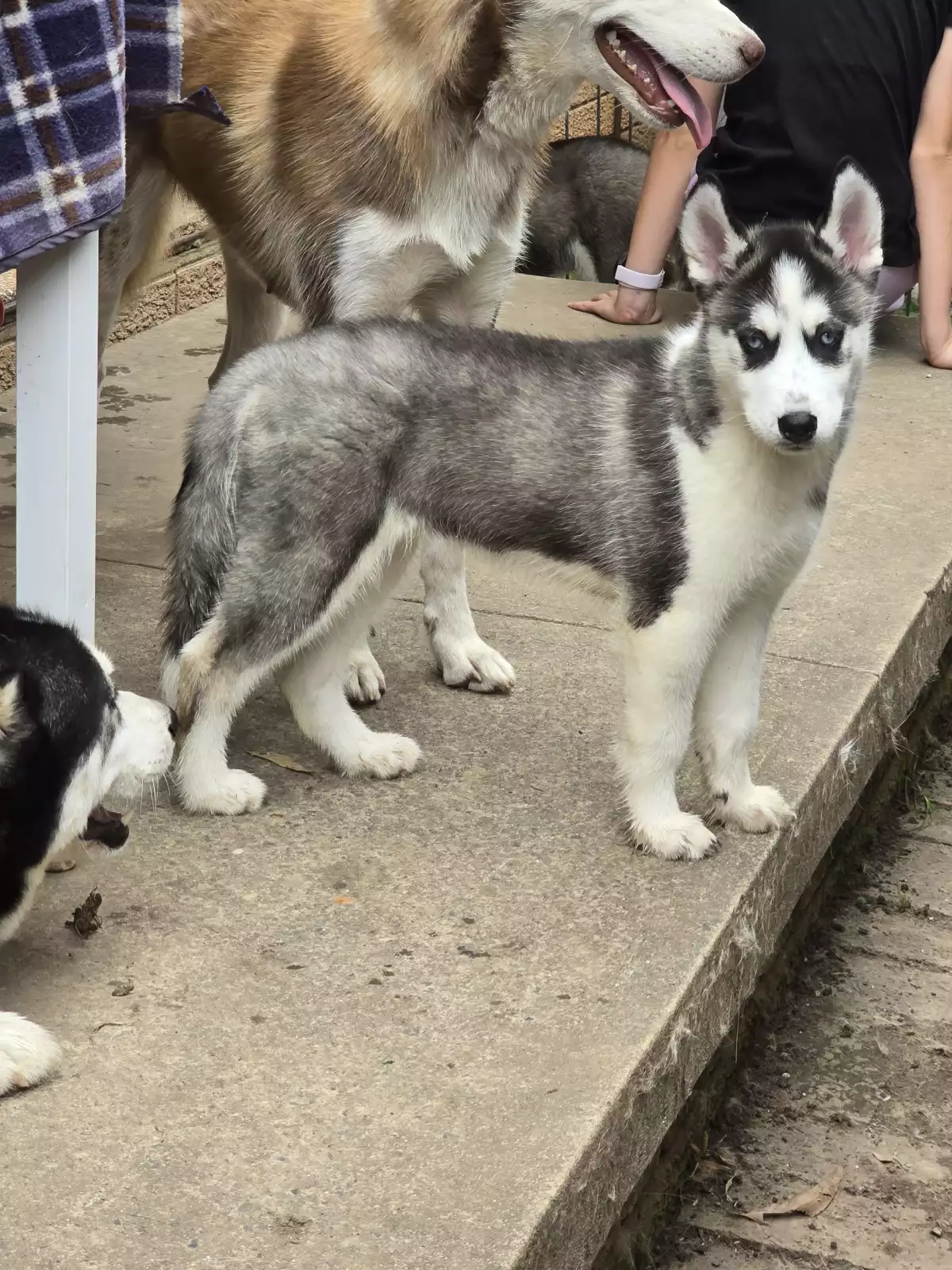 Girl 2- black, white and grey girl. Sweet quieter Girl who loves a good cuddle but will rev up the other pups for a good fun wrestle.