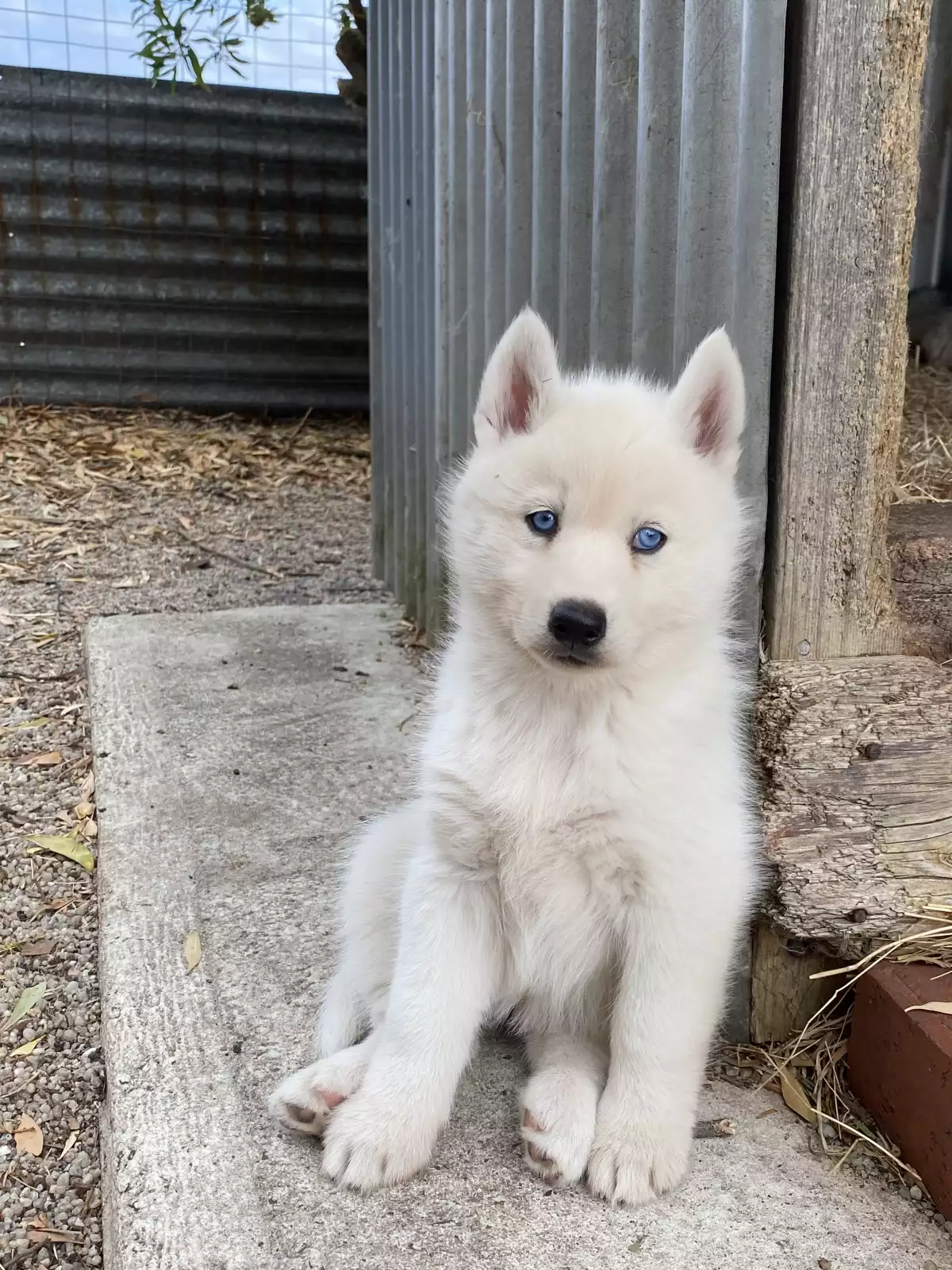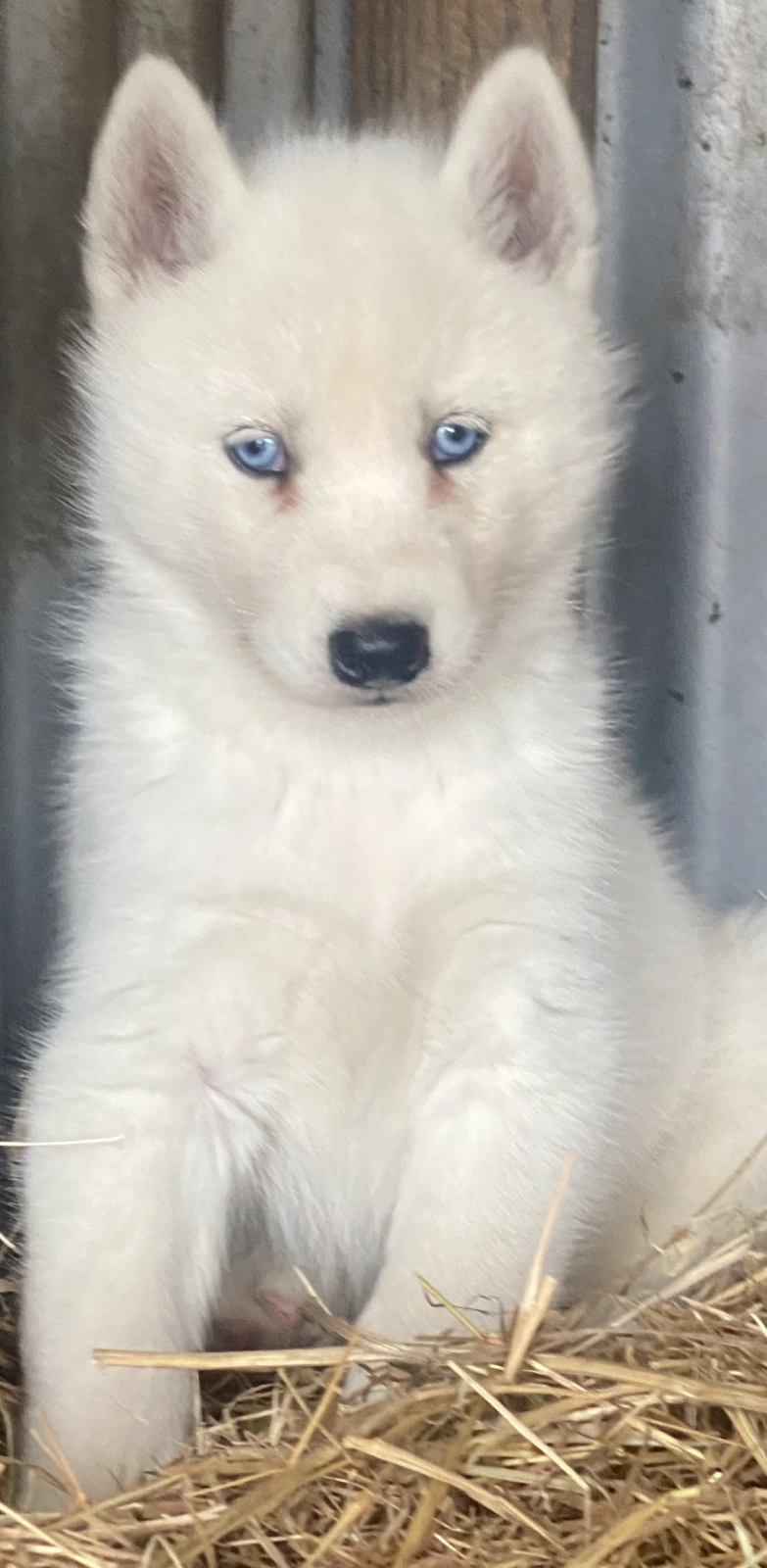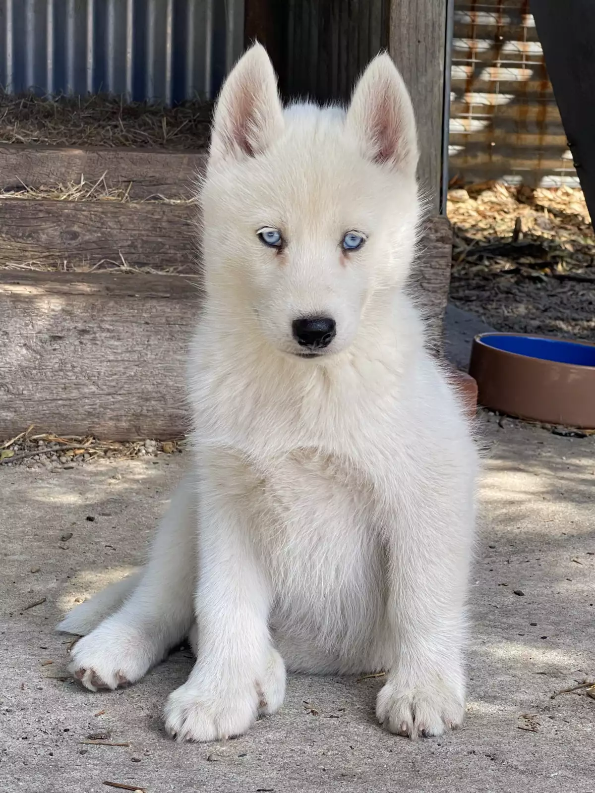 Beautiful pure white female Siberian Husky pup with bright blue eyes.