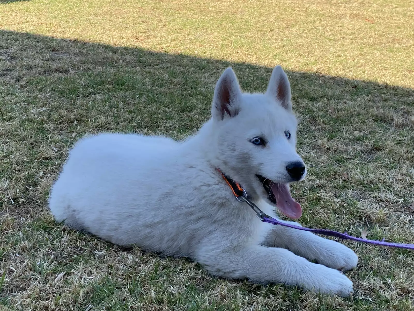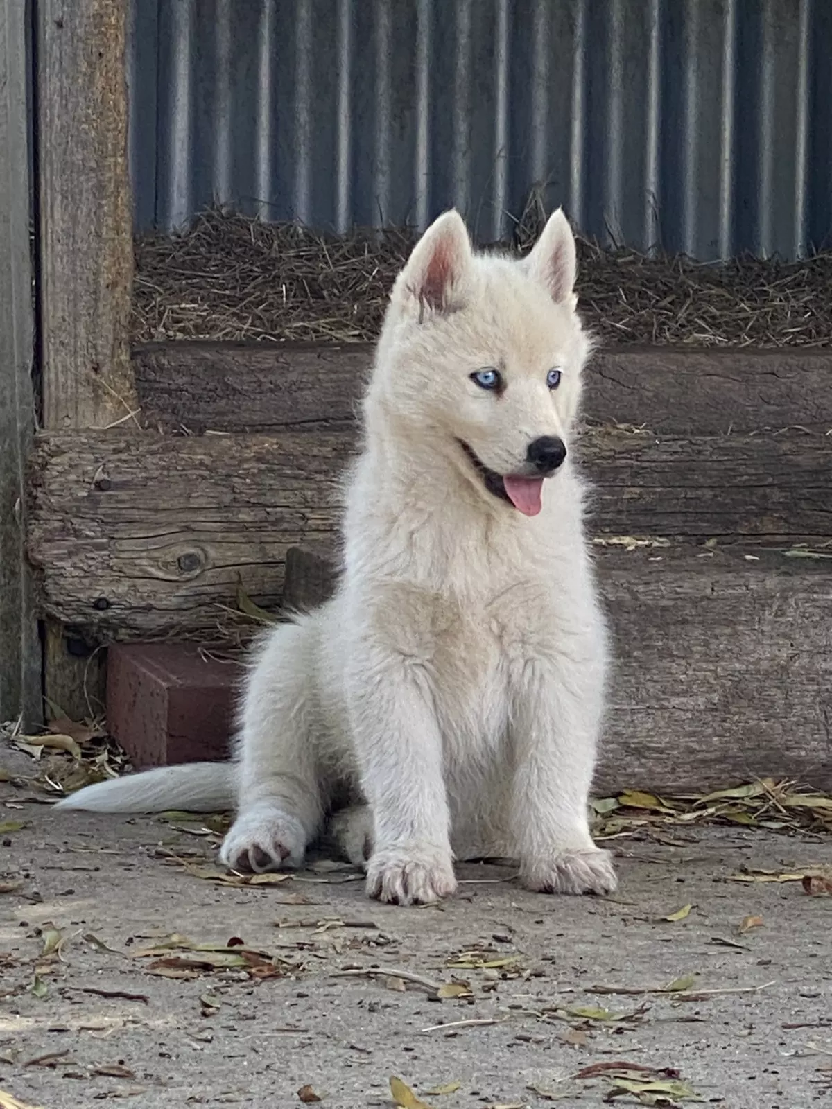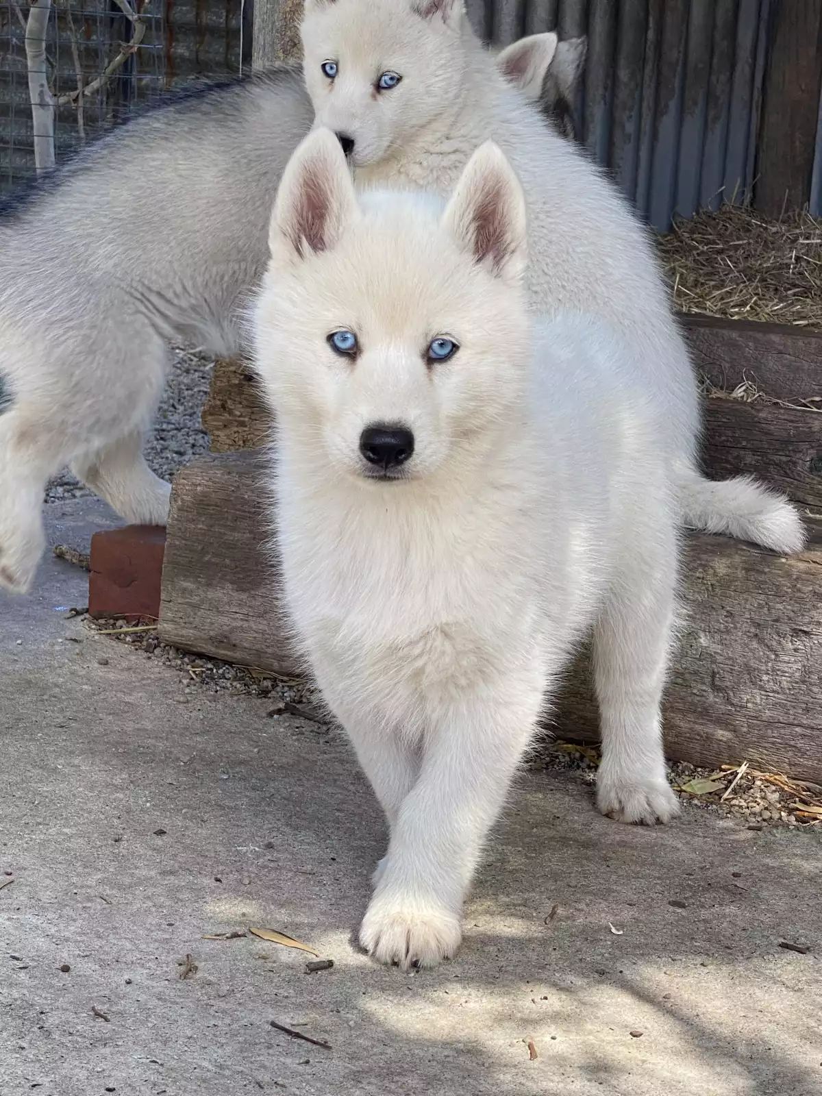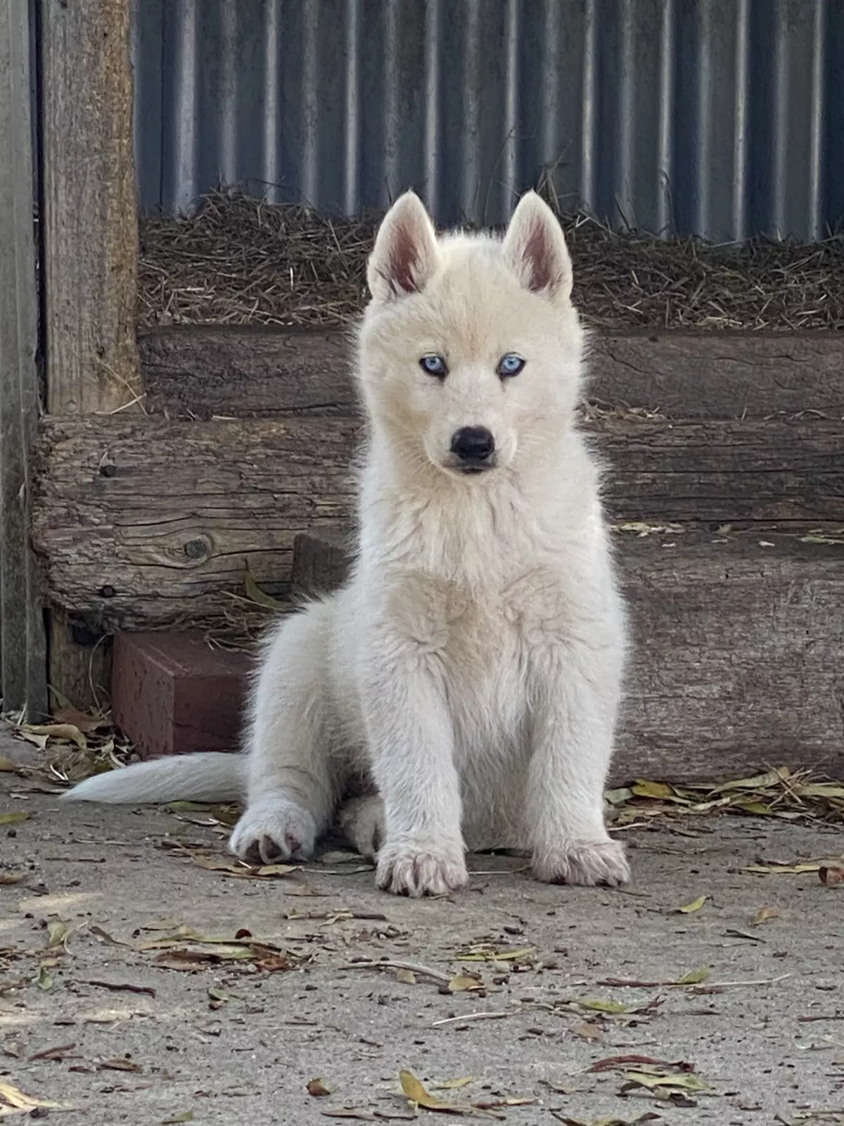 Beautiful pure white female Siberian Husky pup with bright blue eyes.