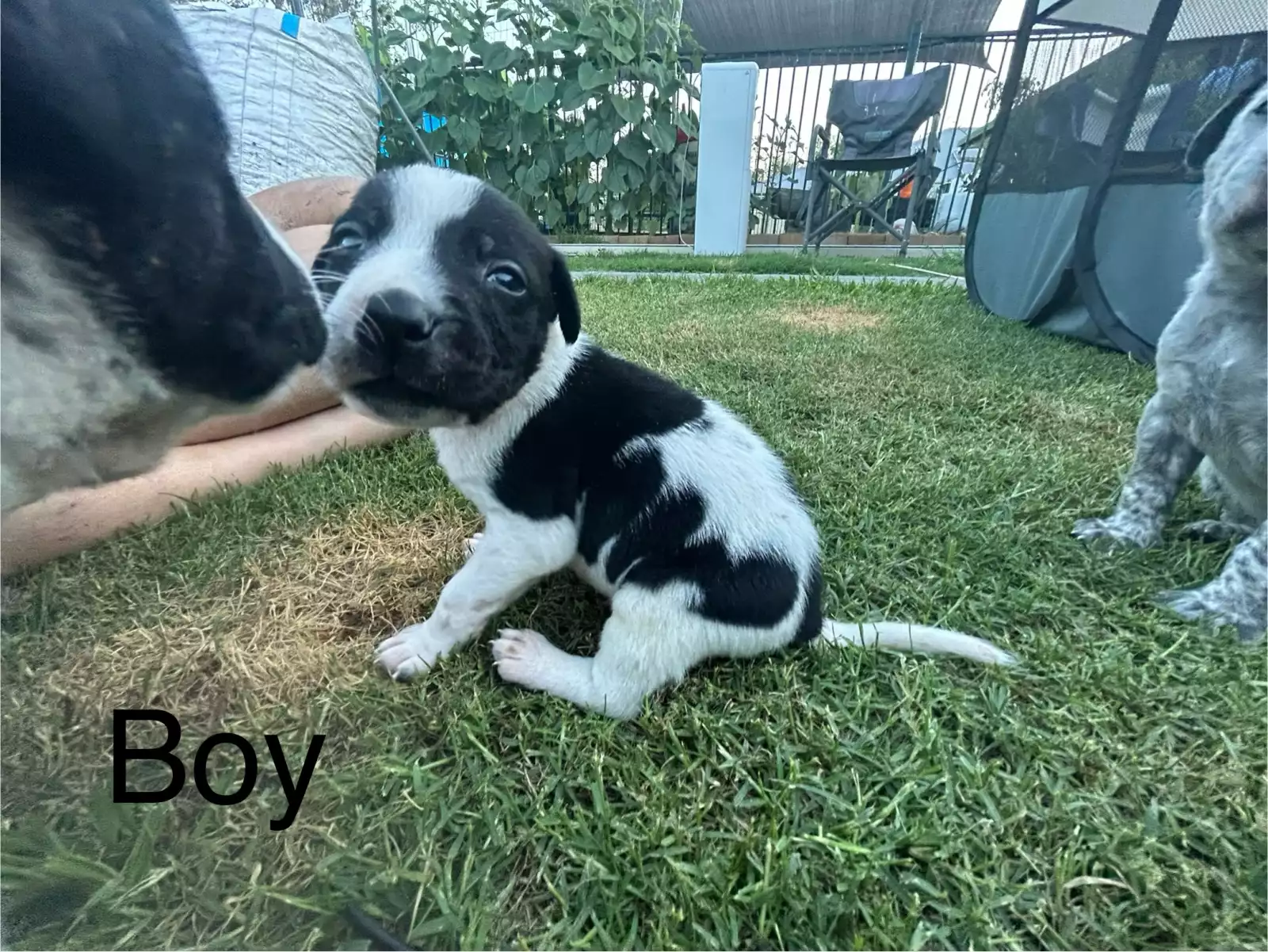 Mum is the black/brindle dog and Dad is the white and grey male with distinctive eye patches. Both parents have outstanding temperaments — calm, affectionate and loyal — and these traits are already showing strongly in the puppies. They are sweet, playful and well handled, making them great companions for families.