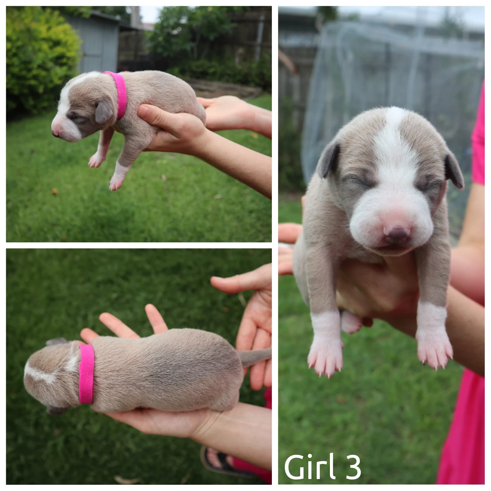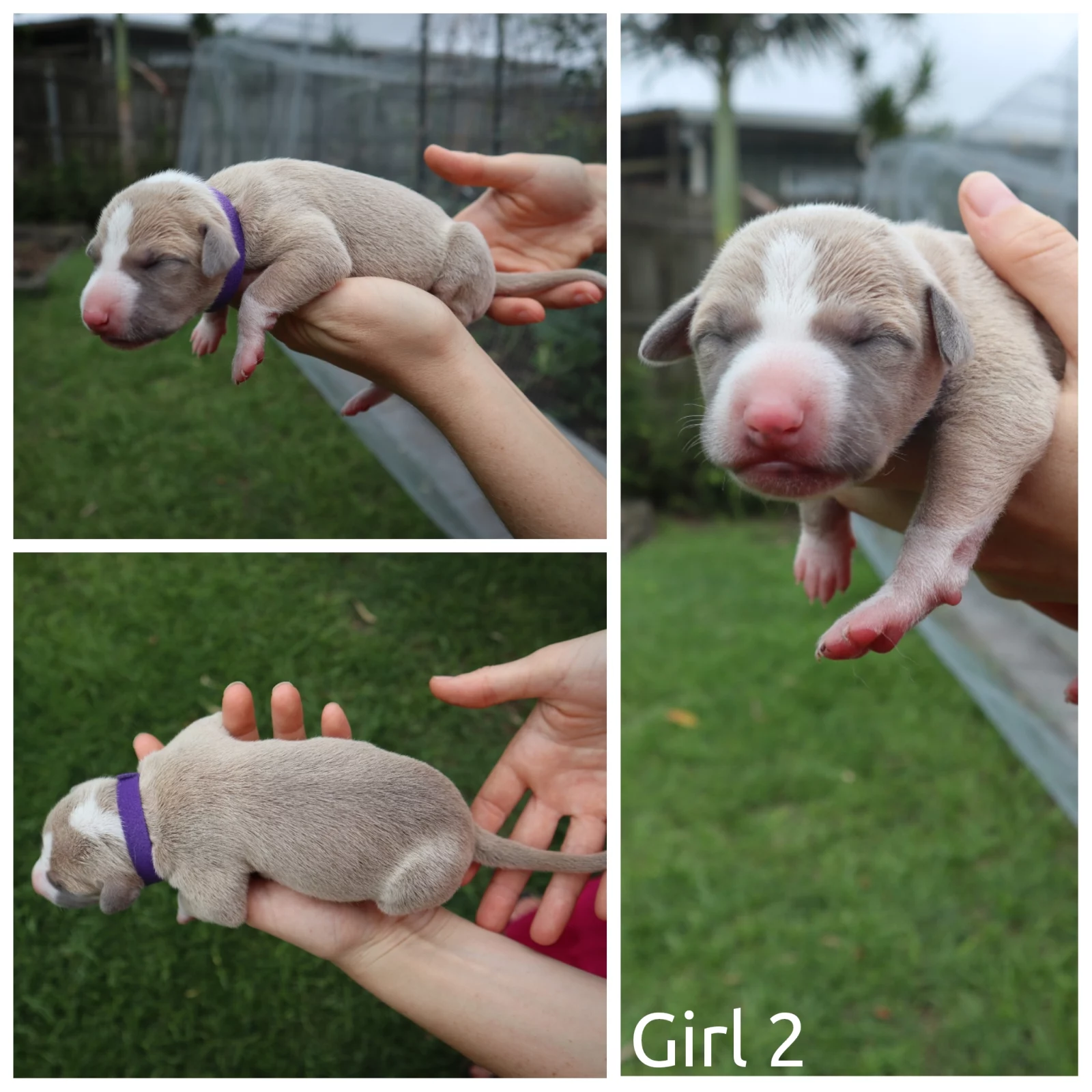 Girl 2: Purple collar, smallest girl, lightest colouring, name Lilah, blue face, soft personality ( Maybe sold)