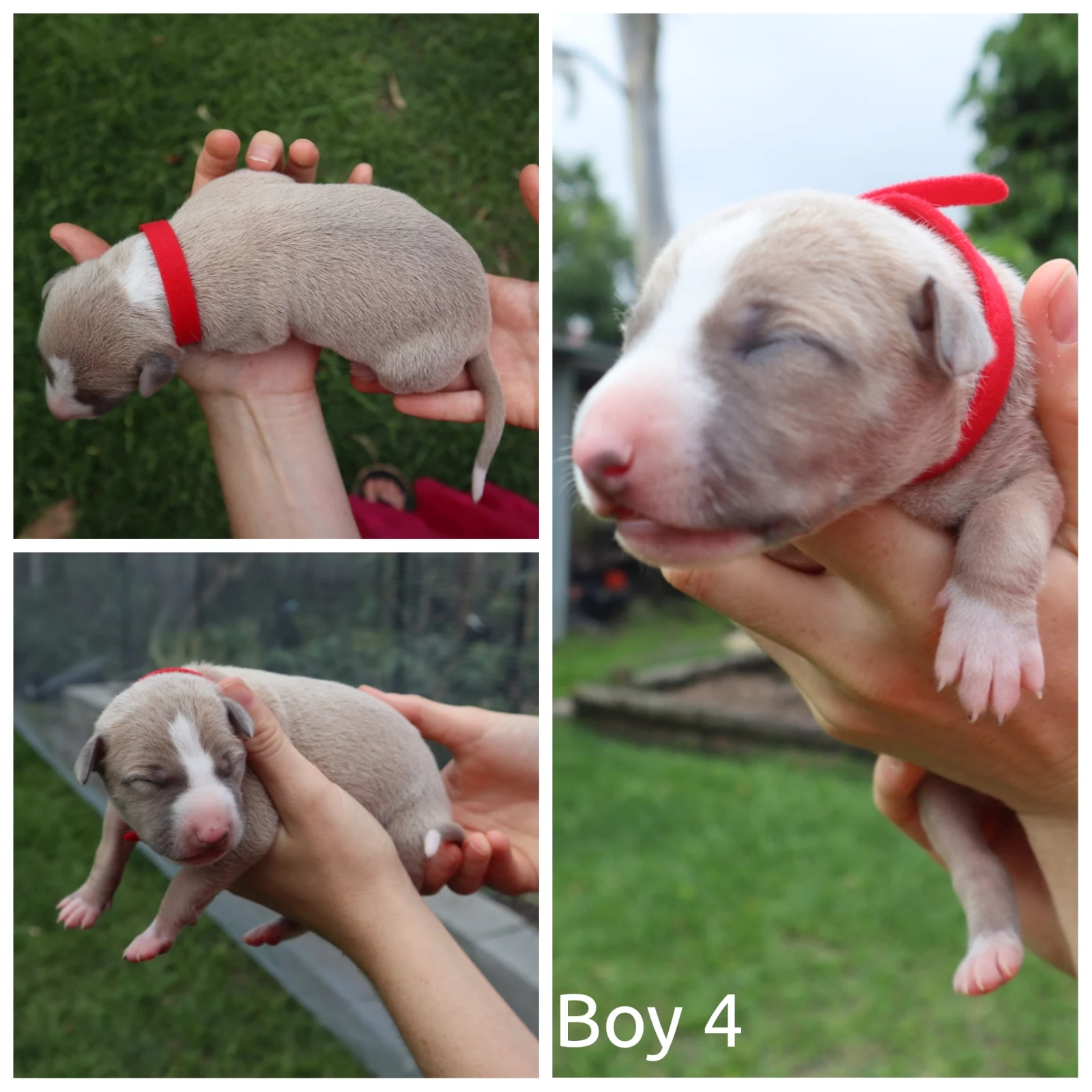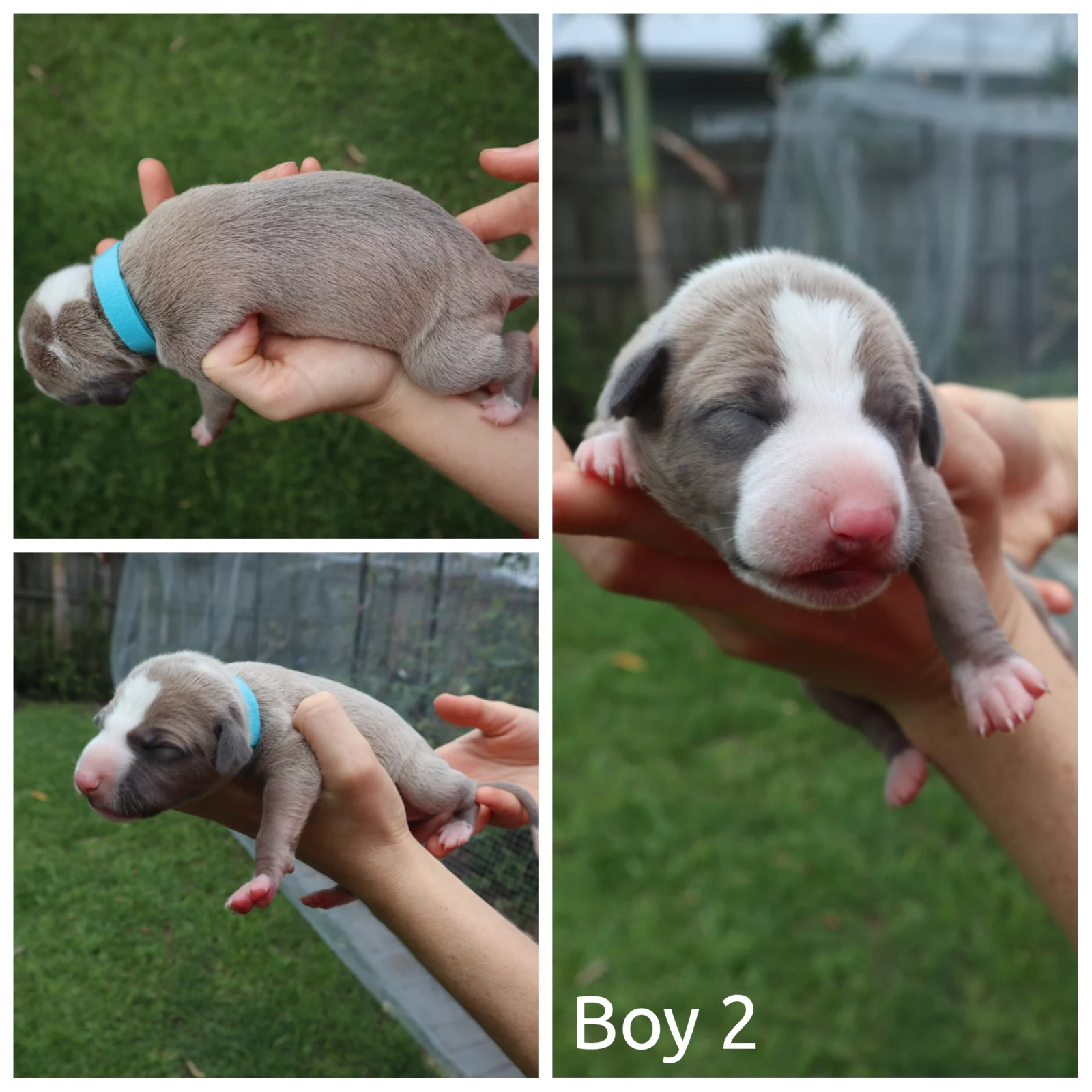 Boy 2: Blue collar, most blue in colour, light grey and white, blue face, name Storm