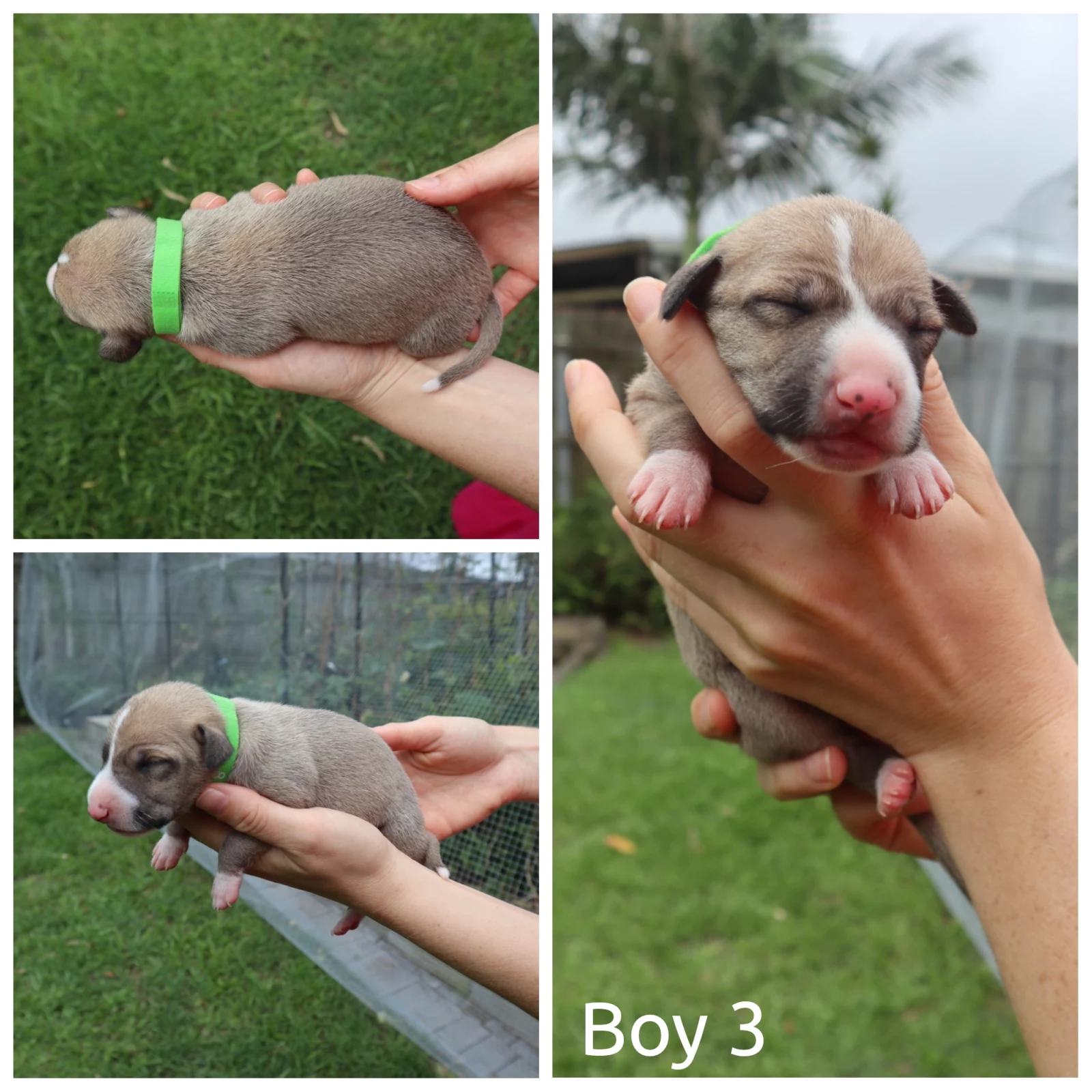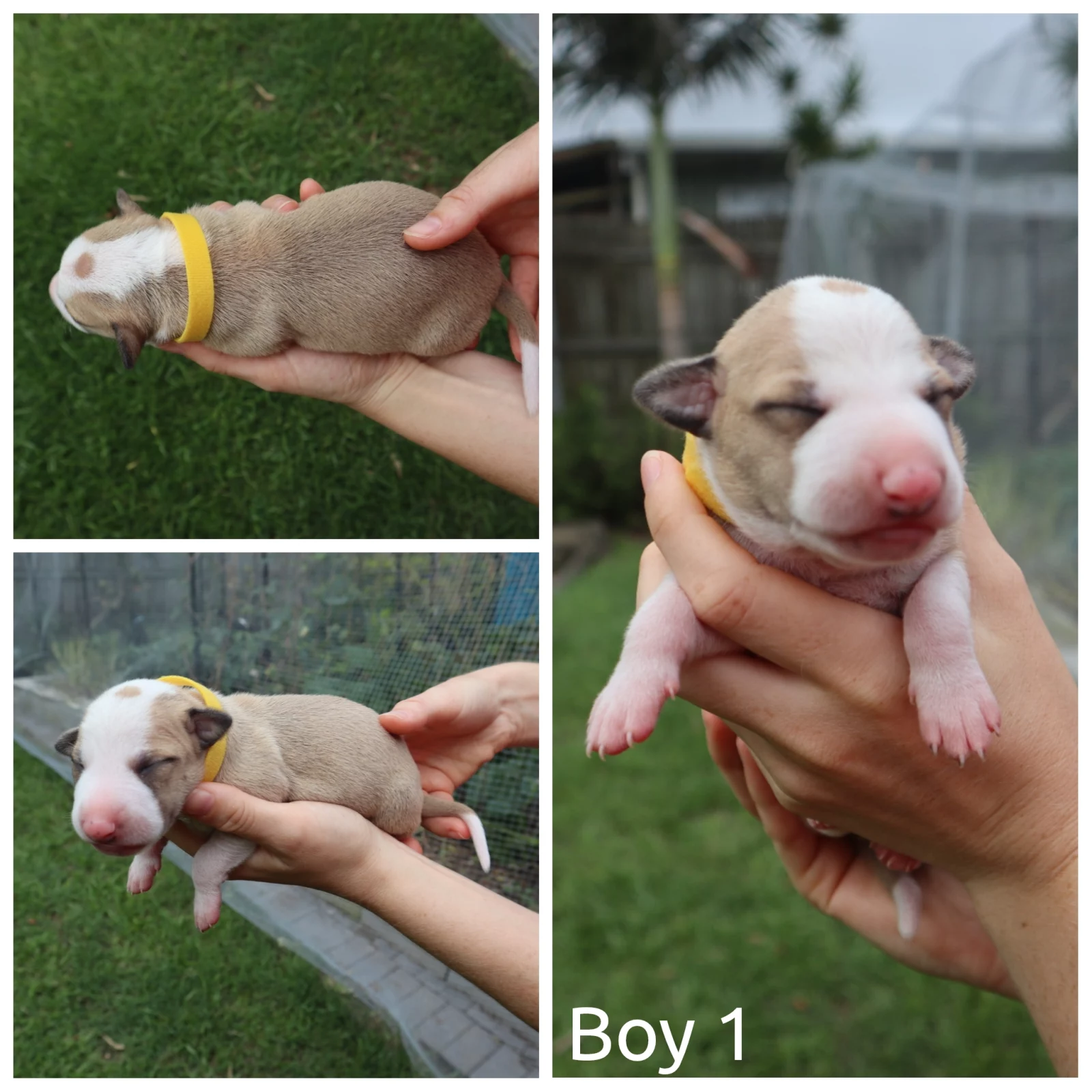 Boy 1: Yellow collar, the most fawn in colour, dot on head like father, name Sonny (pronounced Sunny), bright friendly personality