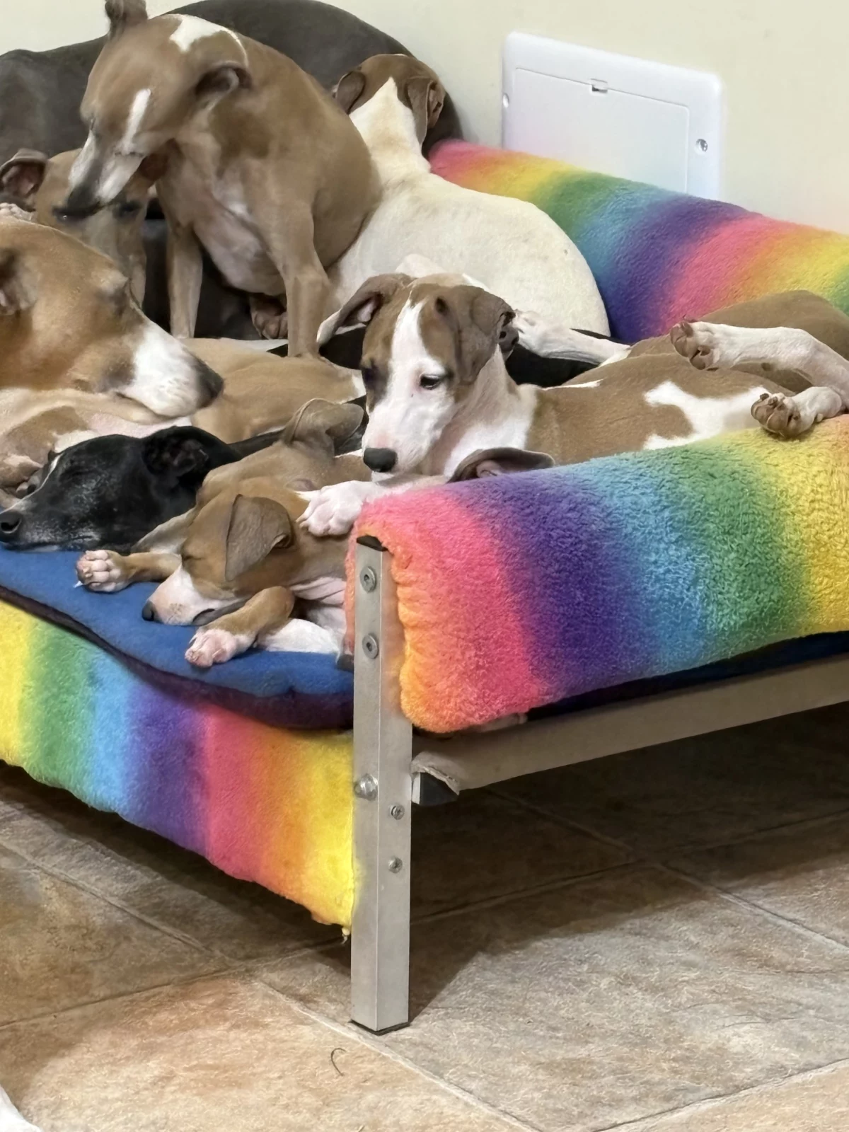 Dogs have access to: warm bedding, water at all times, ample space to exercise, natural light