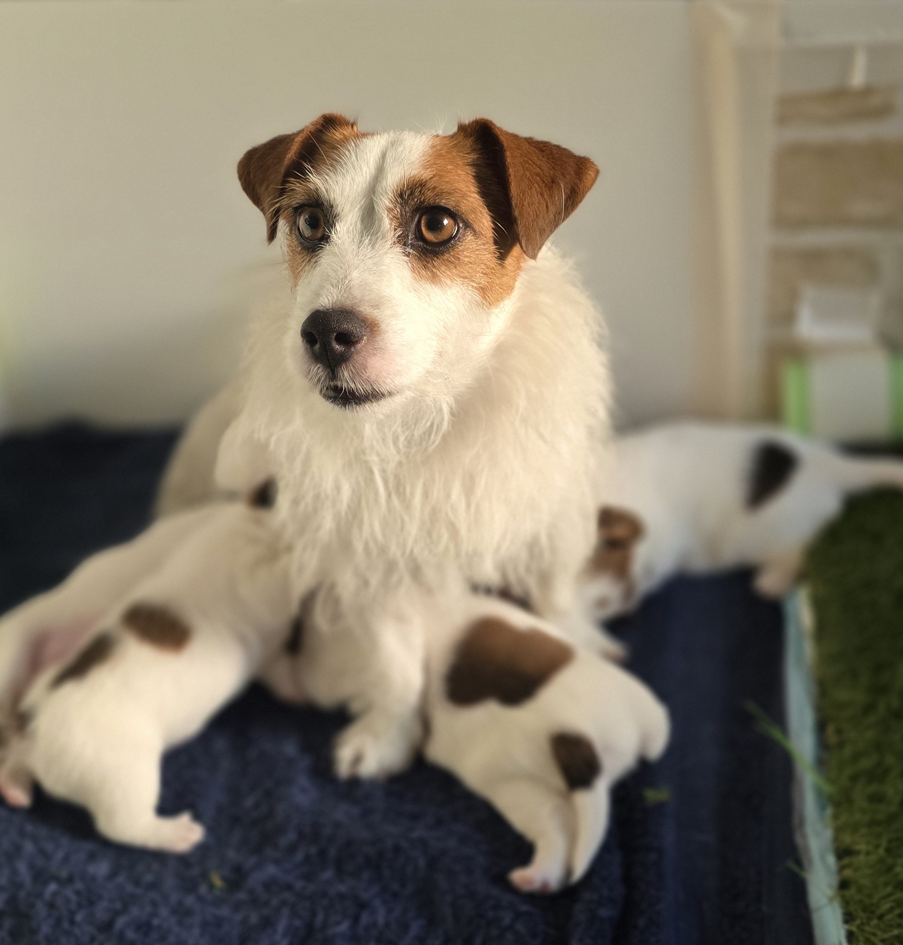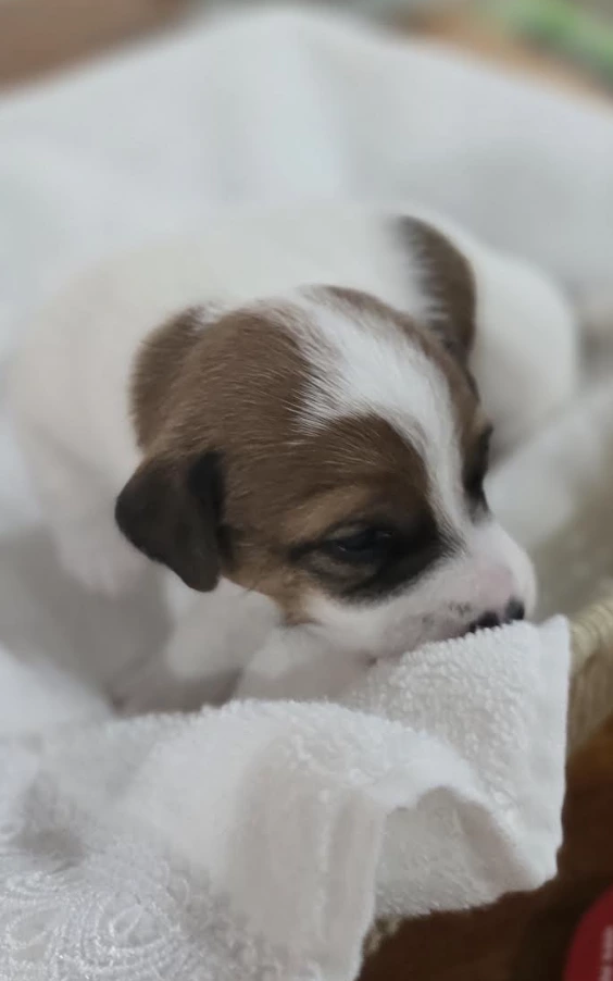 Our mum is Candy a broken coat JR. The Dad is Zac a smooth coat. We chose the pairing due to their chilled nature which is a good thing in Jack Russel world. One boy is the spitting image of his dad and very chilled. The other boy will be the largest and very playful and is now going to a new home. One girl is taken and the smallest white face girl is independent and rules over her brothers. She has spunk. All love cuddles and are very good at entertaining themselves.