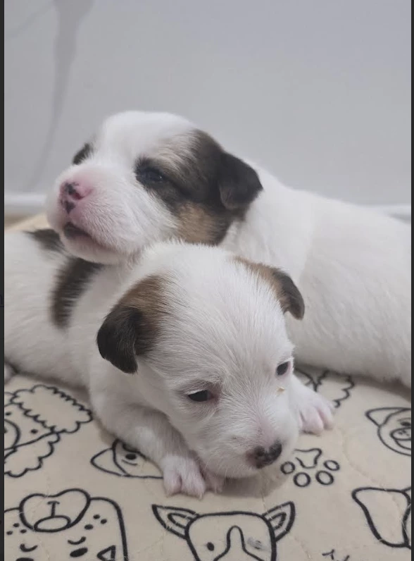 3 white and tan Jack Russel puppies. Two boys and one girl. Ready for new homes from the 2nd December when they will be 8 weeks old. (One boy and one girl are now sold. so only one boy left)