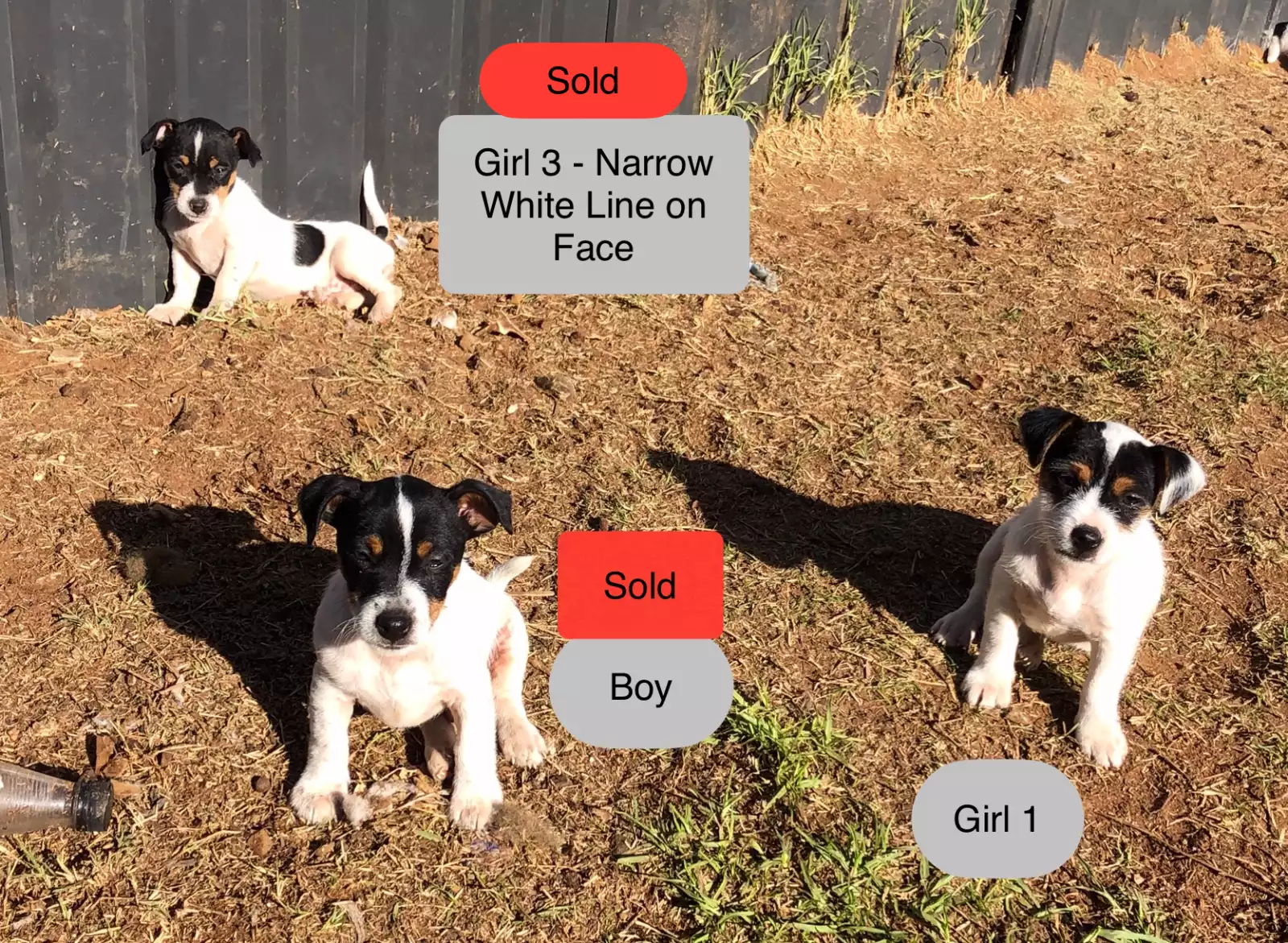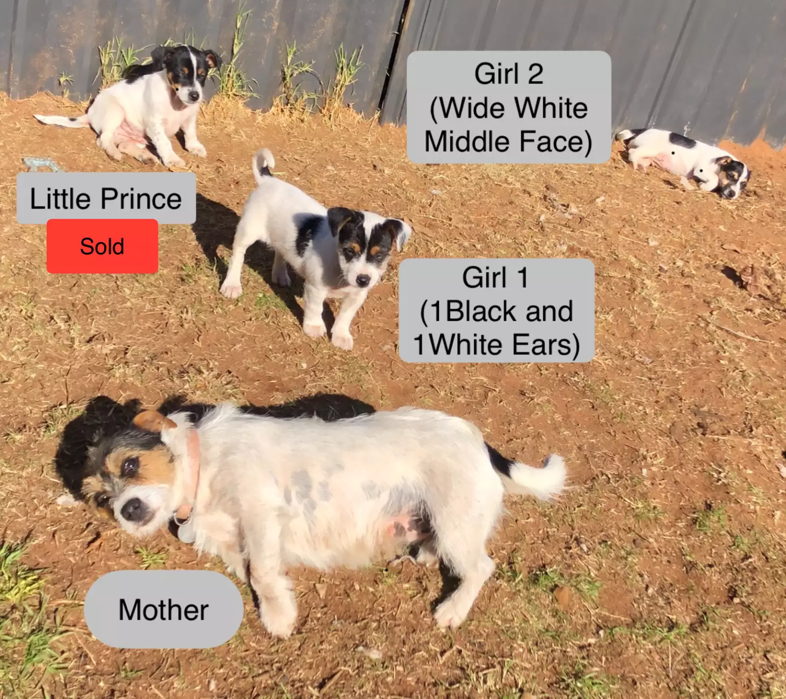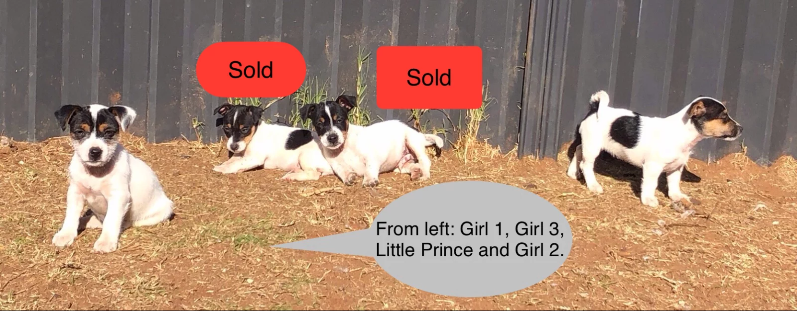We have two young male Jack Russells, aged one and two years old, along with two ten-week-old female puppies, all looking for loving homes. The dogs currently available are Girl 1, Girl 2, Male 1, and Male 2, each with the lively and affectionate nature the Jack Russell breed is known for.
