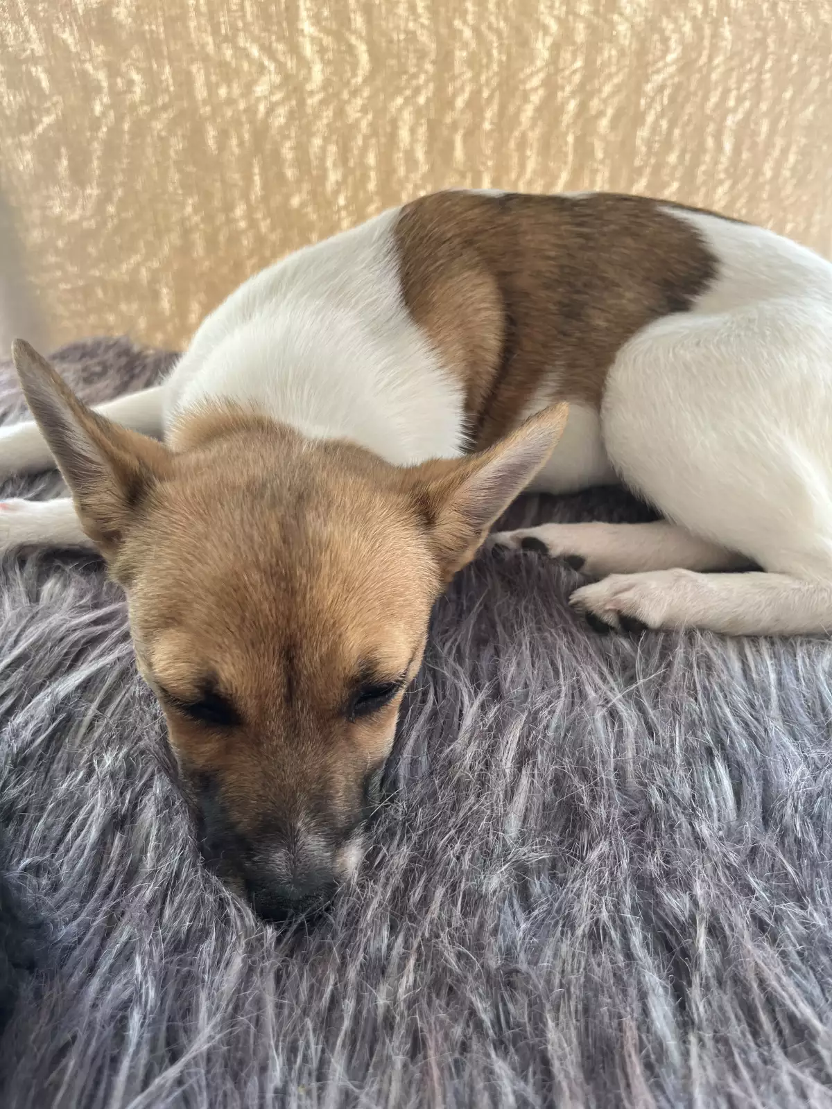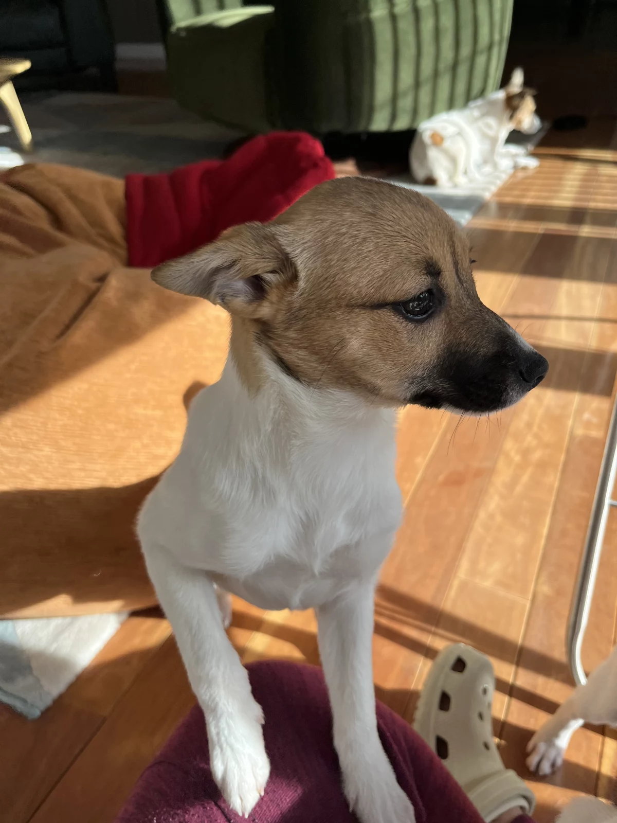 She plays happily with her sisters and has a bright, positive energy, showing both the playful nature of the Jack Russell and the gentle temperament of the Japanese Spitz.