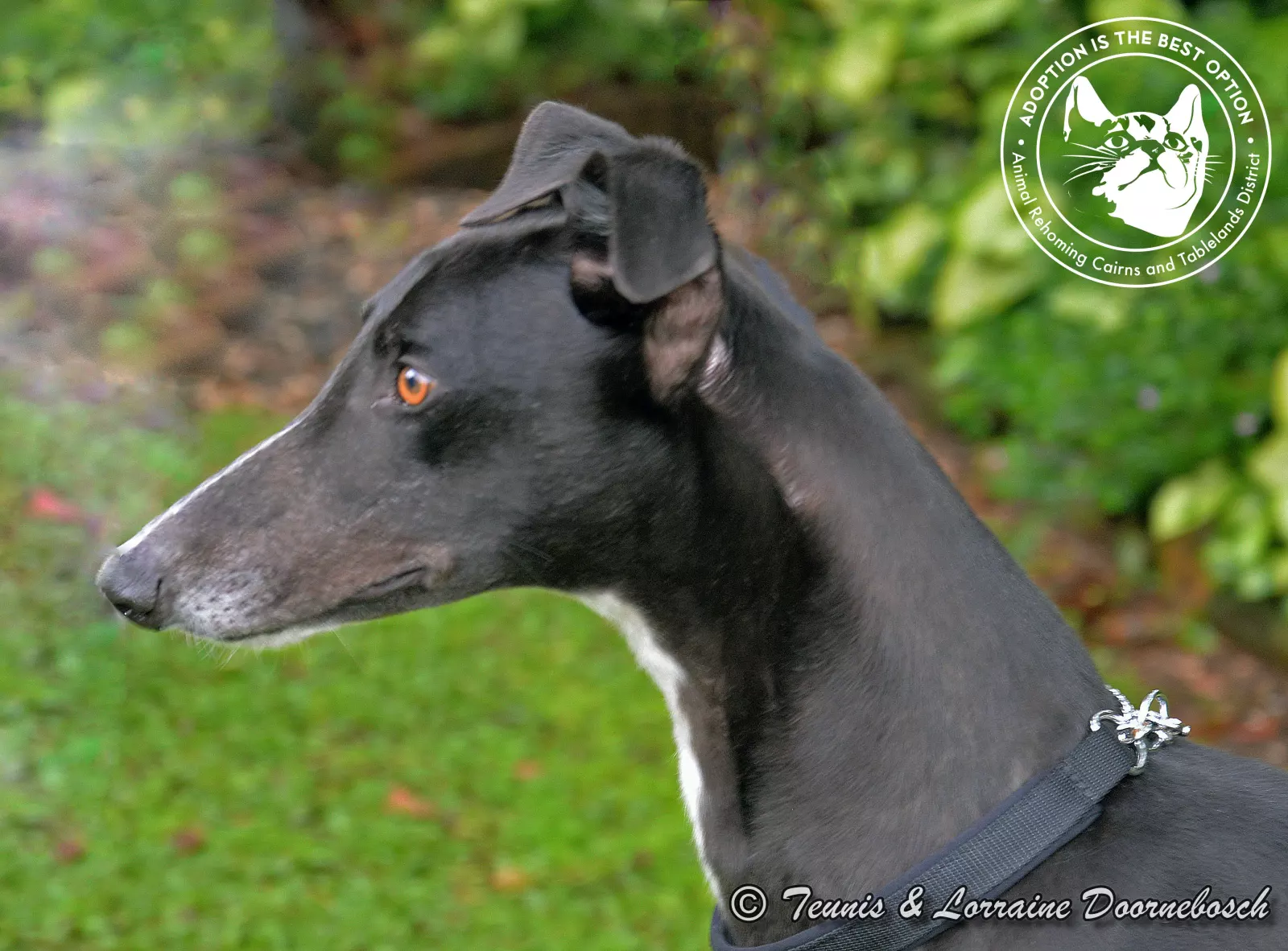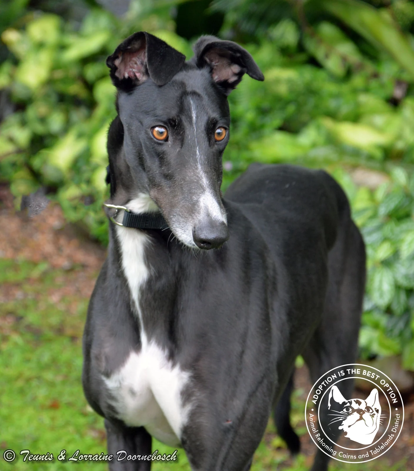 When it comes to describing Jason, we can't think of a better phrase than "the perfect pet Greyhound". Jason has the most gentle nature, gets on really well with all dogs, small to large and is even cat friendly. He's only a young lad, so a little bit over enthusiastic about being alive but very easily calmed. Most Greyhounds look stunning when they're alert but this boy has the wow factor. In fact he reminds us of a Friesian stallion when something attracts his attention and he stands stretching his lovely long neck as high as he can so as not to miss anything. He's just so beautiful both in nature and to look at. We feel he would be OK with children although, because of his size, maybe he would overwhelm littlies. But, he definitely would benefit from being with a family with savvy kids and other pets as he adores having company and someone to be following right behind. Velcro dog when you're with him, but not anxious if you're not. He's going to make some lucky family a wonderful companion dog. Jason will come to his new home with a new coat and martingale collar.