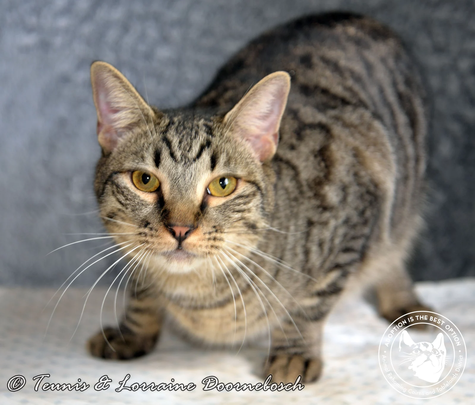 Meet Kane, an endearing feline who is currently available for adoption. With a birth date of February 14, 2022, this Domestic Short Hair is a rather stunning mackerel tabby with captivating orange eyes. Kane may be reserved initially, but given time and patience, he warms up wonderfully. Kane was initially adopted as a kitten, but returned to us a year later due to changing circumstances. His change of environment has contributed to his initial shyness, but with consistent love and respect, his playful side is sure to delight.