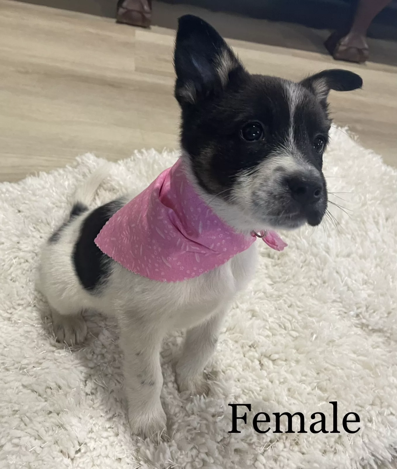 3 x Kelpie (black and white) 2 x Female (Pink and Yellow collars) and 1 x Male (Red collar)