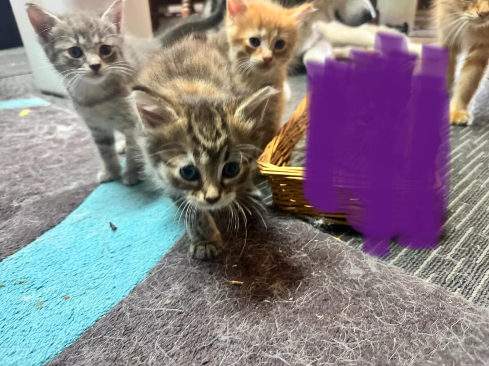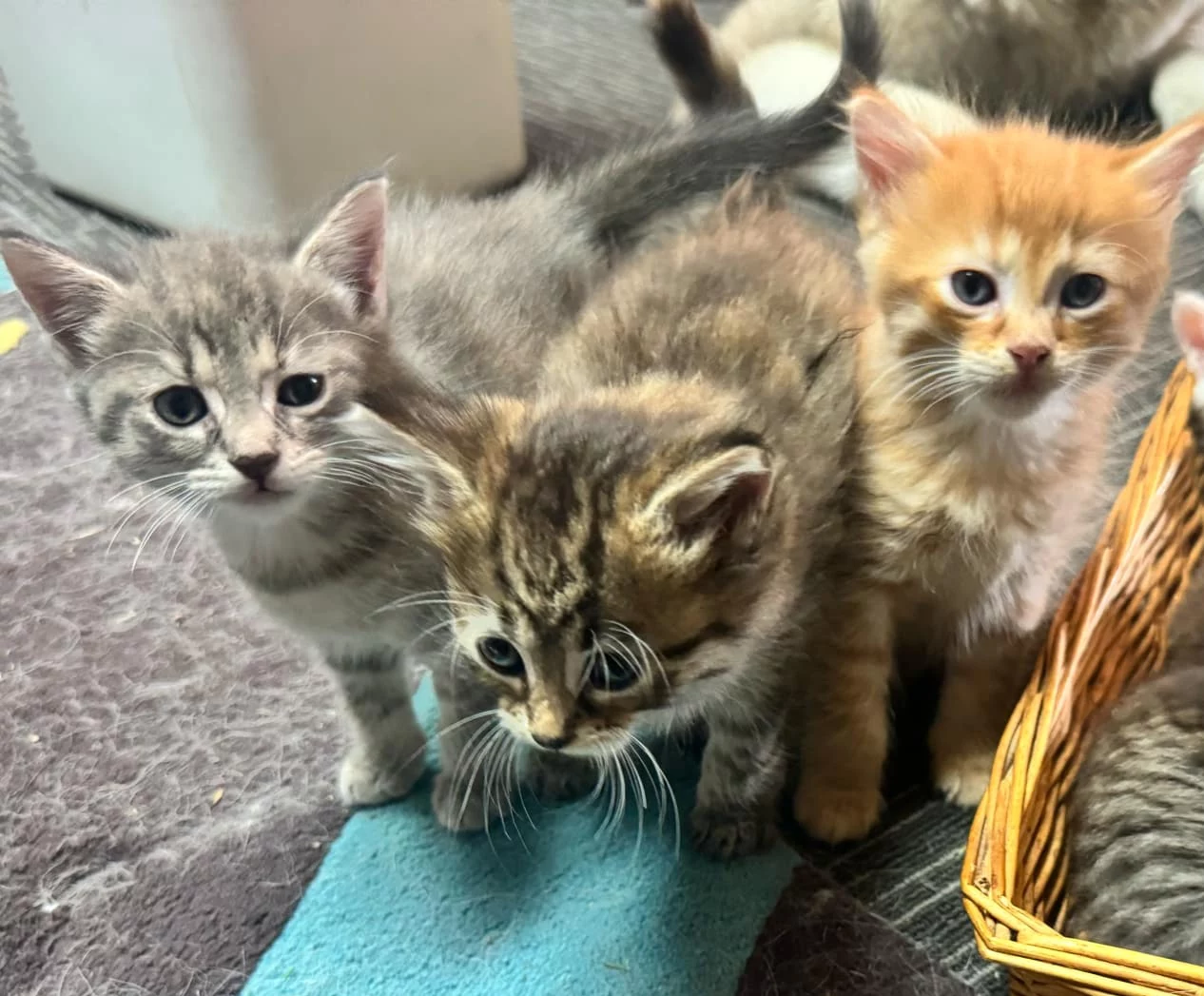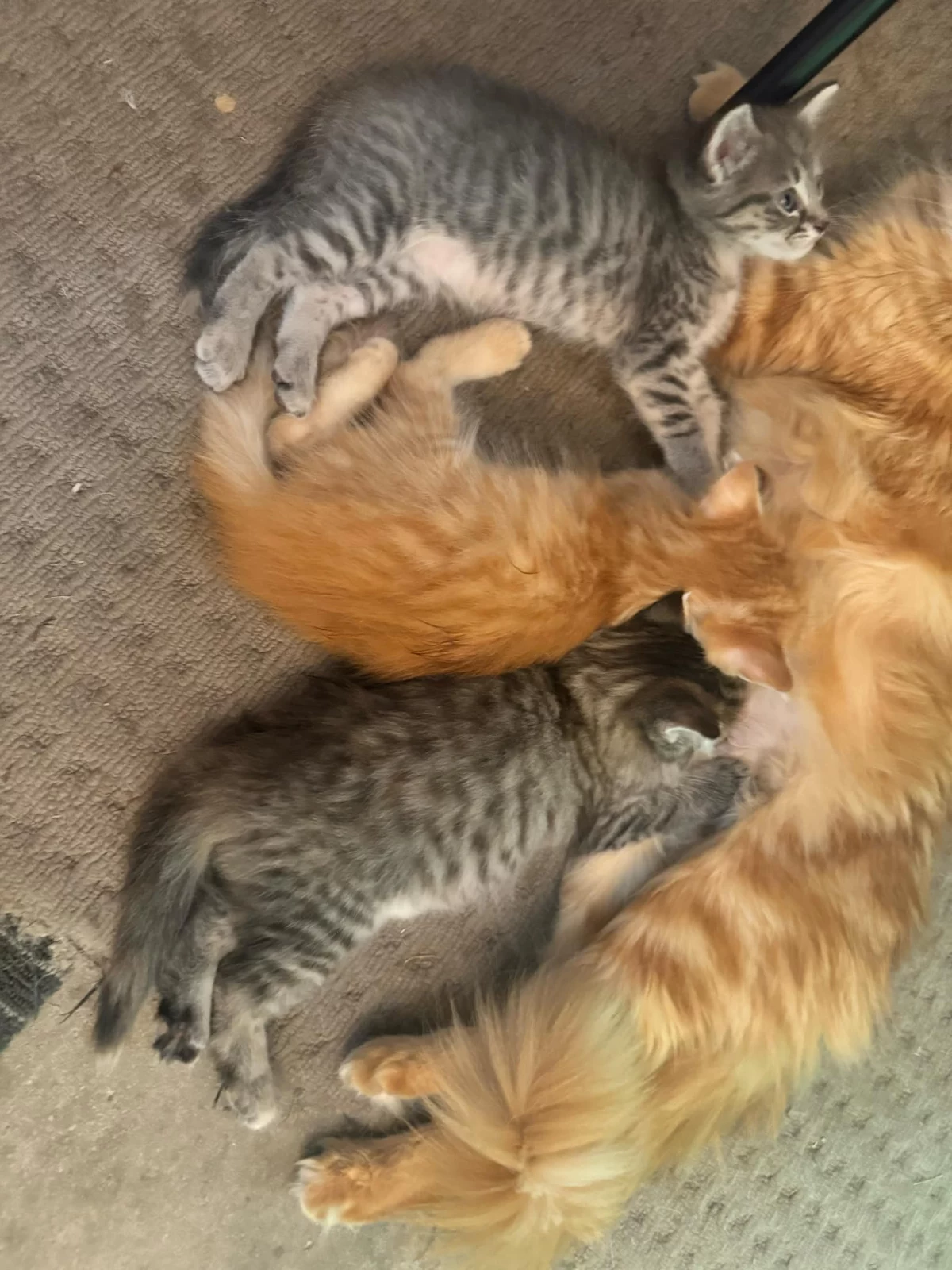 There is a ginger boy, a grey girl and a torbie girl