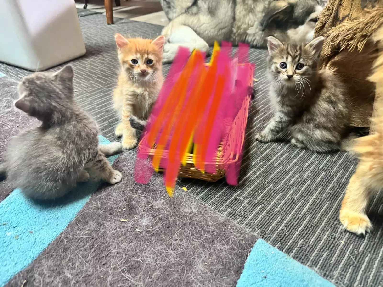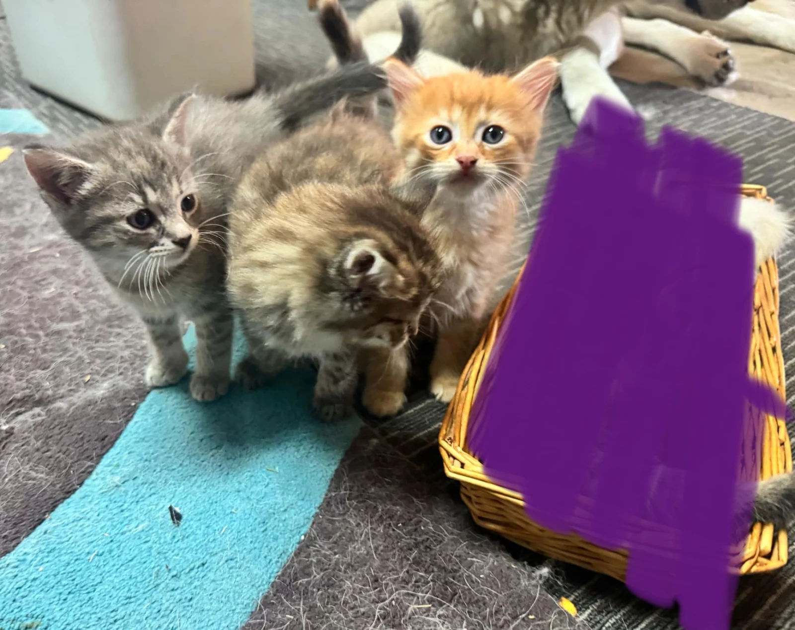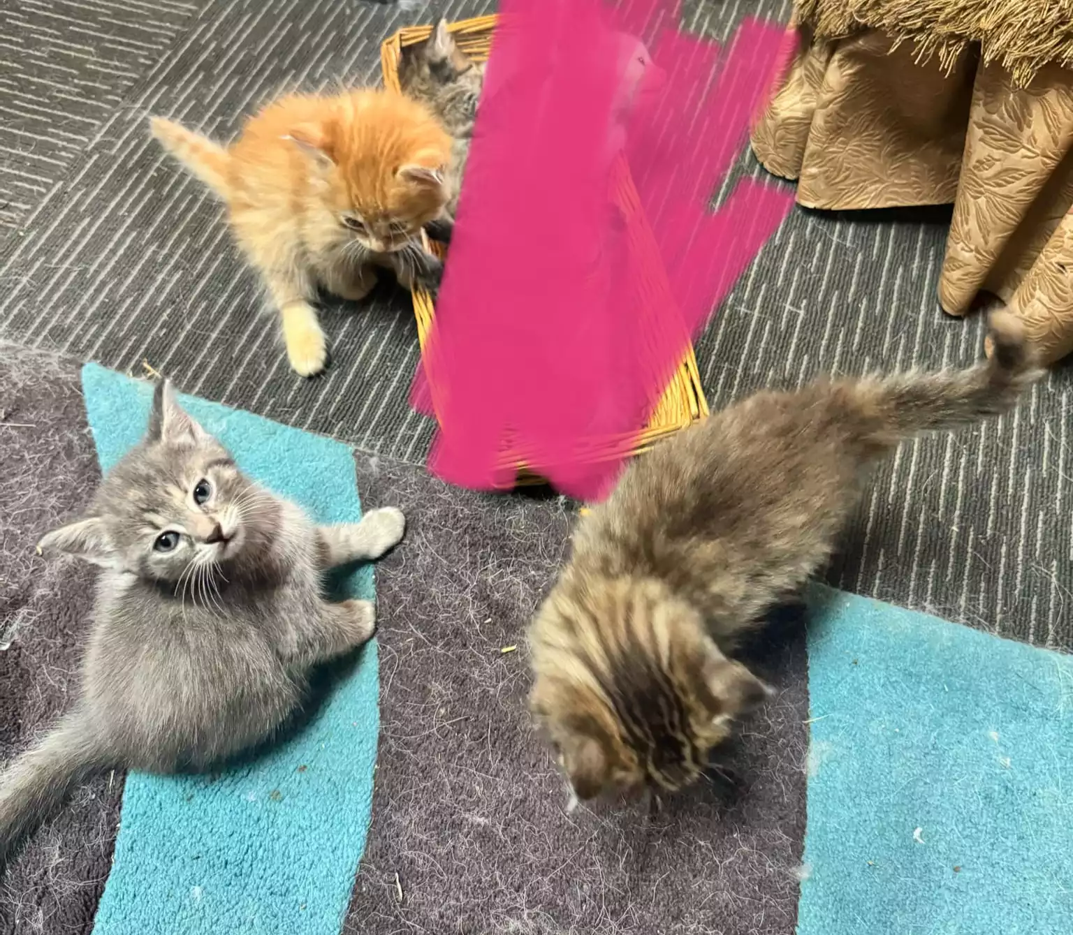 There is a ginger boy, a grey girl and a torbie girl