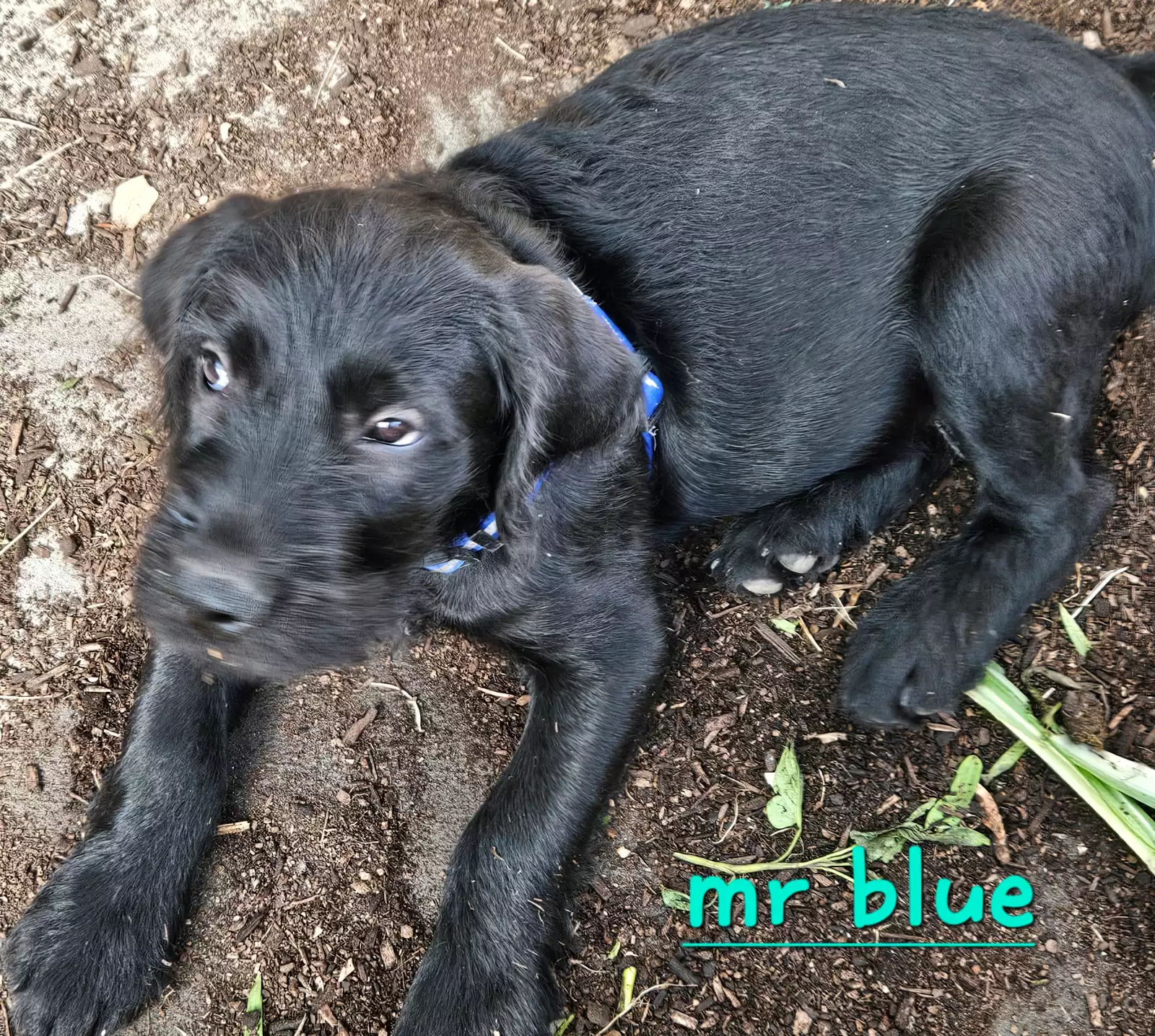 -Blue collar has longer labradoodle fur like a golden retriever and will be fluffy. Hes very Hairy McClary!