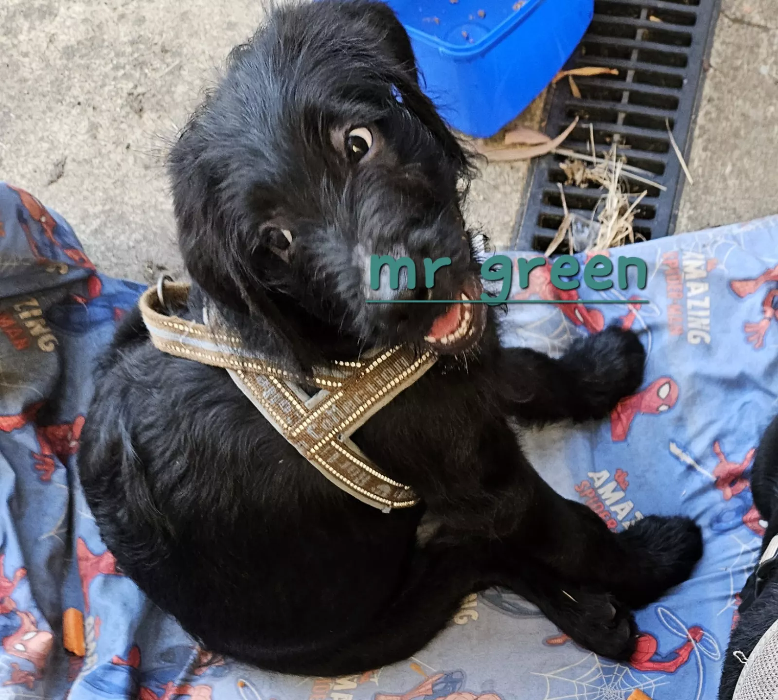 -Green collar boy has longer labradoodle fur and will be fluffy. Mr Green is very much a happy cuddly teddy bear!