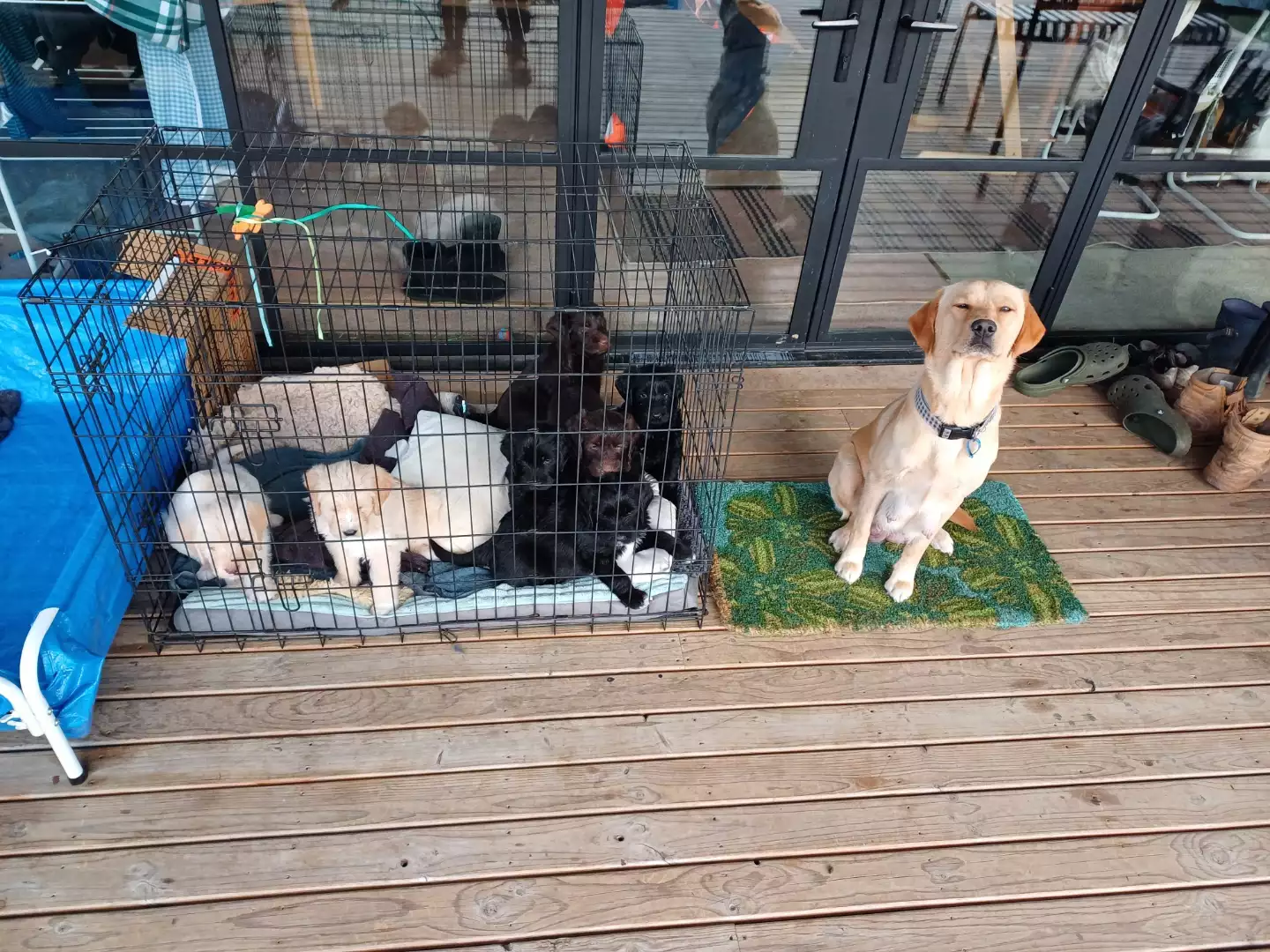 Dogs have access to: warm bedding, water at all times, ample space to exercise, natural light