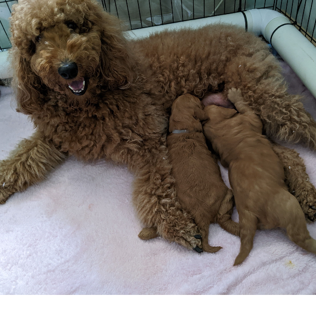 Mum is a red standard Poodle. She loves to play indoor soccer and dance with me (that's with two legs!) Dad is a white/golden Labrador (75%) and Golden Retriever (25%) who enjoys his daily 2 hour walk. He loves to fetch, find and jump. They are my pets. Both DNA tested and cleared of genetic diseases by Orivet. Results are available.