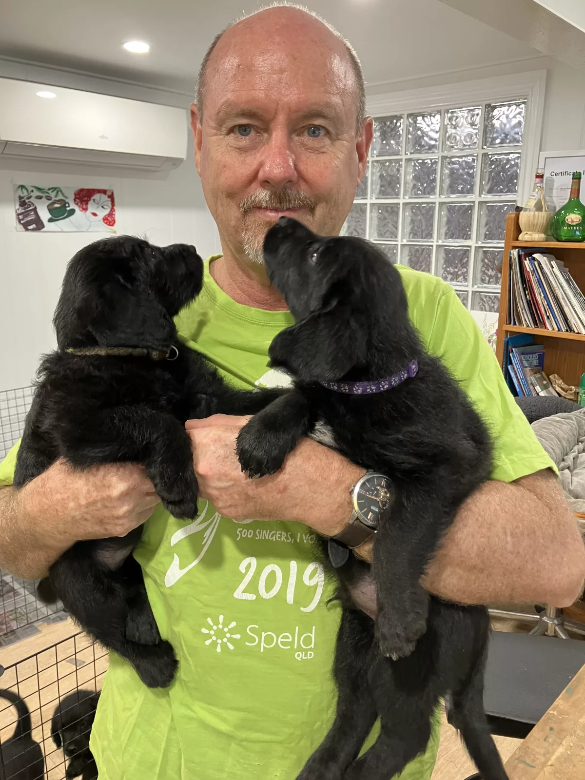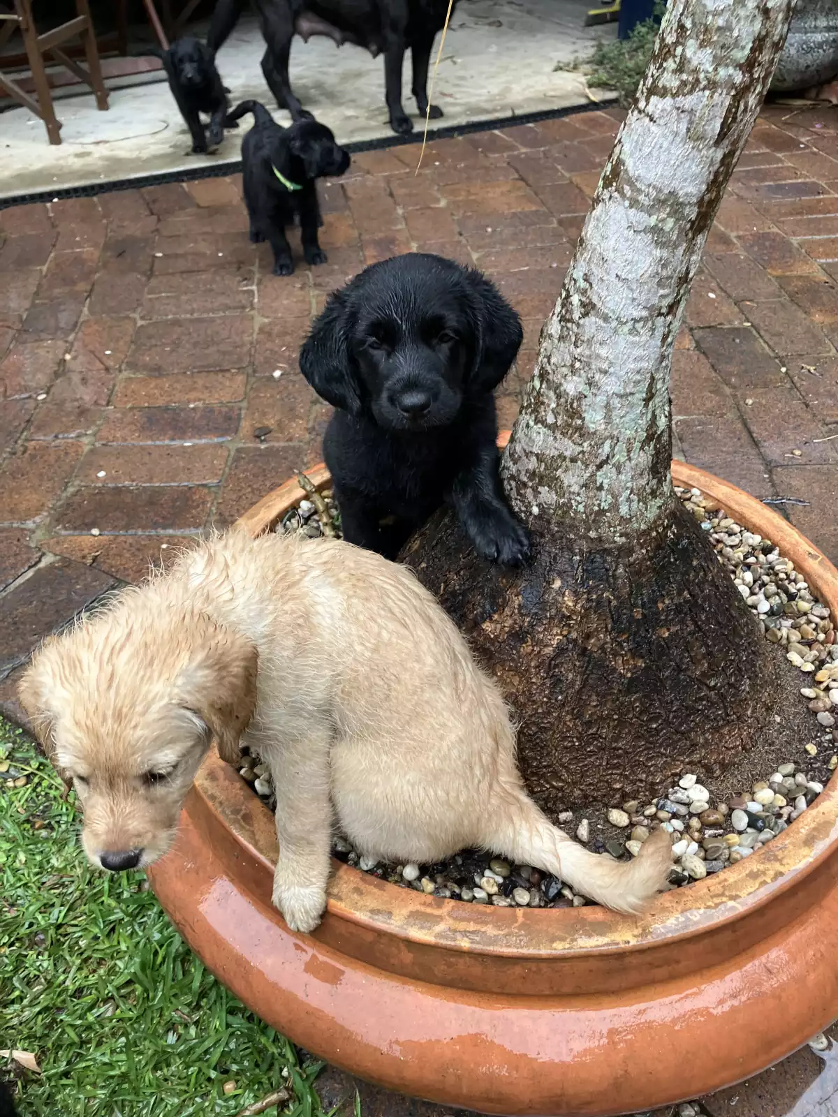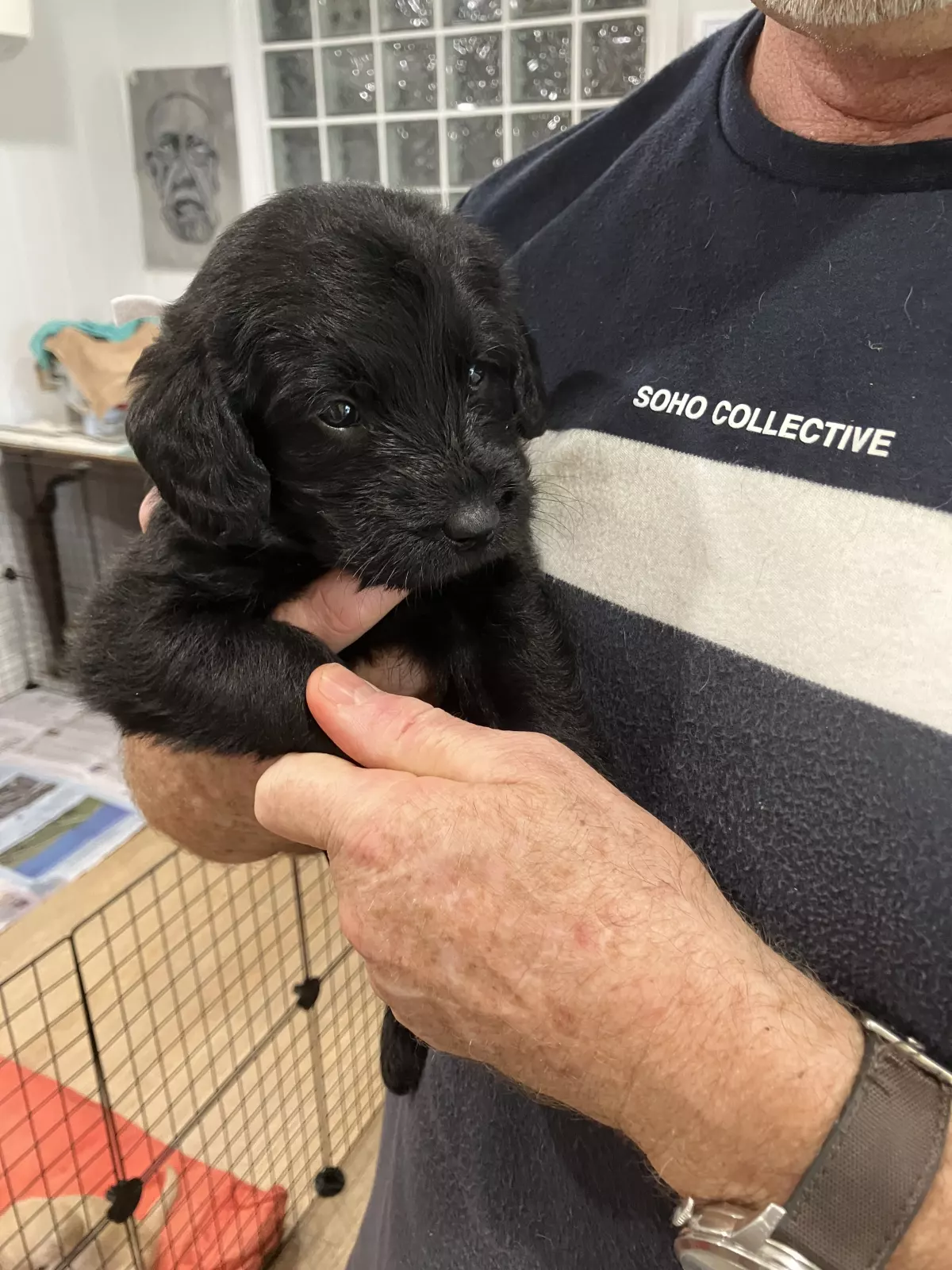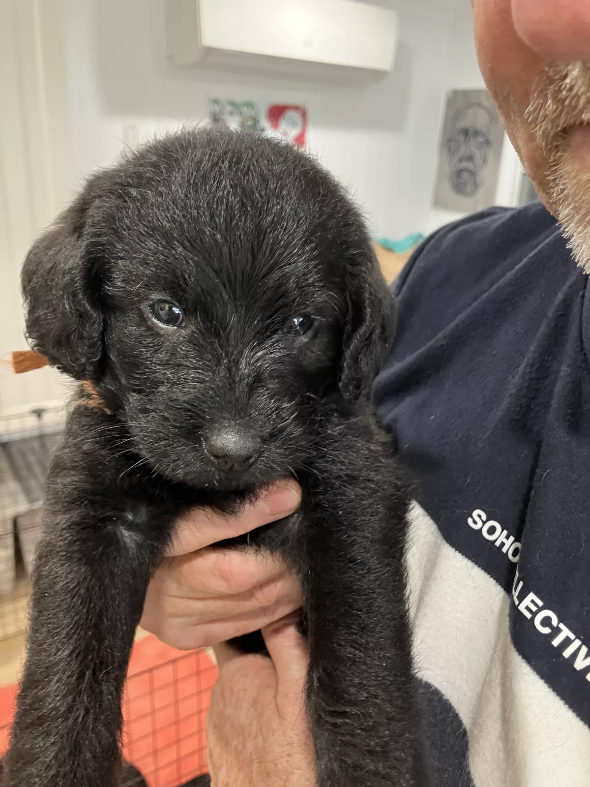 We have 3 black male Labradoodle puppies available from our litter of 9, born on 26th and 27th September. Their mother is a smallish Labrador, and their father is a miniature Poodle. Both parents have been DNA tested to ensure no genetic issues, and both parents, along with the puppies, have been vet checked, wormed, microchipped, and vaccinated.
