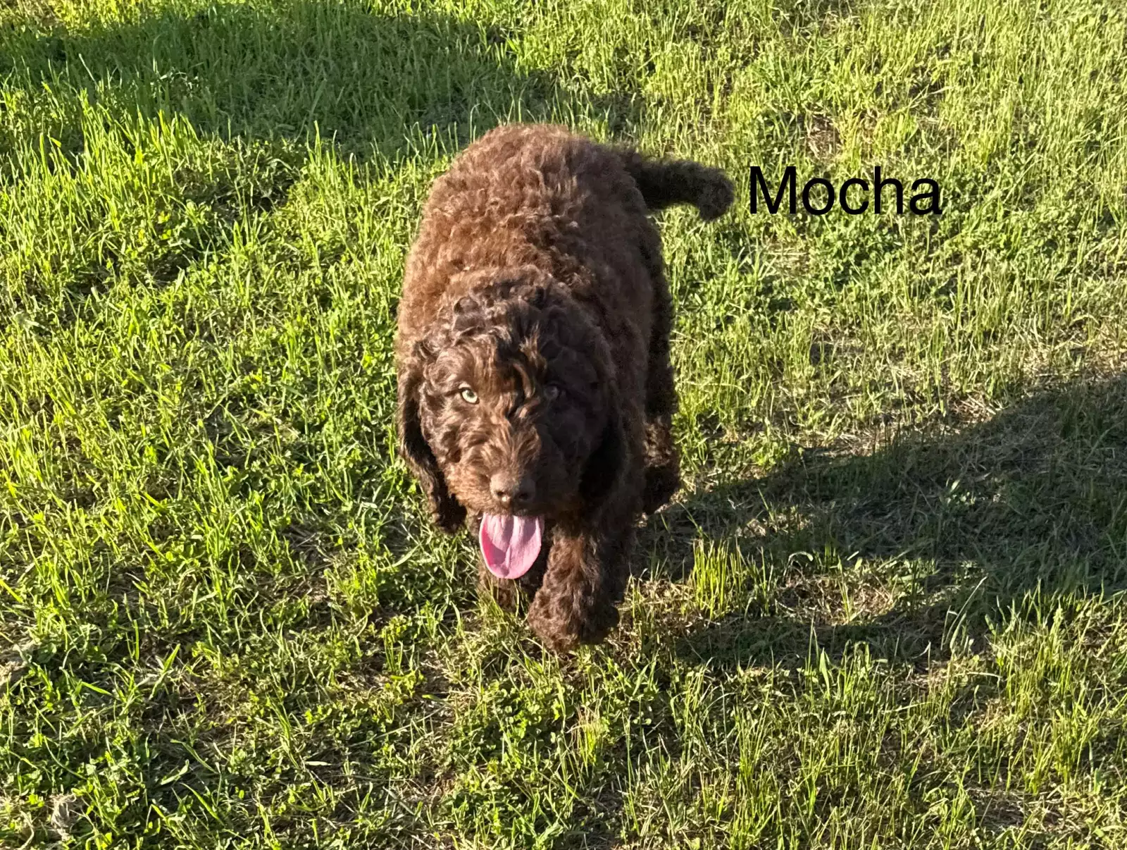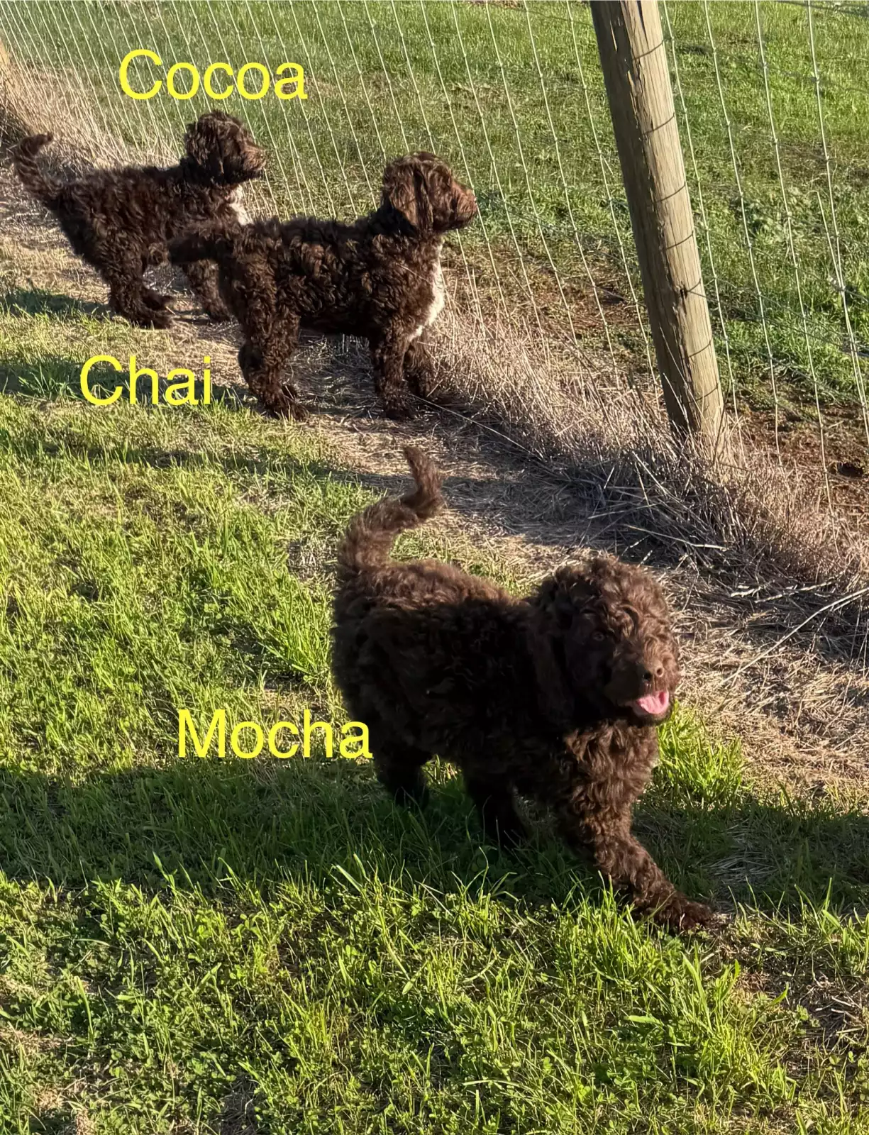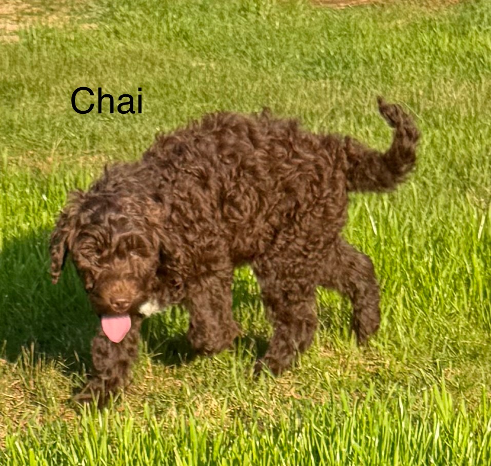 We have two adorable Labradoodle puppies available – 1 male and 1 female. The female is a beautiful chocolate abstract with a soft fleece coat, and the male is a solid chocolate with a wool coat.
