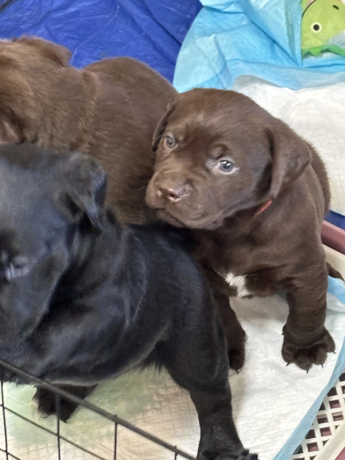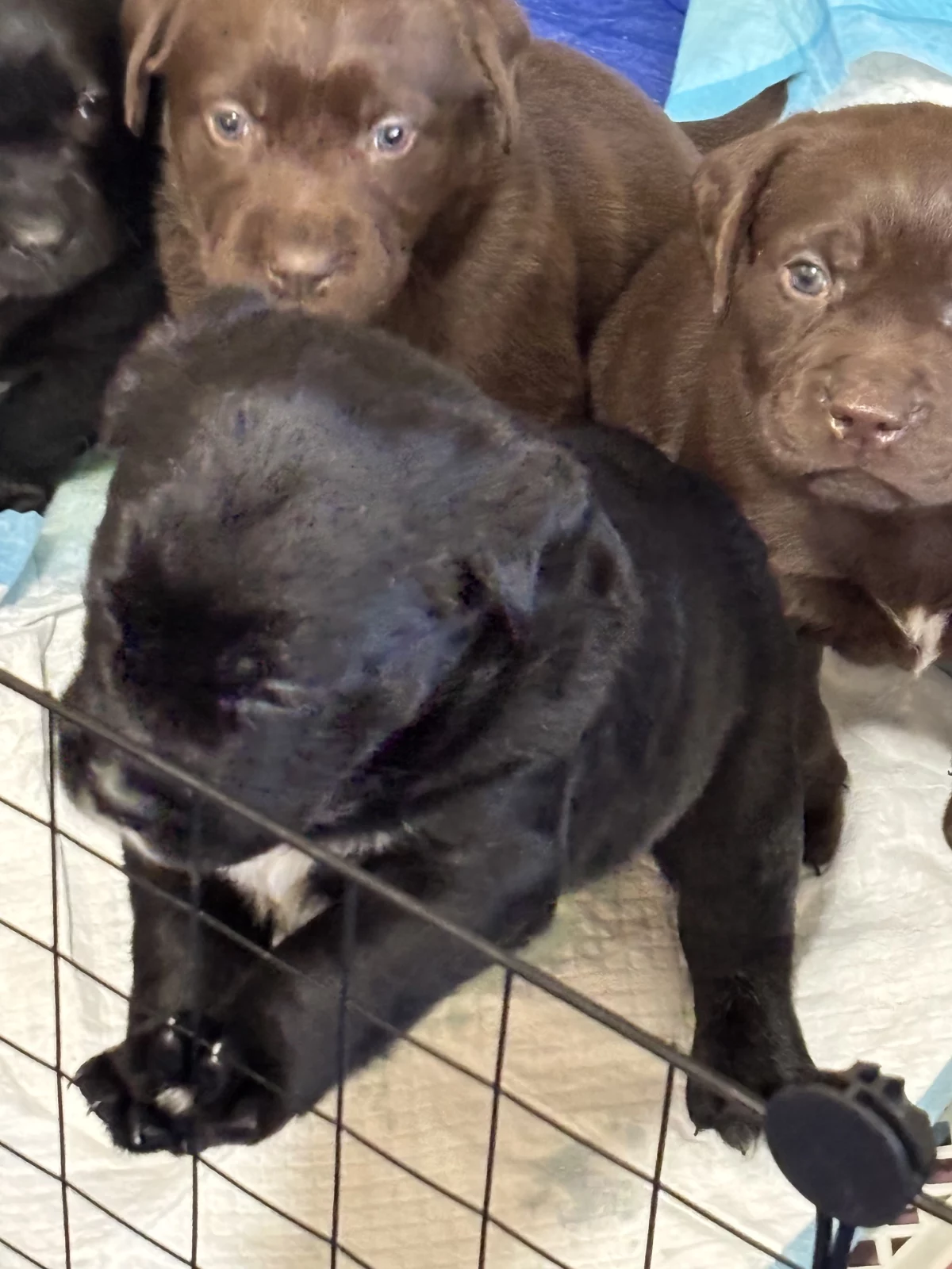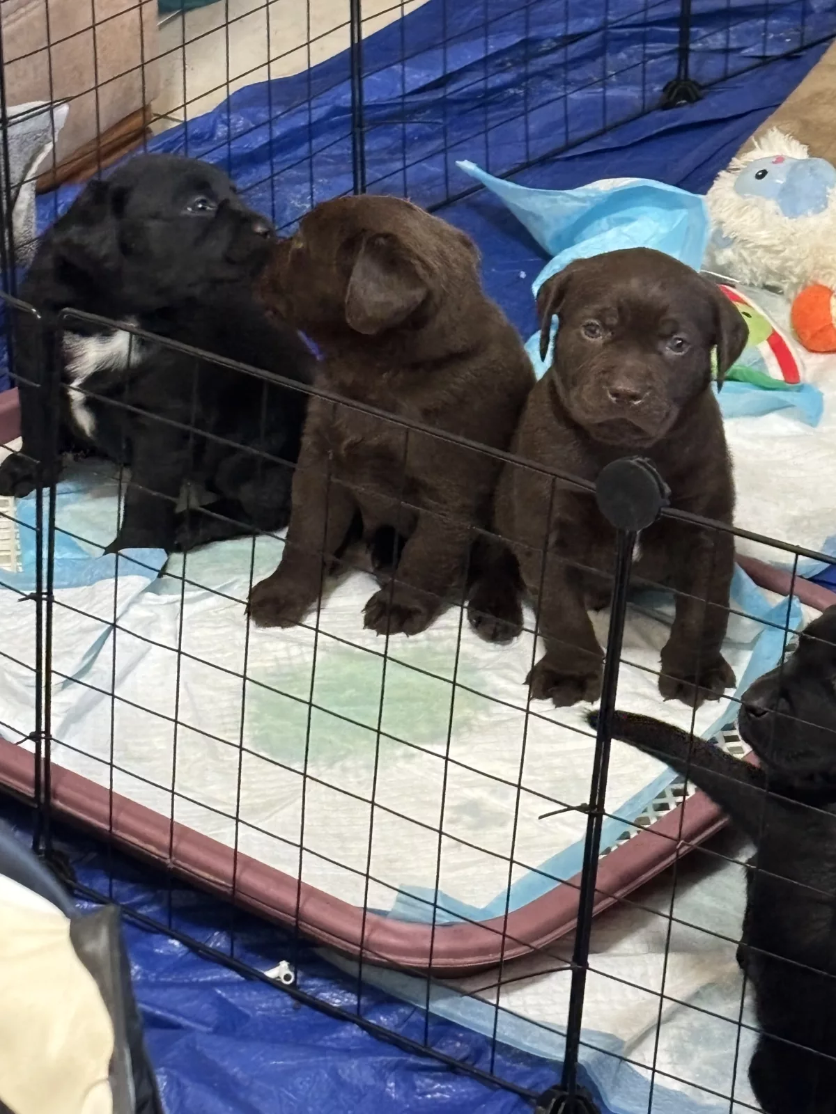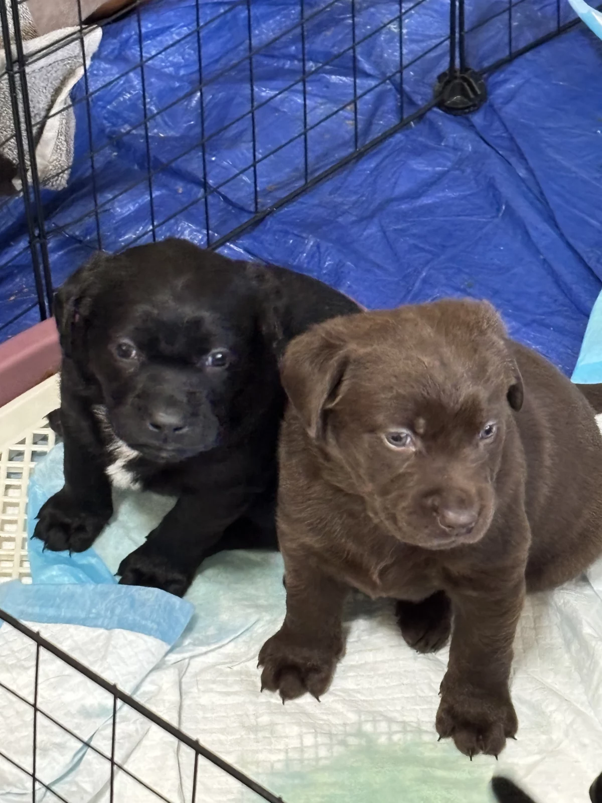 Mum is a calm black Goldador (Labrador x Golden Retriever), soon beginning assistance dog training. Dad is a black Lab with 6% Staffy, making the pups approx. 3% Staffy. Both parents have gentle, loving natures, and dad has been incredibly soft and playful with the pups since birth.