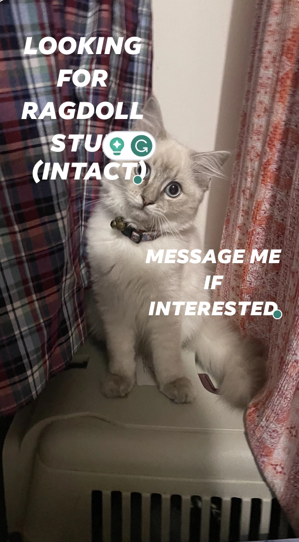 I am looking for a Ragdoll stud for my female Jasmine, Please text me if interested as I do not answer unknown numbers. Feel free to text as well if you have any questions!