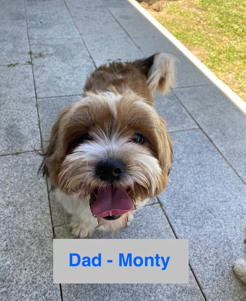 Dad - Monty, is a tan and white Maltese Shih Tzu weighing 9kg.