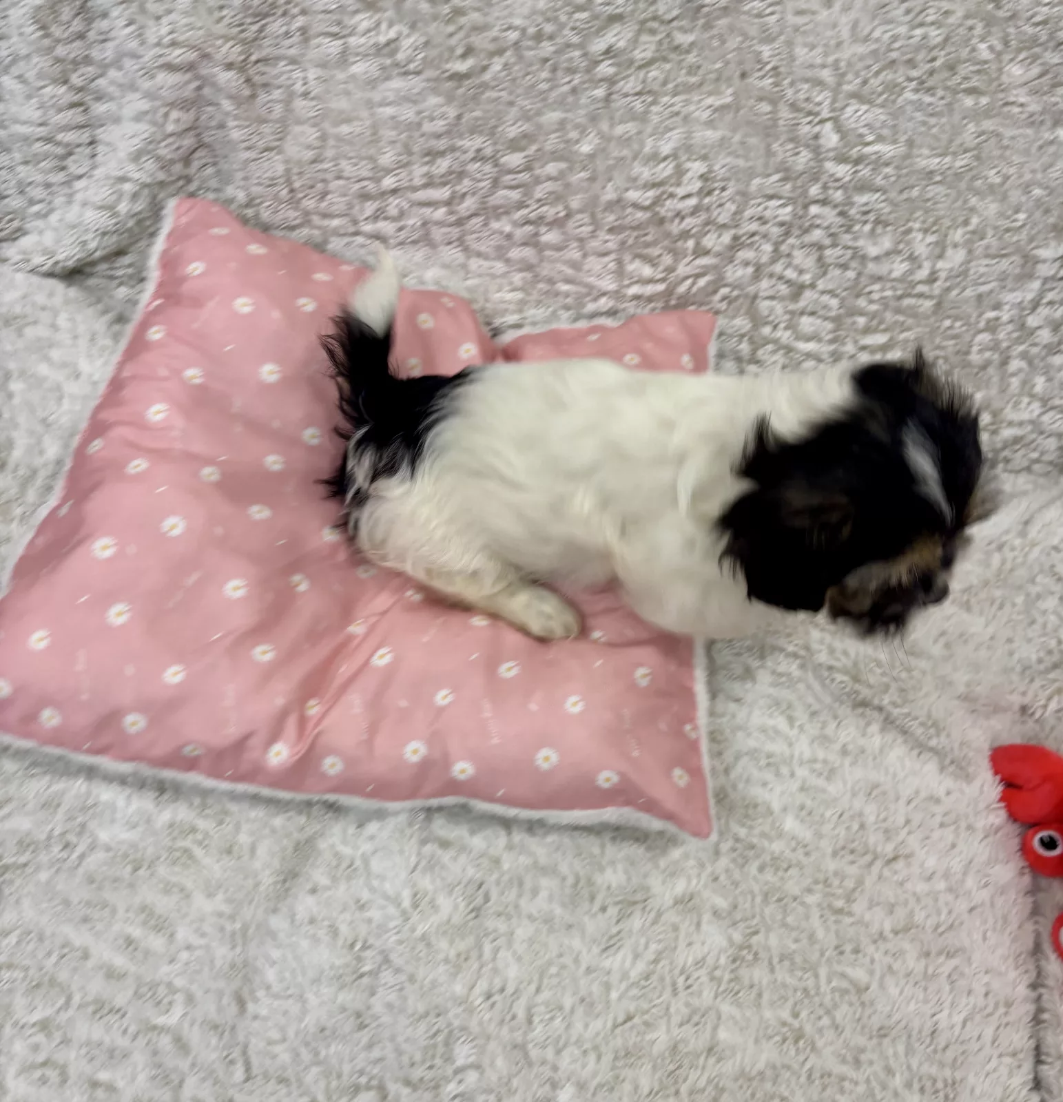 - Sleeping Area: Cozy puppy bed in a quiet room