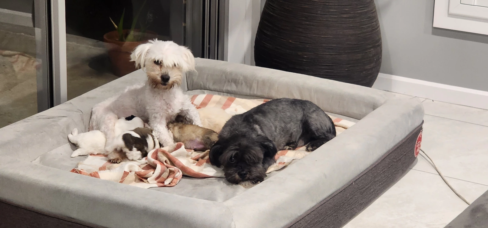 Dogs have access to: warm bedding, water at all times, ample space to exercise, natural light