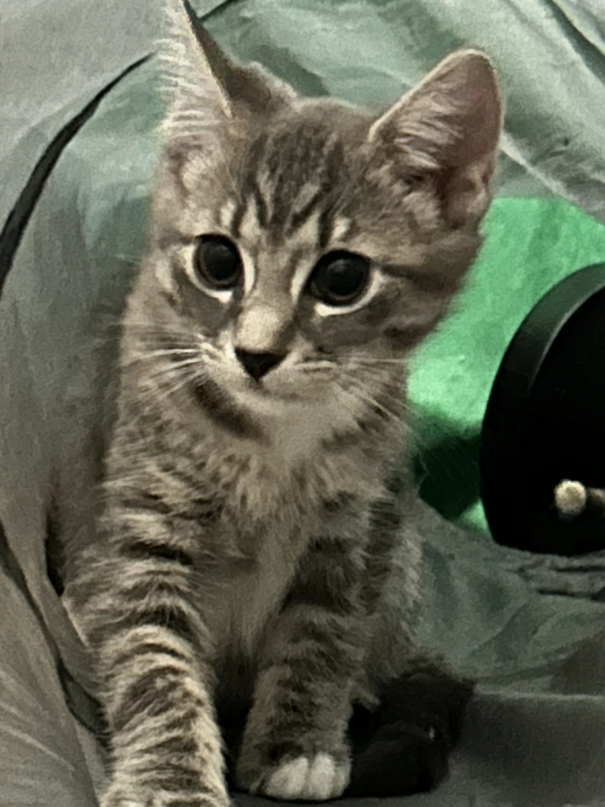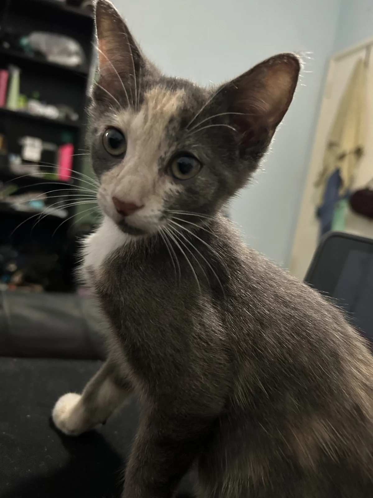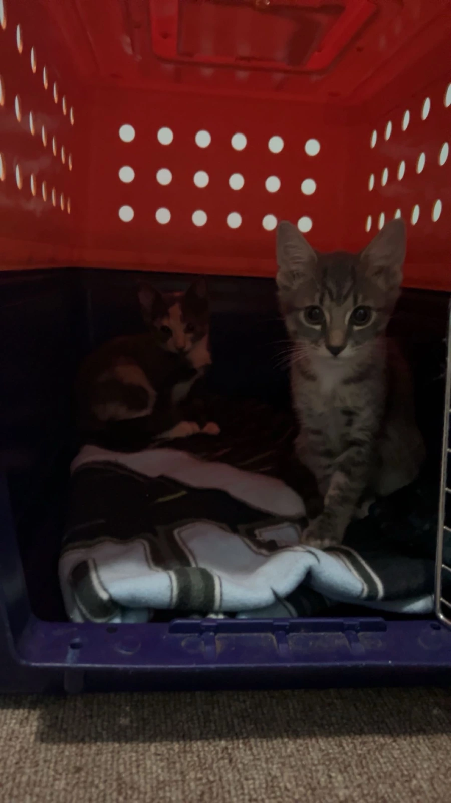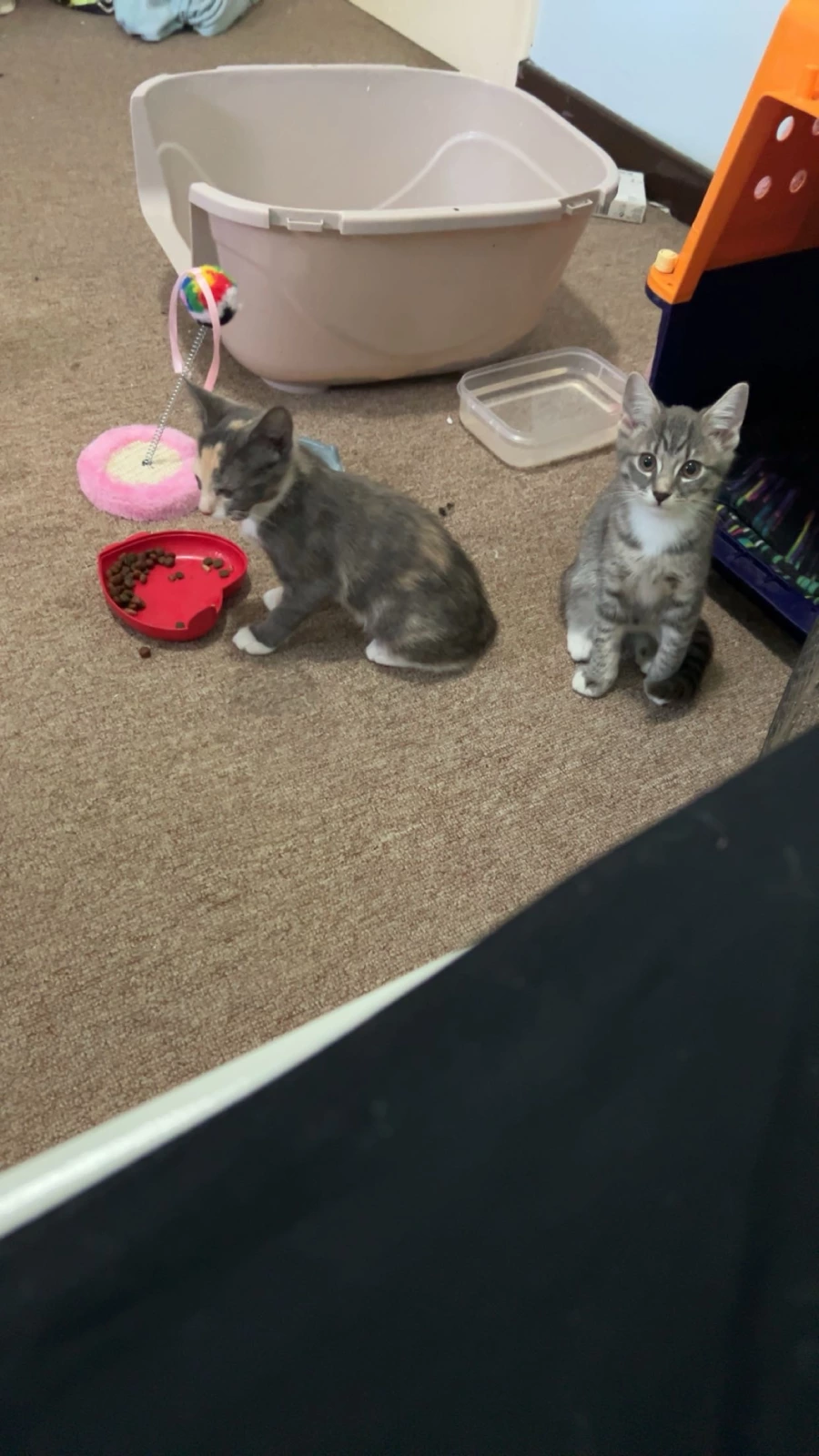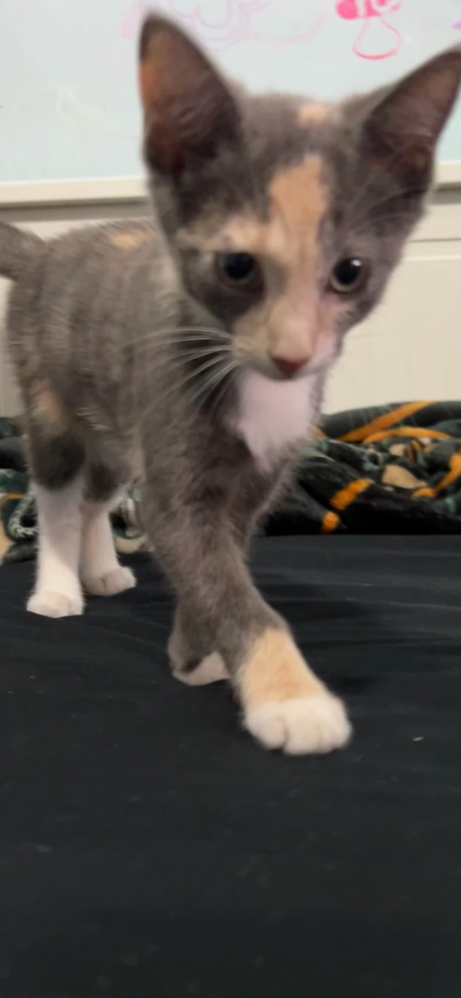 Two female kittens Have not received any vaccinations yet Grey & white is around 13 wks Grey & orange is around 11 wks