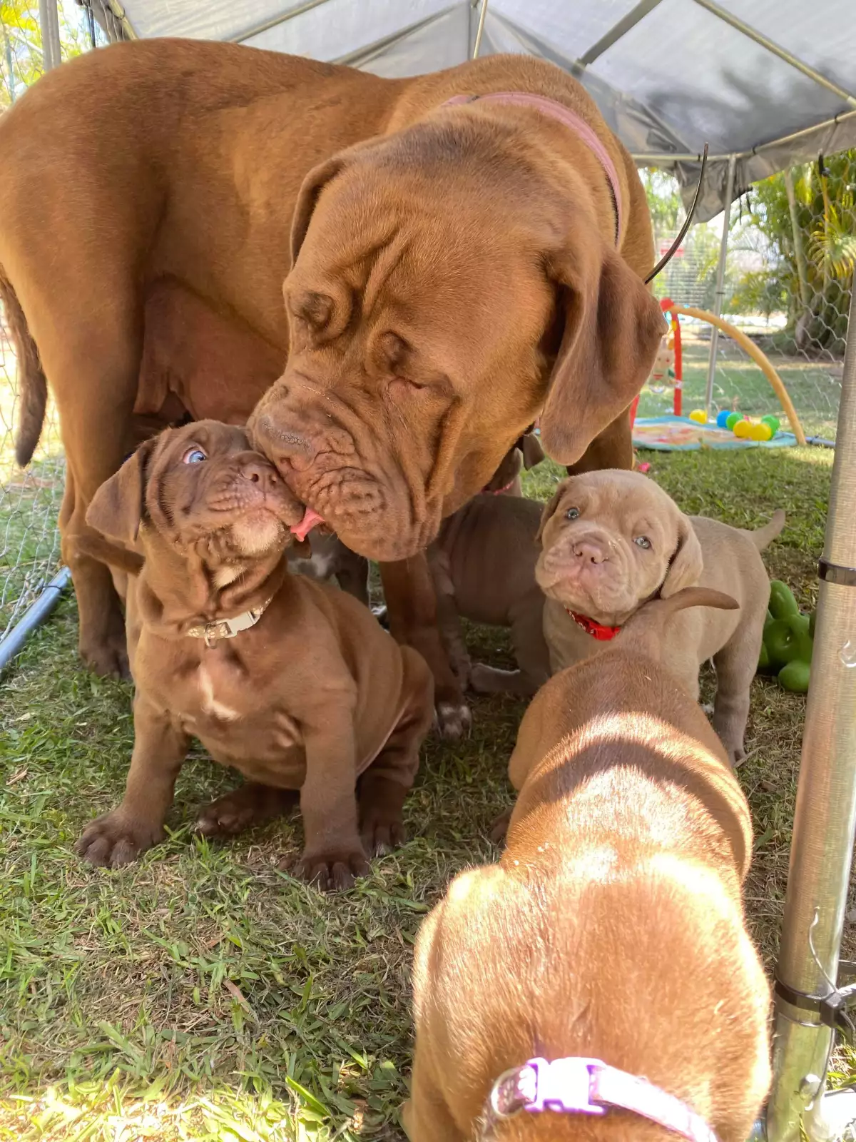 Frank and Beans are proud to announce the arrival of their beautiful 2nd litter. Frank (dad) is a Neapolitan Mastiff, he is fiercely protective of his humans but a gentle giant 80kg lapdog with his family. Beans (mum) is the most amazingly natured ultimate mastiff you could ever meet (approximately 55kg still with growing to do). Their 2nd litter of 10 comprises of 4 boys and 6 girls. 6 are still available for their forever home: