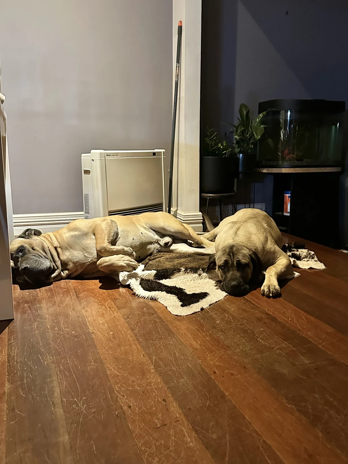 Dogs have access to: warm bedding, water at all times, ample space to exercise, natural light