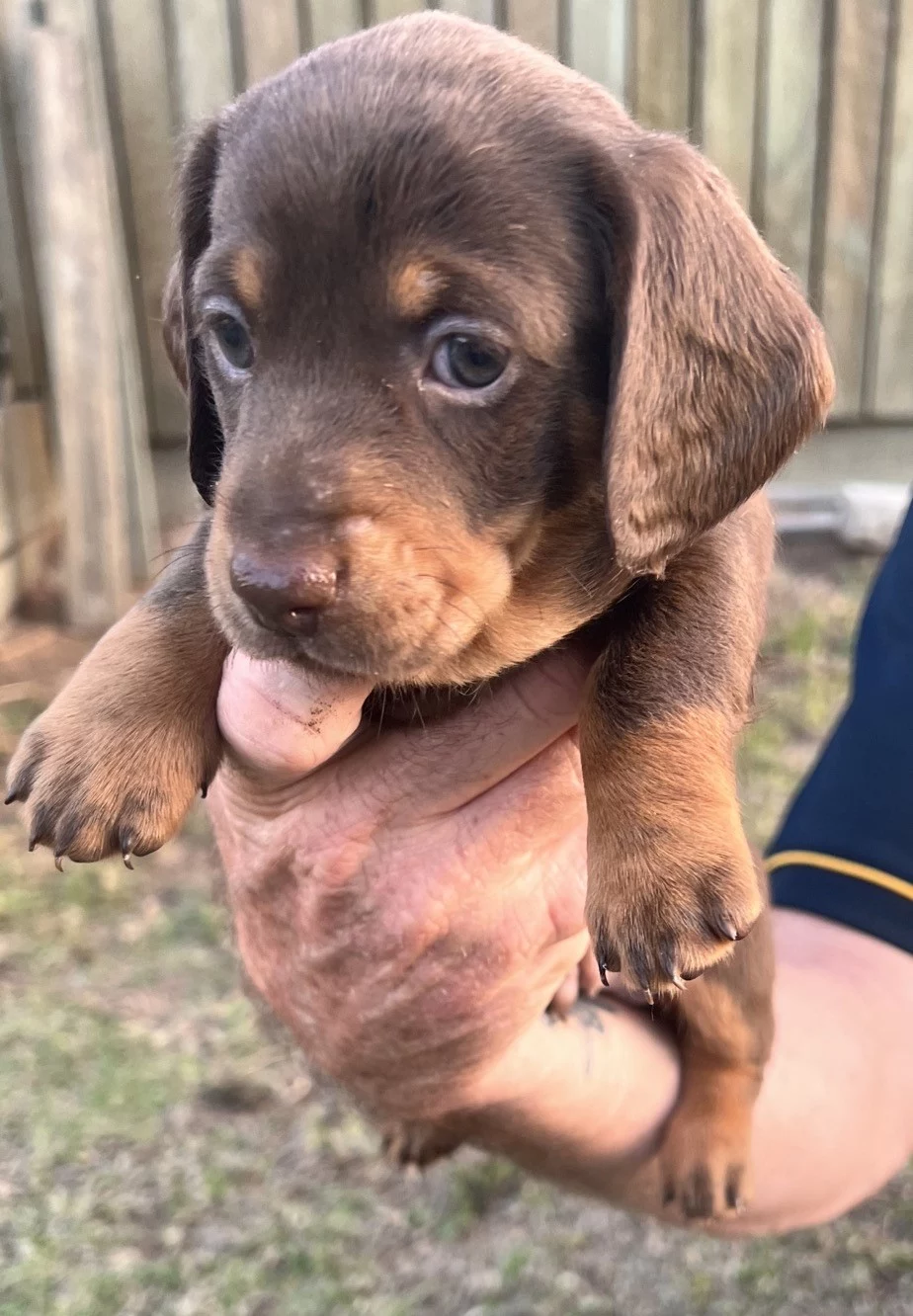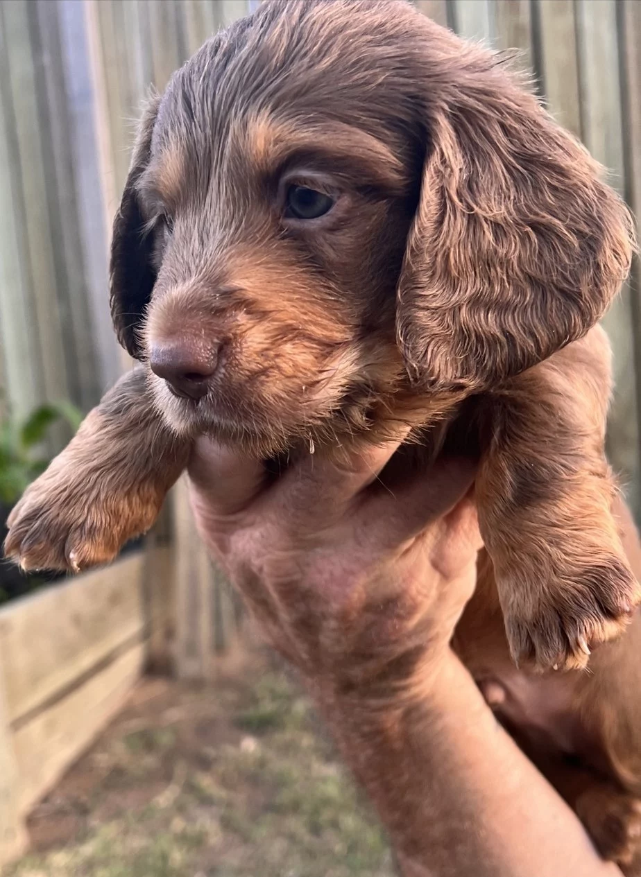Dachshund puppies are now looking for their loving forever homes. These beautiful pups are currently 6 weeks old and will be ready to go from the 9th of October, once they have completed all their early health requirements. They have been raised with care and plenty of daily interaction, helping them grow into confident, happy, and affectionate little companions.
