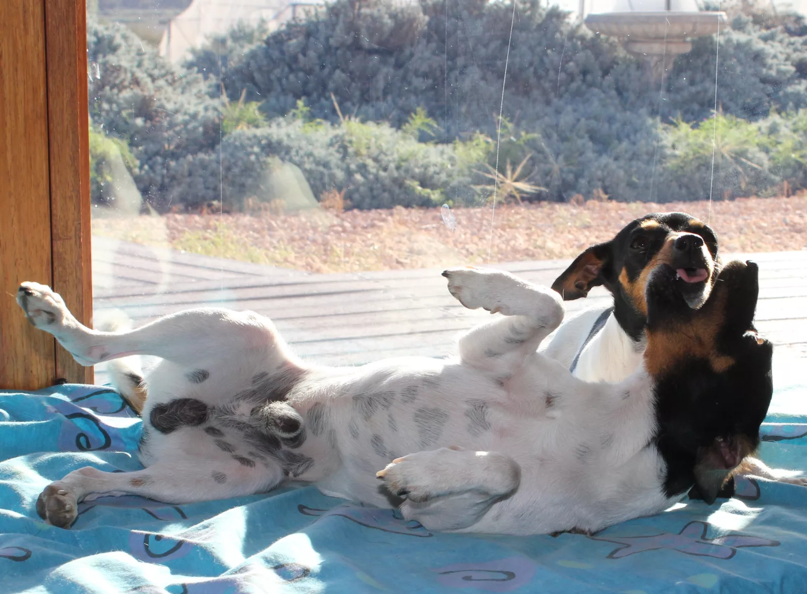 Dogs have access to: warm bedding, water at all times, ample space to exercise, natural light