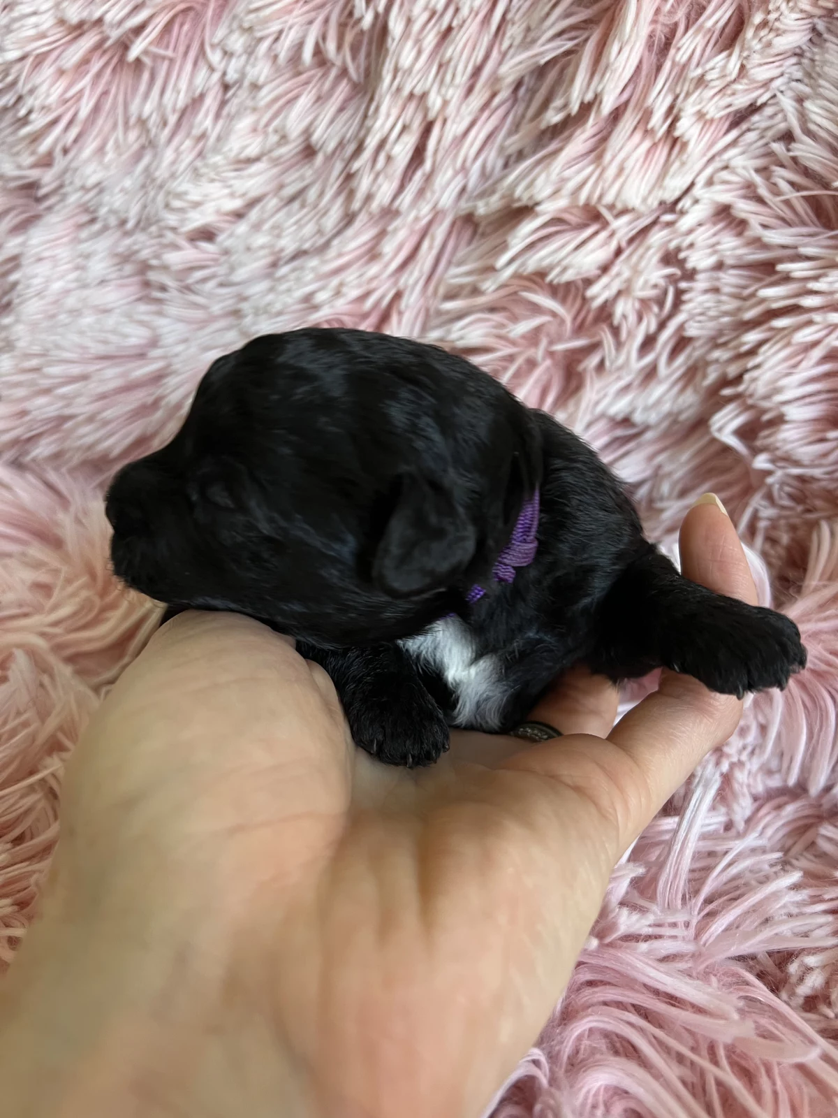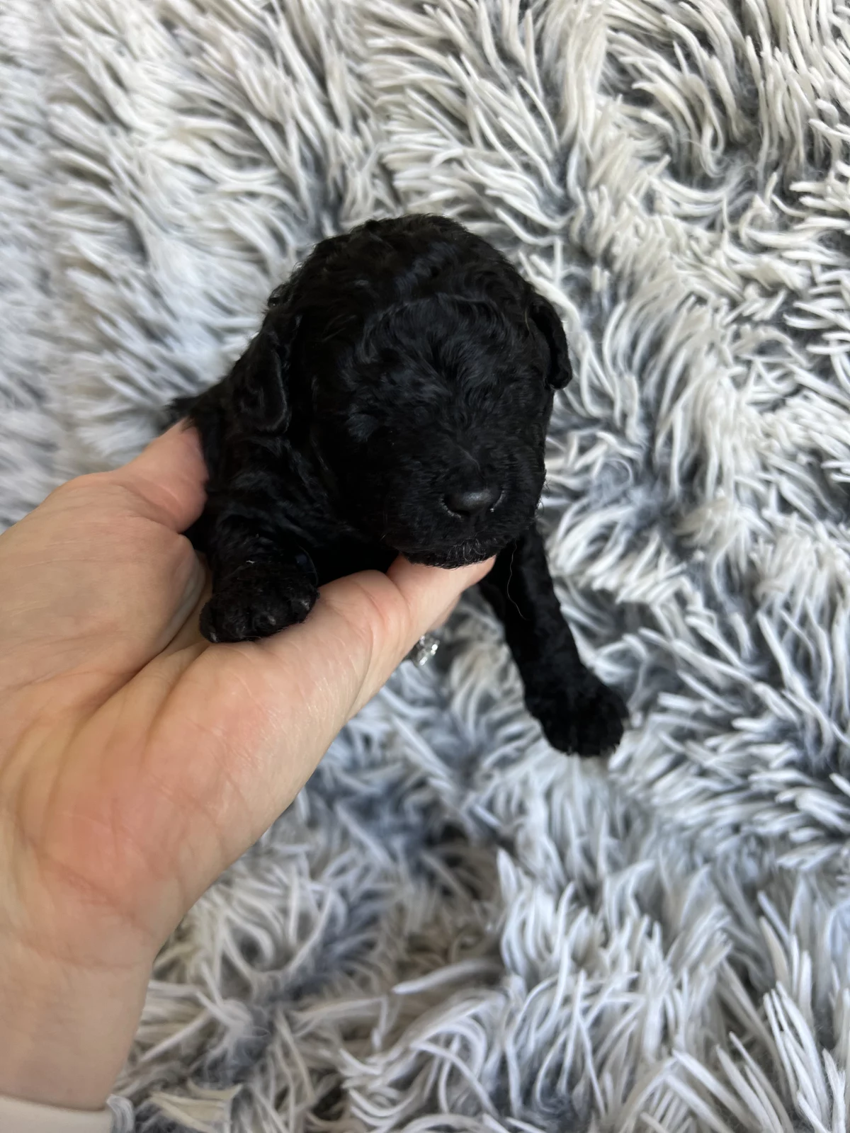 We have 6 adorable Mini Labradoodles available, consisting of 3 girls and 3 boys. The litter includes 4 black, 1 golden, and 1 white puppy.