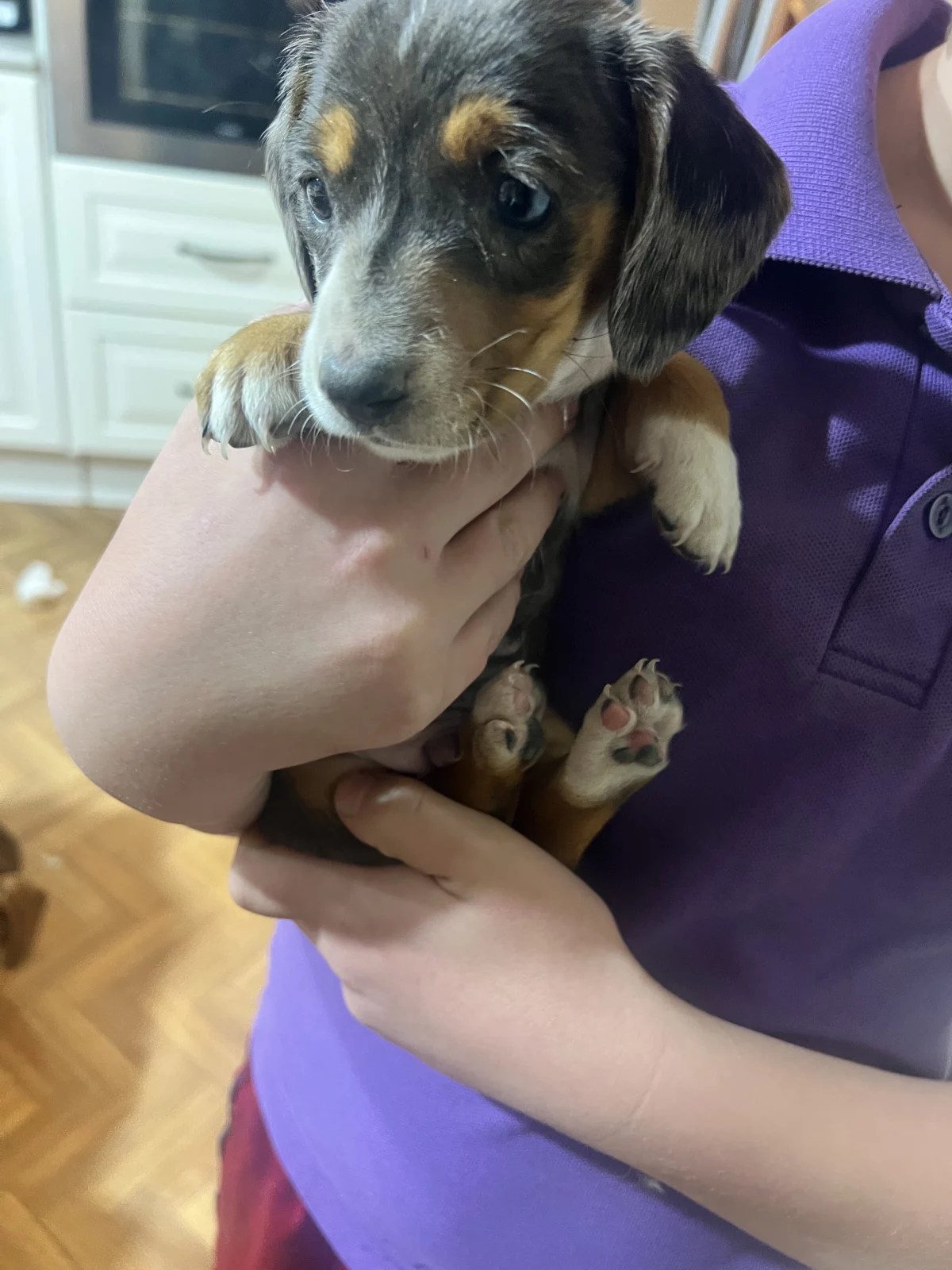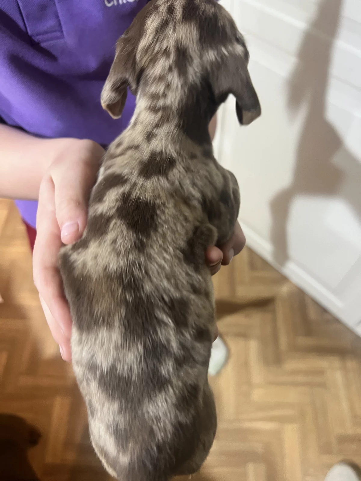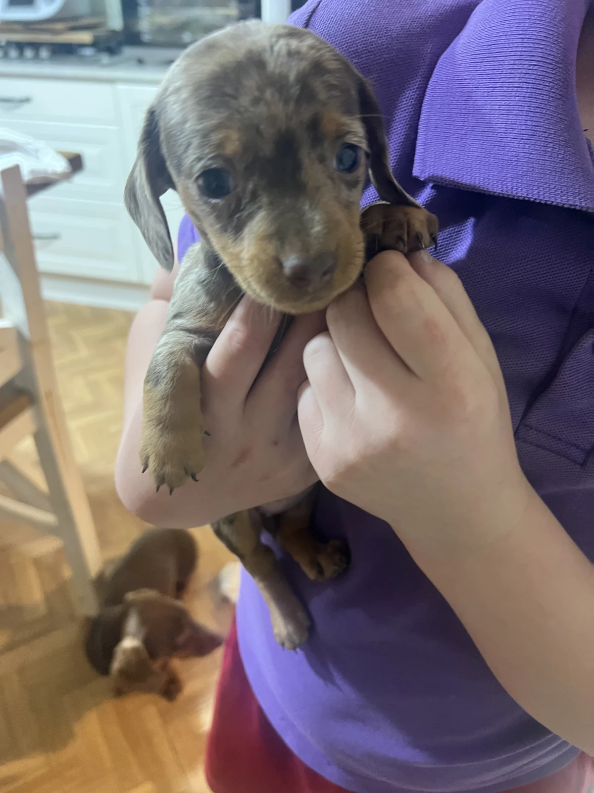 Three beautiful dapple miniature dachshunds looking for their forever homes. Raised with children and other animals. Both parents are available to view and live with the pups. Parents are DNA tested and cleared.